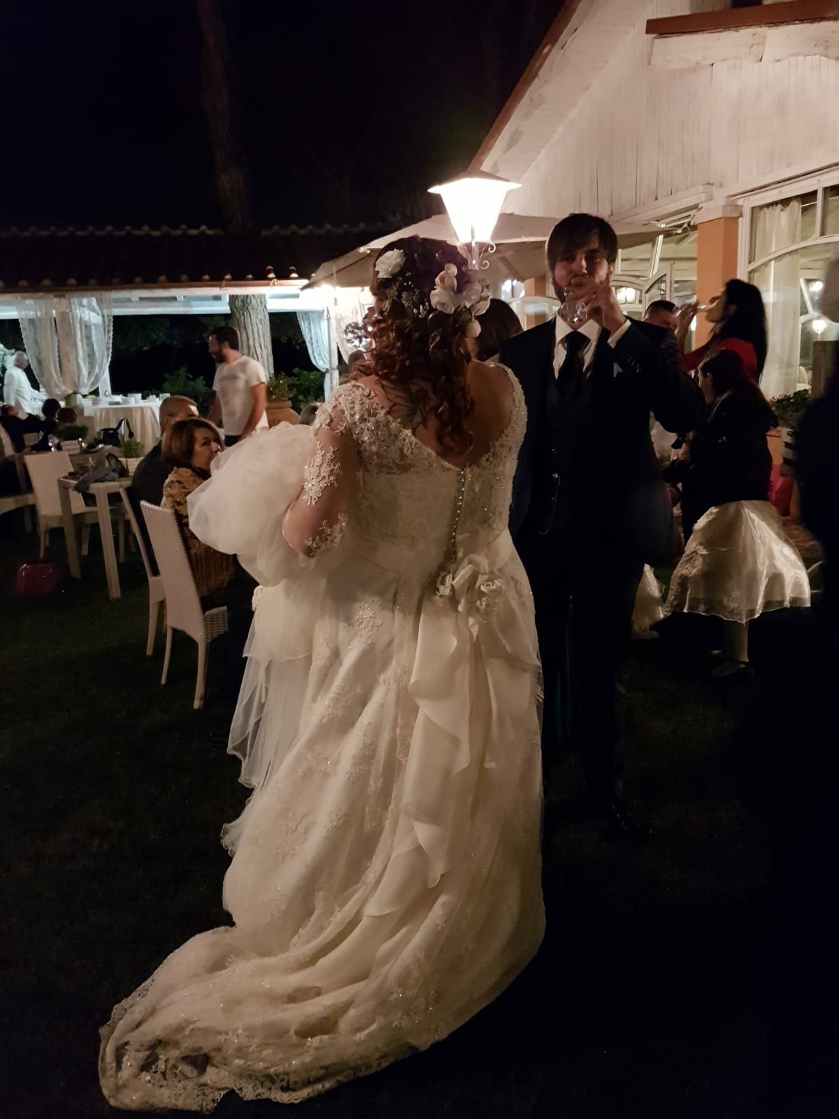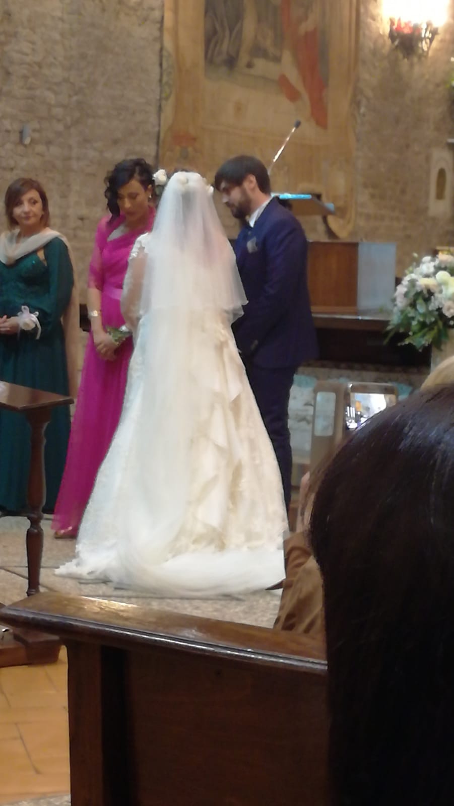 Bellissimo abito di Elvira Gramano modello Cenerentola leggermente modificato. Interamente in pizzo francese. Ampiamente modificabile e adattabile alle diverse taglie, utile anche per essere smontato e utilizzato per altri abiti essendo costituito da intere pezze di pizzo. Comprensivo di velo lungo e porta fedi.