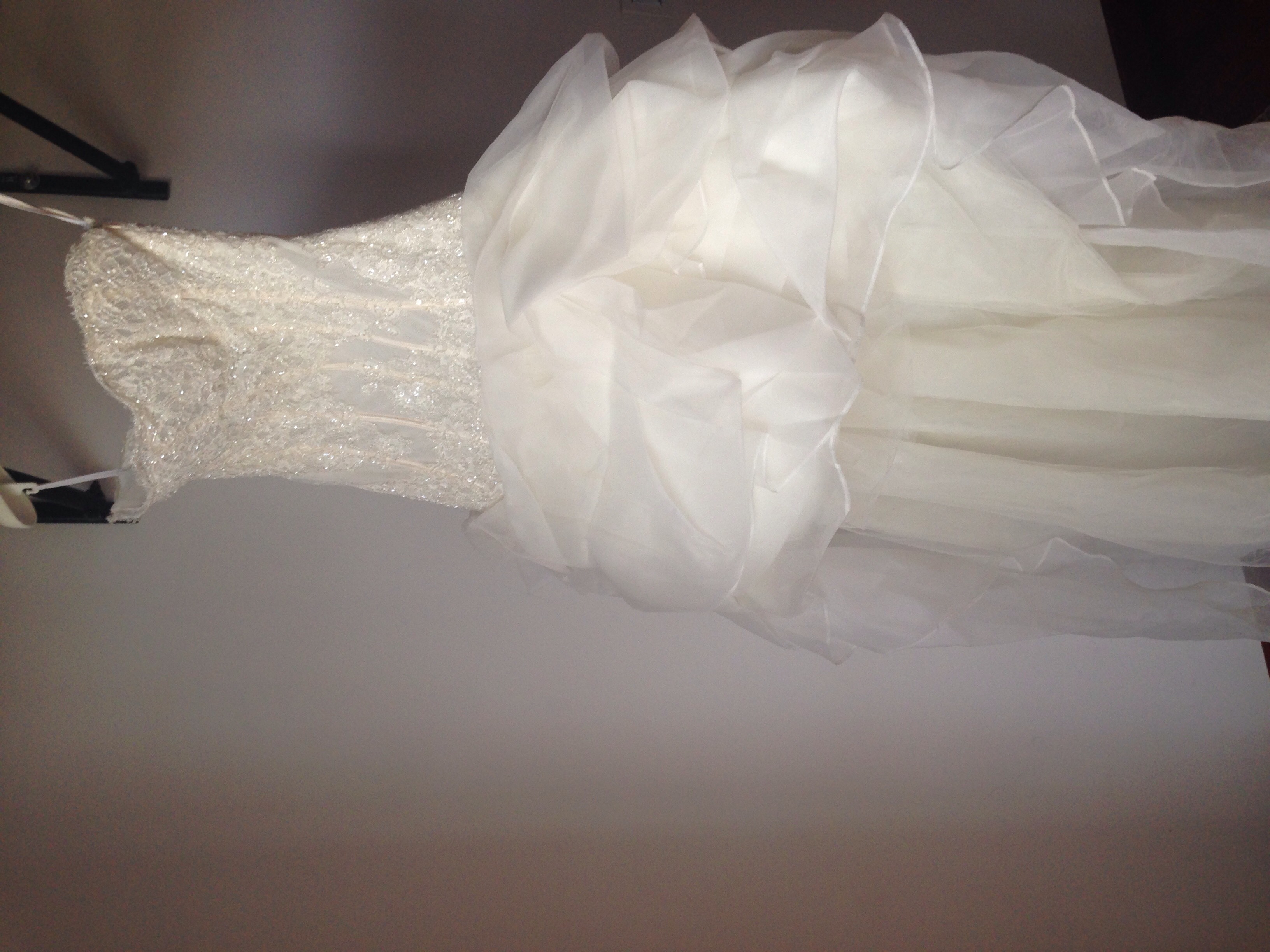 L’abito è formato da un primo pezzo a mezza sirena con corpino in pizzo ricamato con perline, tenuto semi-rigido da stecche di balena, che arriva ad altezza inguine per poi aprirsi con vaporosa gonna in organza madreperlata, lunghezza sopra il ginocchio nella parte davanti con strascico lungo dietro.