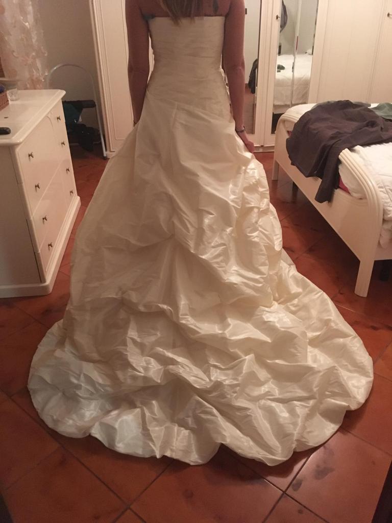 Abito da sposa usato ma lavato in lavanderia la settimana dopo il matrimonio. Abito in perfette condizioni. Veste una taglia 42. Il corpetto è leggermente rigido ma molto comodo. Tessuto in taffetta di seta.
