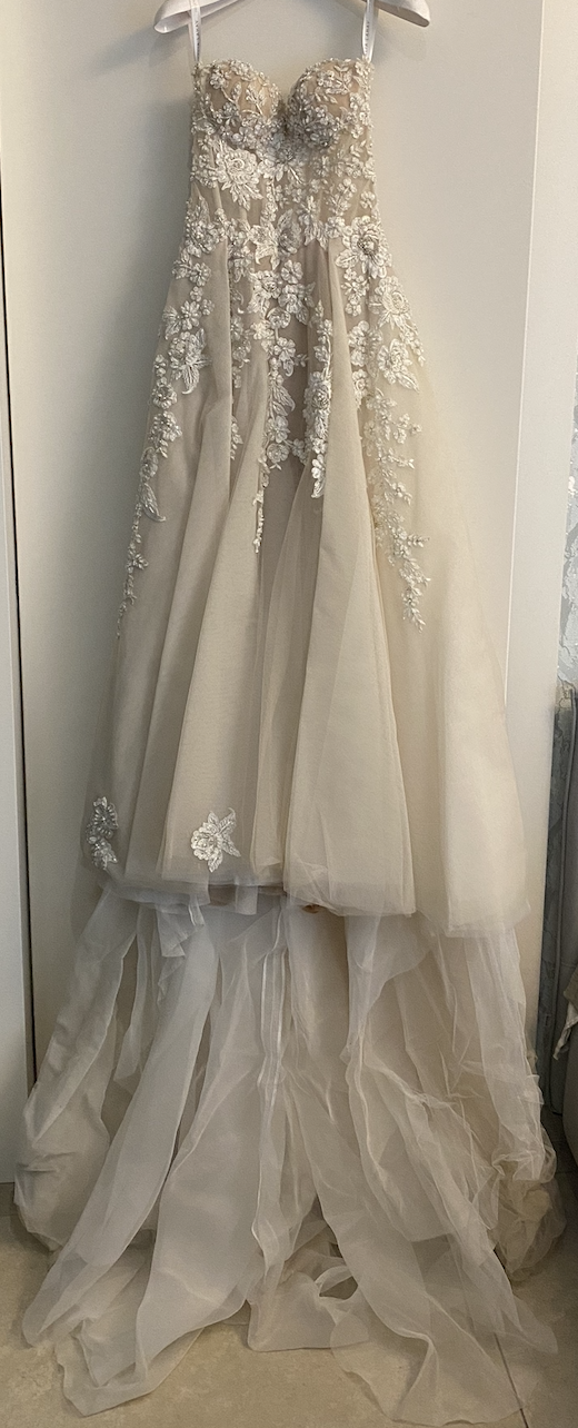 Indossato solo per il mio matrimonio alcune ore, non si é sporcato minimamente durante la giornata, portato comunque in lavanderia, non ha subito alcuna alterazione o danneggiamento.