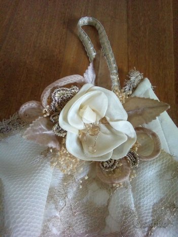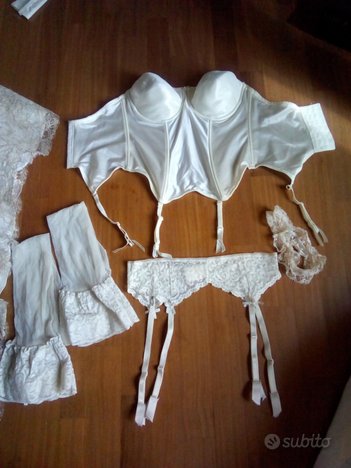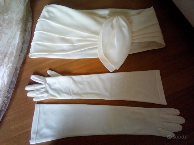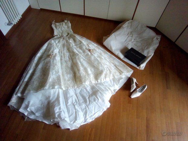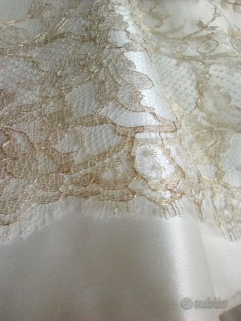 Abito da sposa della stilista GiovannaSpose, misura adattabile dalla 38 alla 44 poiché composto da corpetto regolabile allacciato sul retro e gonna con moderato strascico. In taffetà bianco perla, con sottogonna in organza, rifinito in pizzo macramè ecrù e oro e con graziosi motivi di roselline applicate (incluse due ulteriori di riserva). Le spalline si possono facilmente scucire se lo si preferisce senza. Completo di stola, guanti, scarpe in vero cuoio marca Luca Renzi n°36 e 1/2 con la loro scatola, lingerie (corsetto, reggicalze, giarrettiera, due paia di autoreggenti). Si consegna nella sua custodia protettiva di tela.