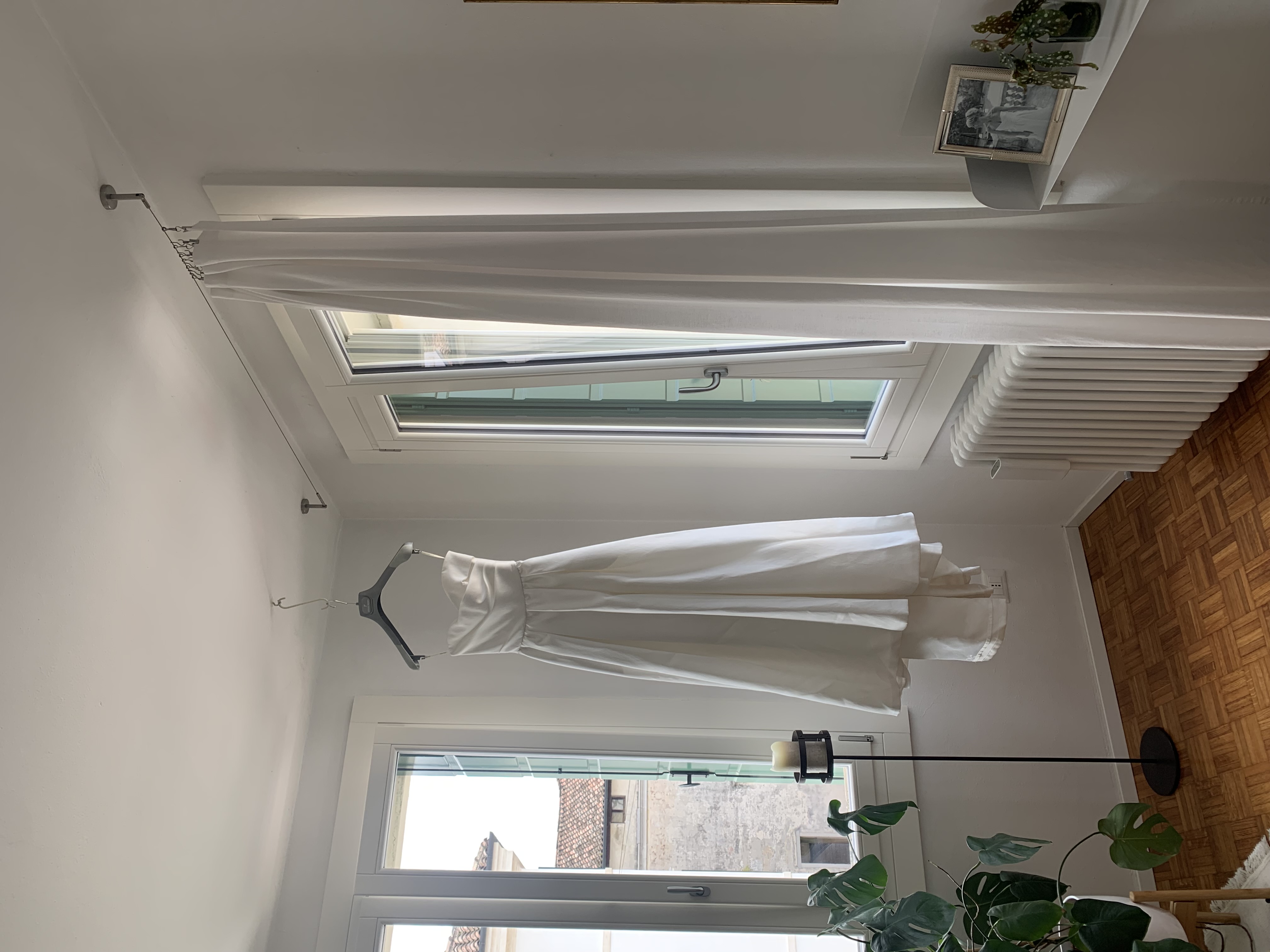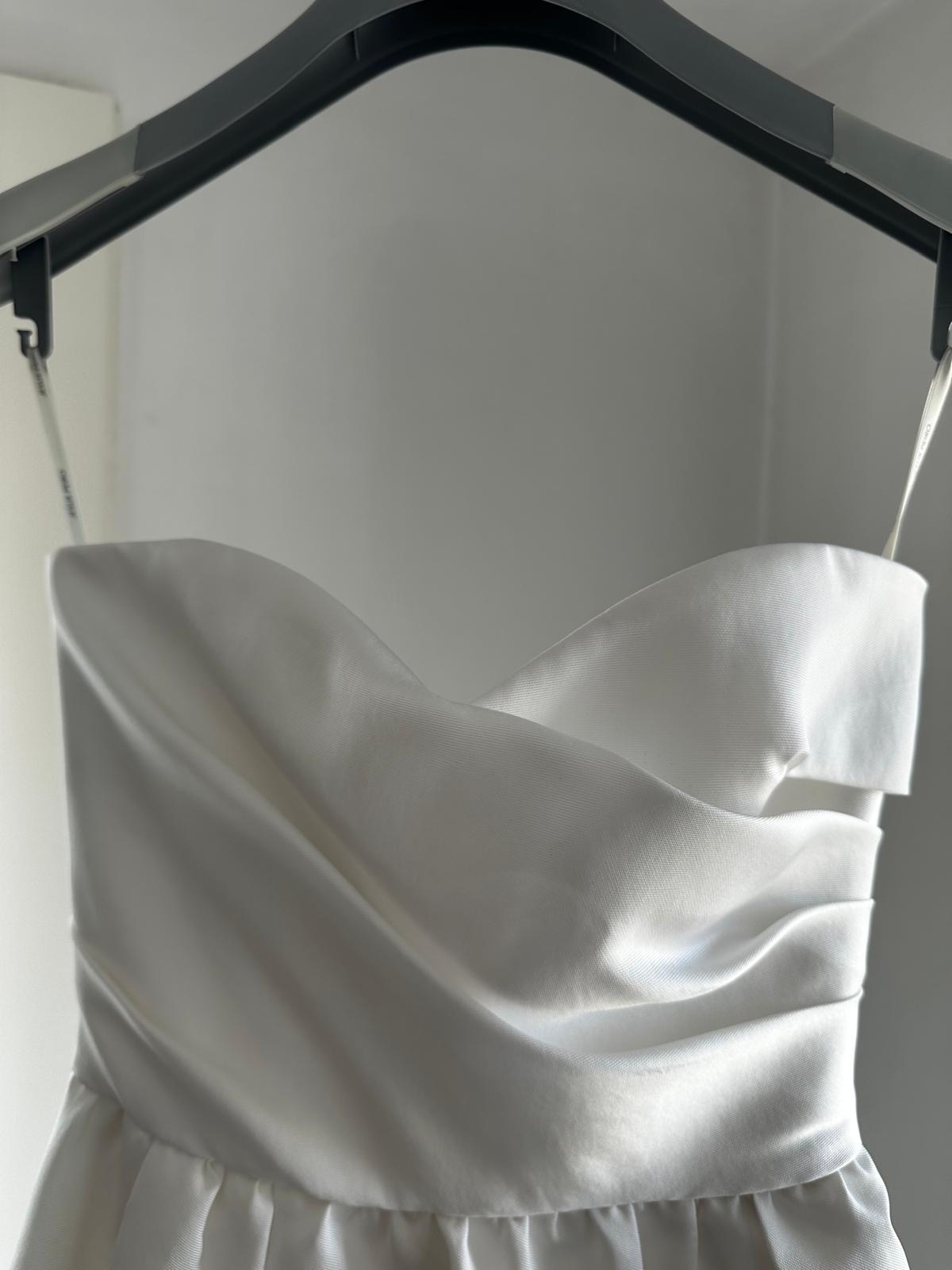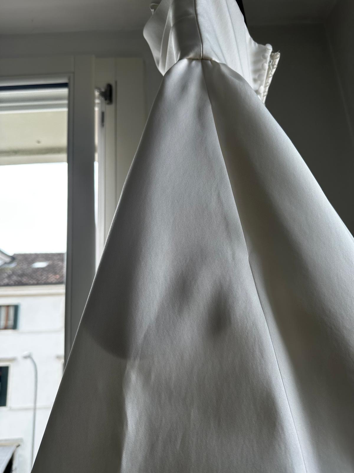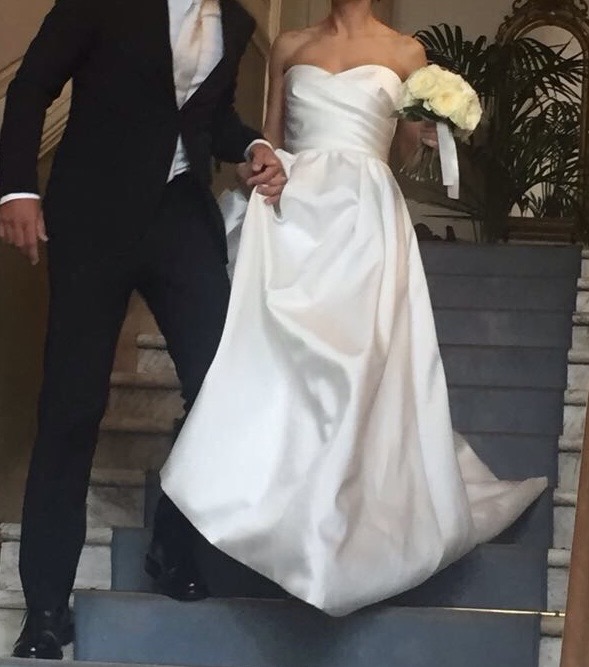 Abito sartoriale Jesus Peiro del 2017 in pregiato tessuto mikado di seta. Modello principessa con scollo a cuore. Gonna con tasche. Piccolo strascico sul retro. Ottimo per una fisicità minuta. Altezza 1.65 da indossare con tacco. Taglia reggiseno seconda.