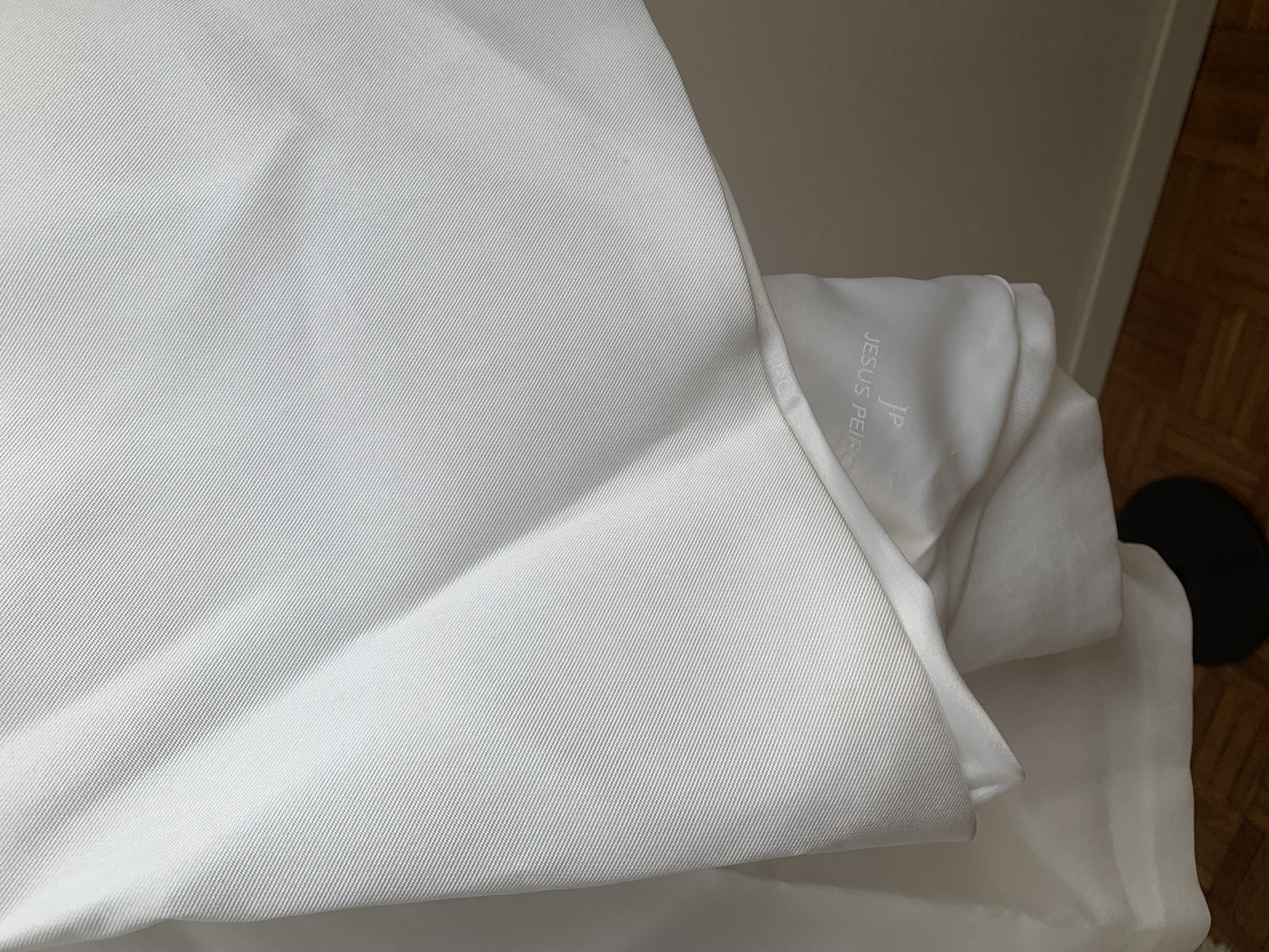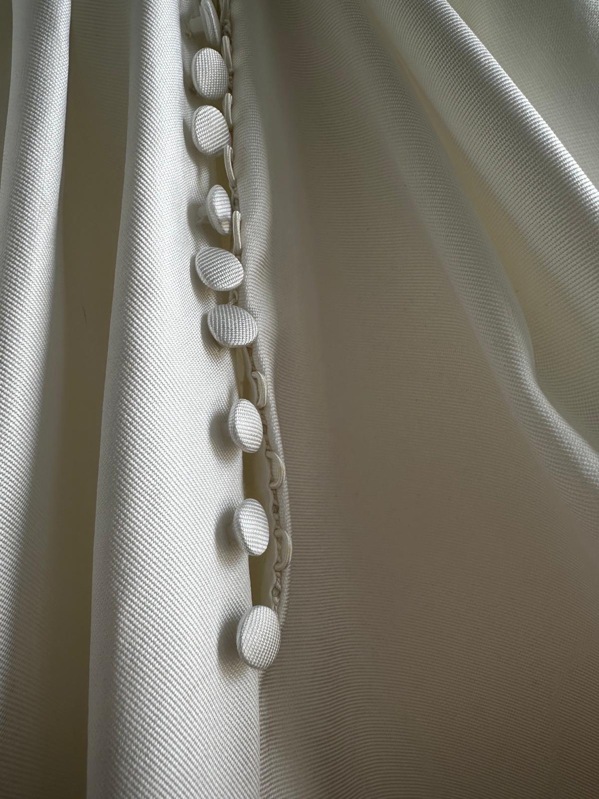 Il tessuto è perfetto. Nessun danno e macchia sia nel tessuto esterno che rifiniture interne come da foto. Chiusura con zip mascherata da bottoncini lungo tutto il corpetto e a scendere un po’ sulla gonna. Unico pezzo (corpetto cucito alla gonna)