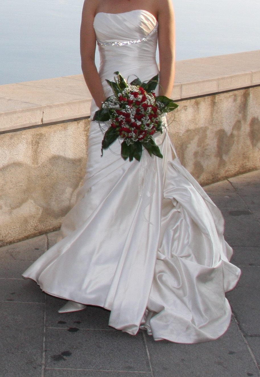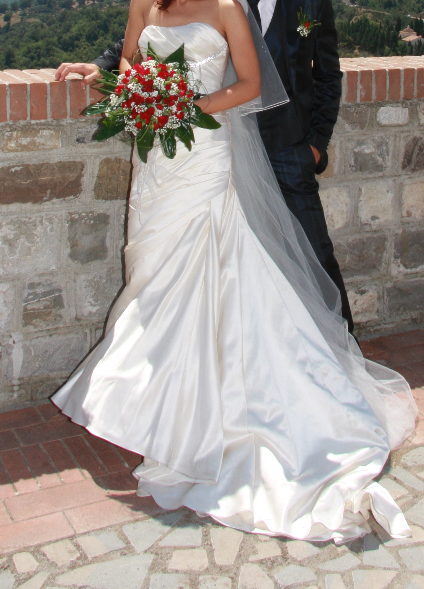 Elegantissimo abito da sposa sul quale è stato applicata una striscia di strass sotto al seno rendendolo sirena stile impero.