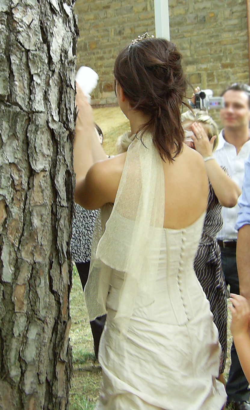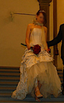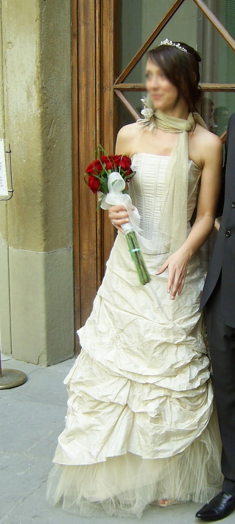 Abito Linea Raffaelli in shantung di seta e tulle collezione 2007-2008, in due pezzi : bustino con stecche a scollo aperto, liscio semplice senza applicazione e bottoni foderati sul retro (possibilità di applicare swarosky presso un atelier); gonna con piccolo strascico effetto increspato con sottogonna vaporoso in tulle e applicazione floreale, giovanile e anticonvenzionale pur rimanendo estremamente elegante e classico, color avorio.