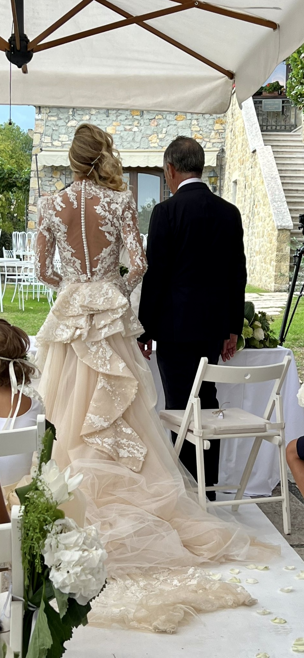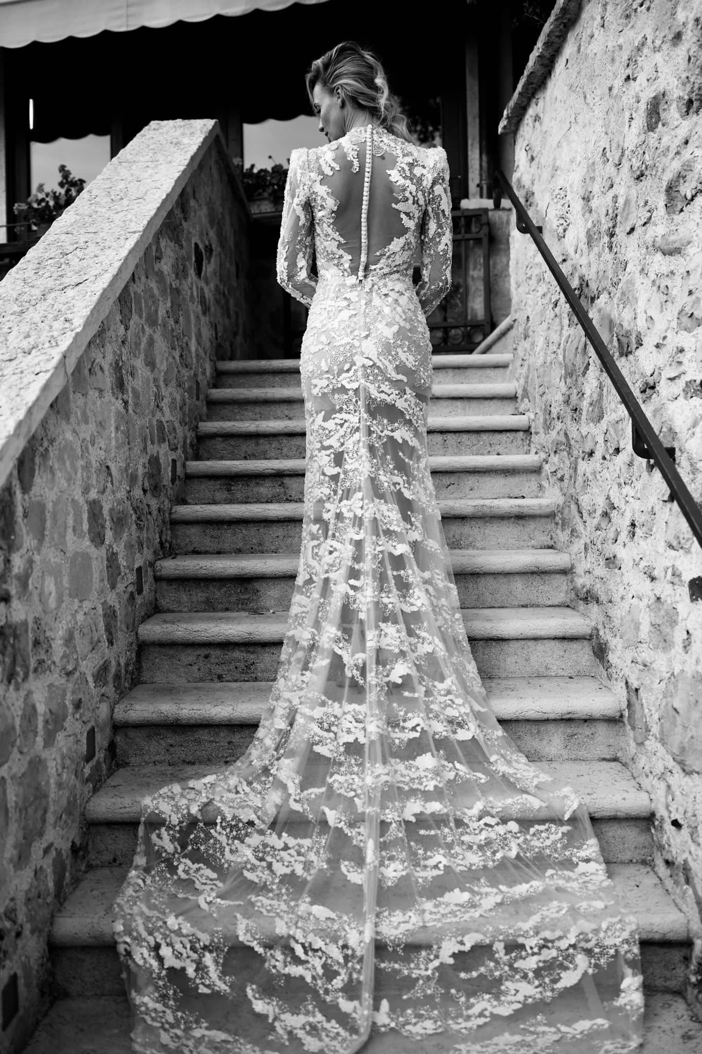 Stravagante abito da sposa semitrasparente con applicazioni in pizzo e spacco sulla coscia. Presenta fodera beige, scollo profondo, maniche lunghe e un lungo strascico. Completato da una sopragonna staccabile in tulle arricciato.