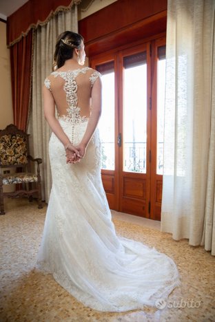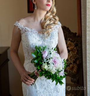 Vendo abito da sposa usato e ORIGINALE marca Morilee, linea AF Couture, modello “Sirena Morbida” modello 2019 in pizzo francese e veneziano, taglia 42, colore avorio, profondo scollo a V smerlato e orlo smerlato, taglio a sirena, scollo spalle scoperte e scollatura seno moderata. Vendo l’abito completo di velo corto con swarovski, sottogonna 2 ricci e spilloni. Parlano da sole le fotografie allegate. Sono alta 170 cm, taglia seconda di seno, corporatura magra. Abito modificabile e adattabile alle esigenze. mail francesco.bernotti88@libero.it. Tel. 3669149824