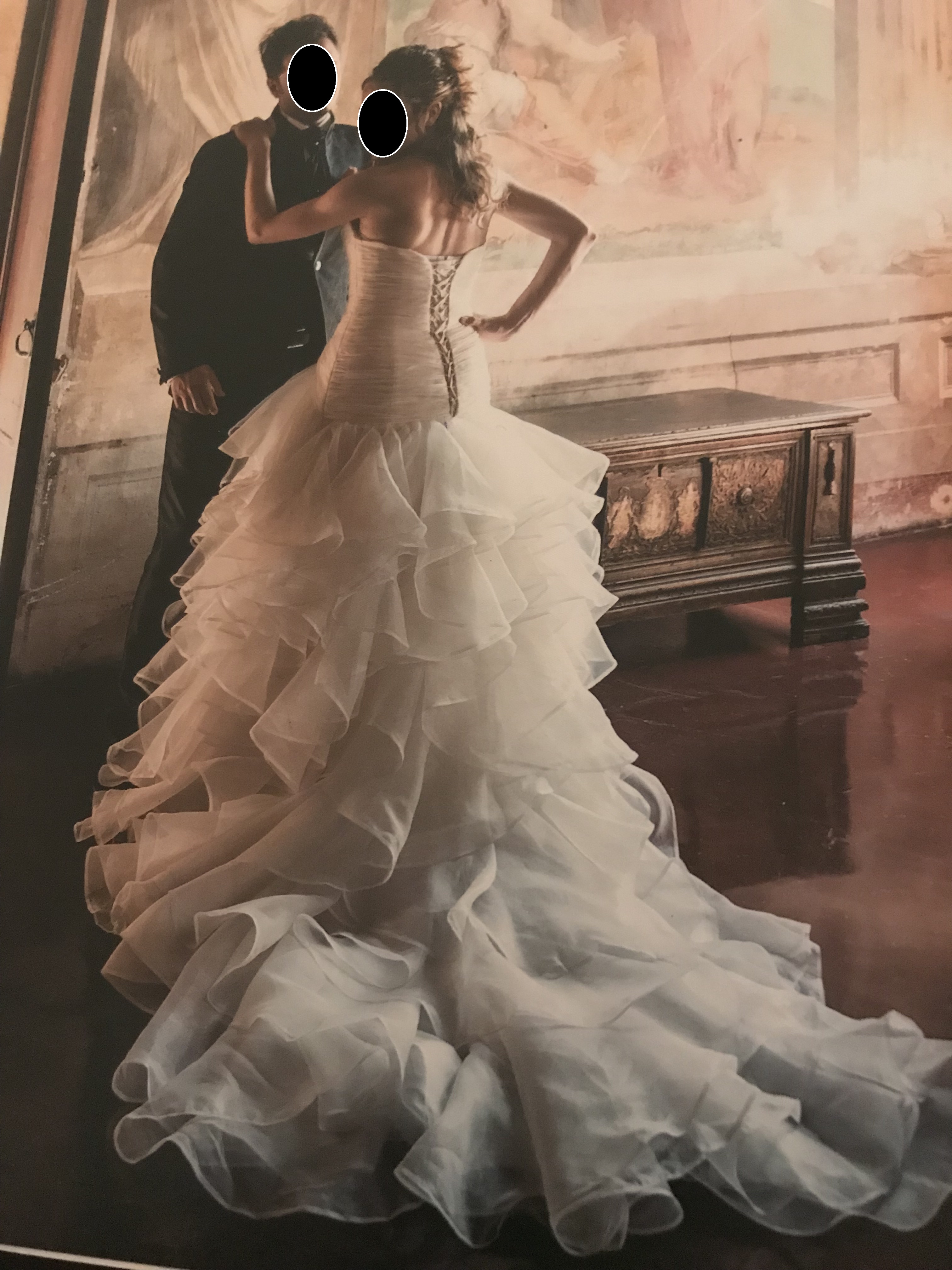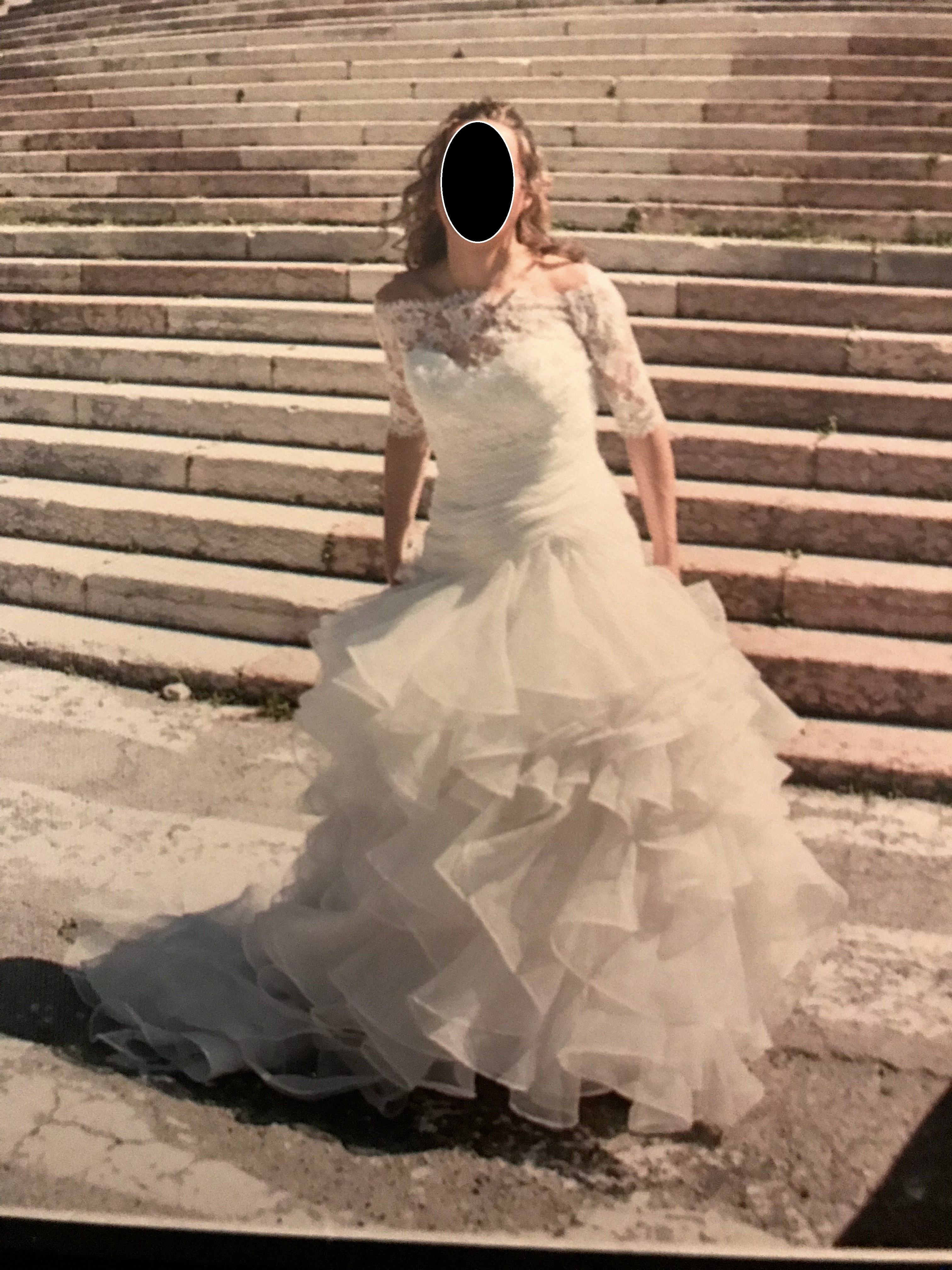 Vestito stile principessa in organza acquistato a giugno 2018, appena ritirato dalla tintoria e conservato con cura. Ho dovuto fare accorciare la sottoveste di circa 10 cm davanti per adattarlo alla mia altezza 163cm+tacco 9cm; il vestito tuttavia non è stato tagliato, per cui è possibile ripristinare la lunghezza originaria disfando l’orlo. Il bustino ha la scollatura a cuore e chiusura sul retro a bustier, si inserisce sulla gonna in modo obbliquo sul davanti e ciò snellisce il punto vita. La gonna è leggera da portare ed ha uno strascico di circa 2 metri. In abbinato ha in dotazione una stola in organza e una stola in tulle comprese nel prezzo.