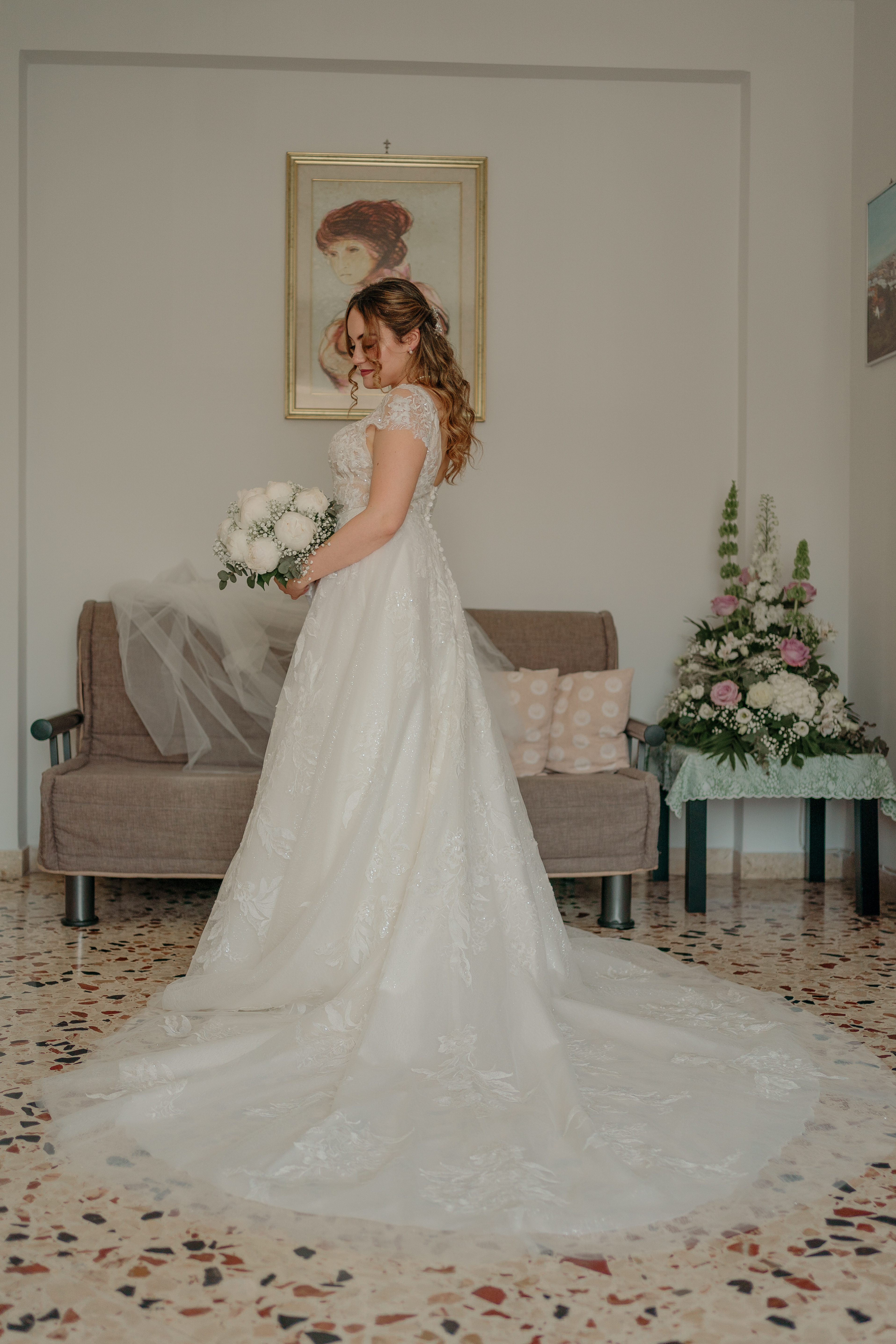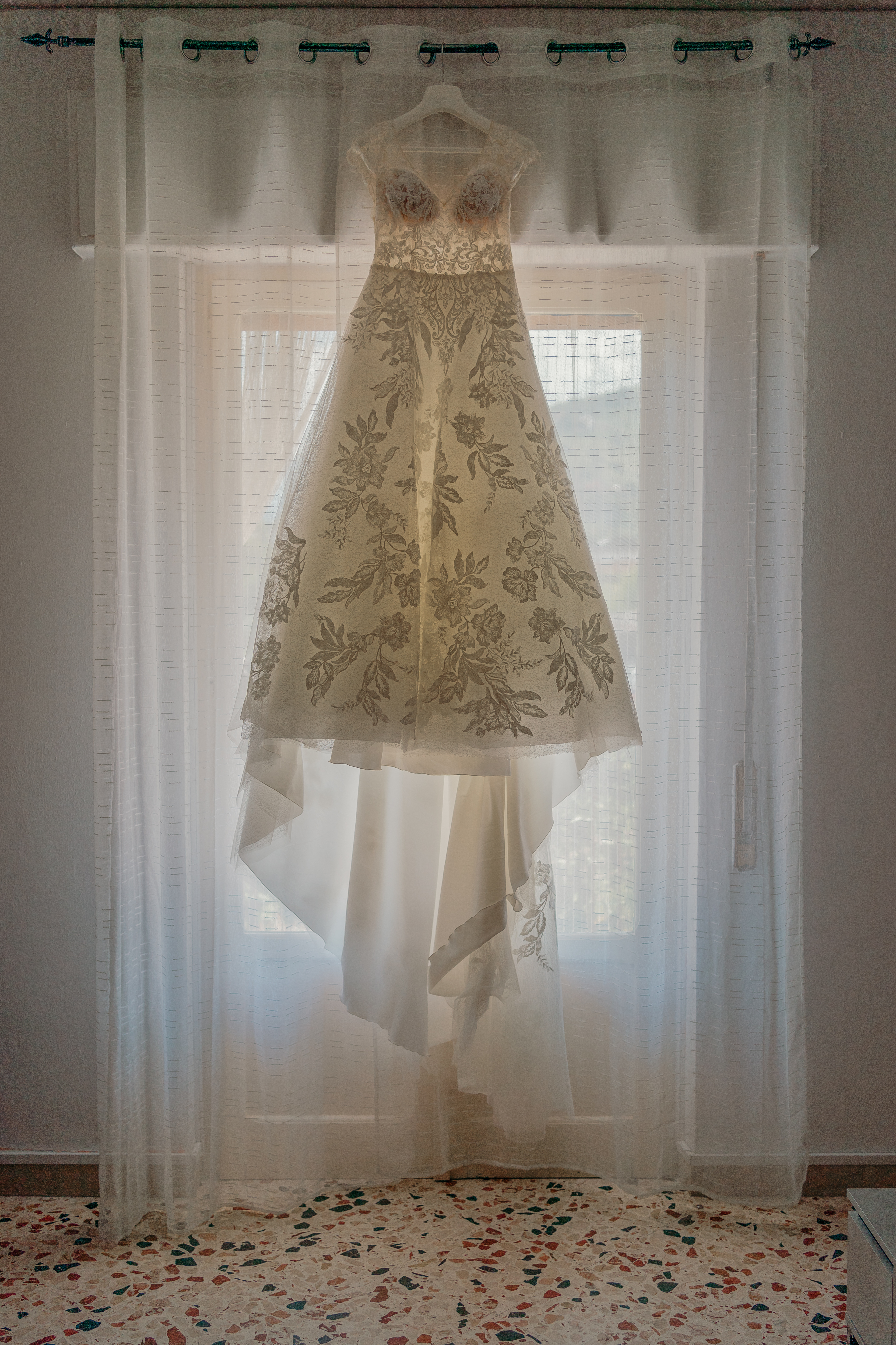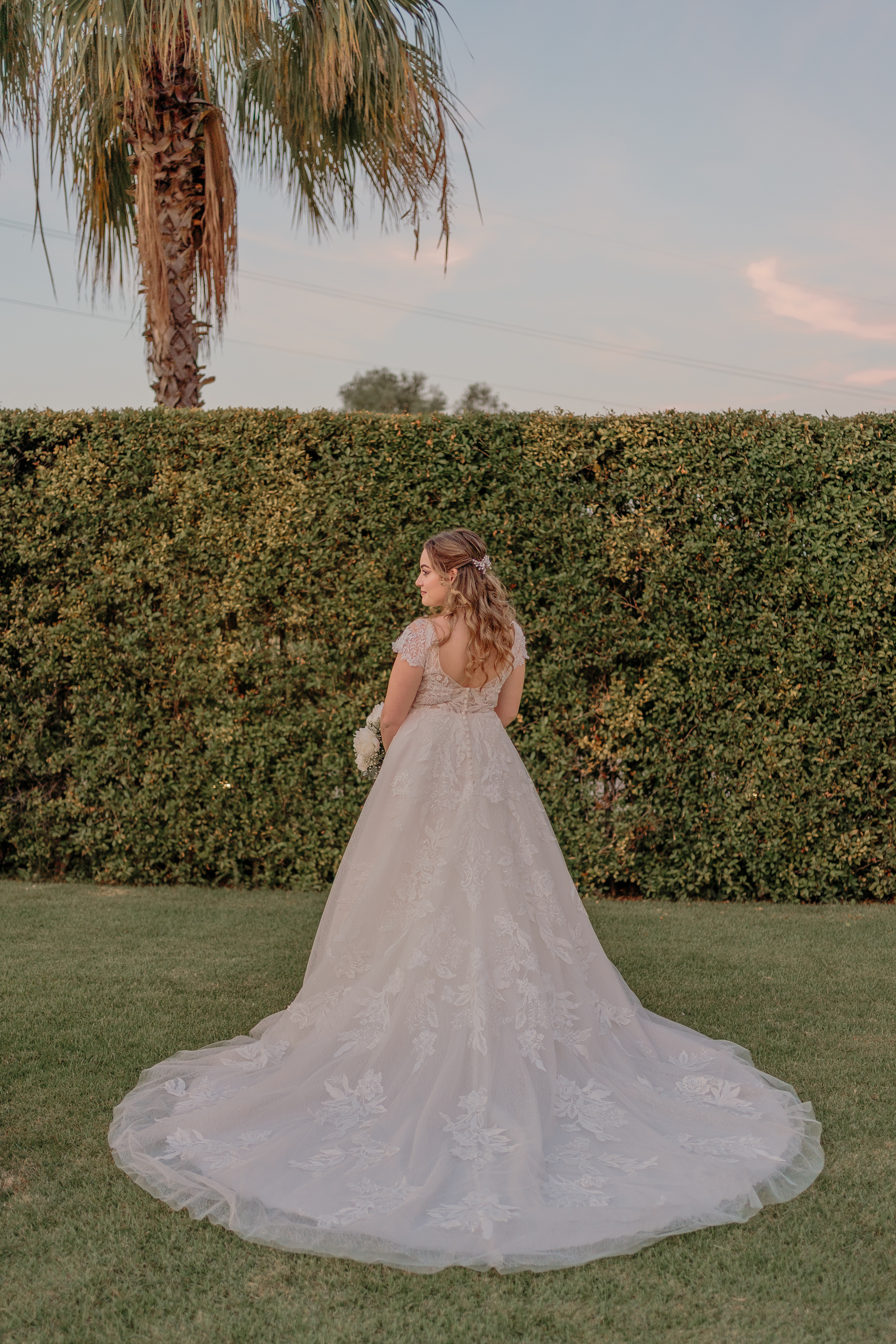 L’abito presenta un corpetto in pizzo floreale con scollo a V e maniche aggiunte, gonna ampia e fluida con strascico.
