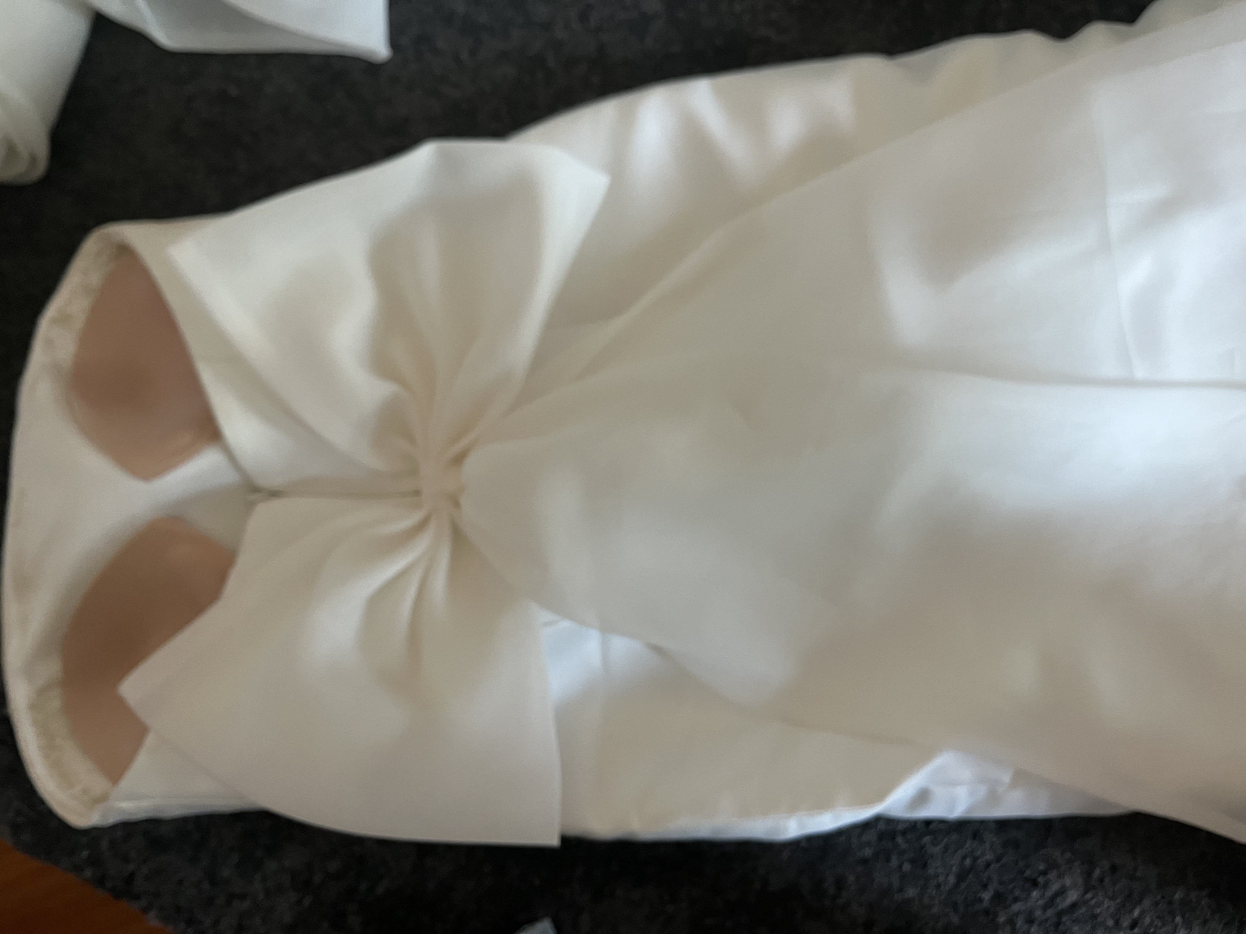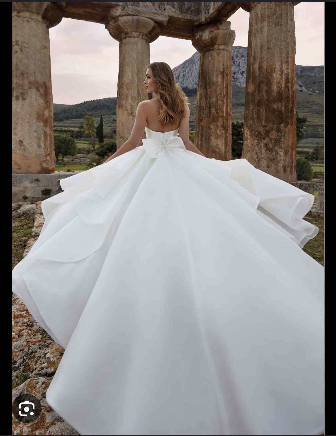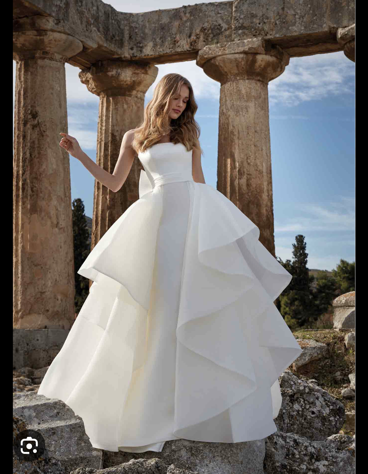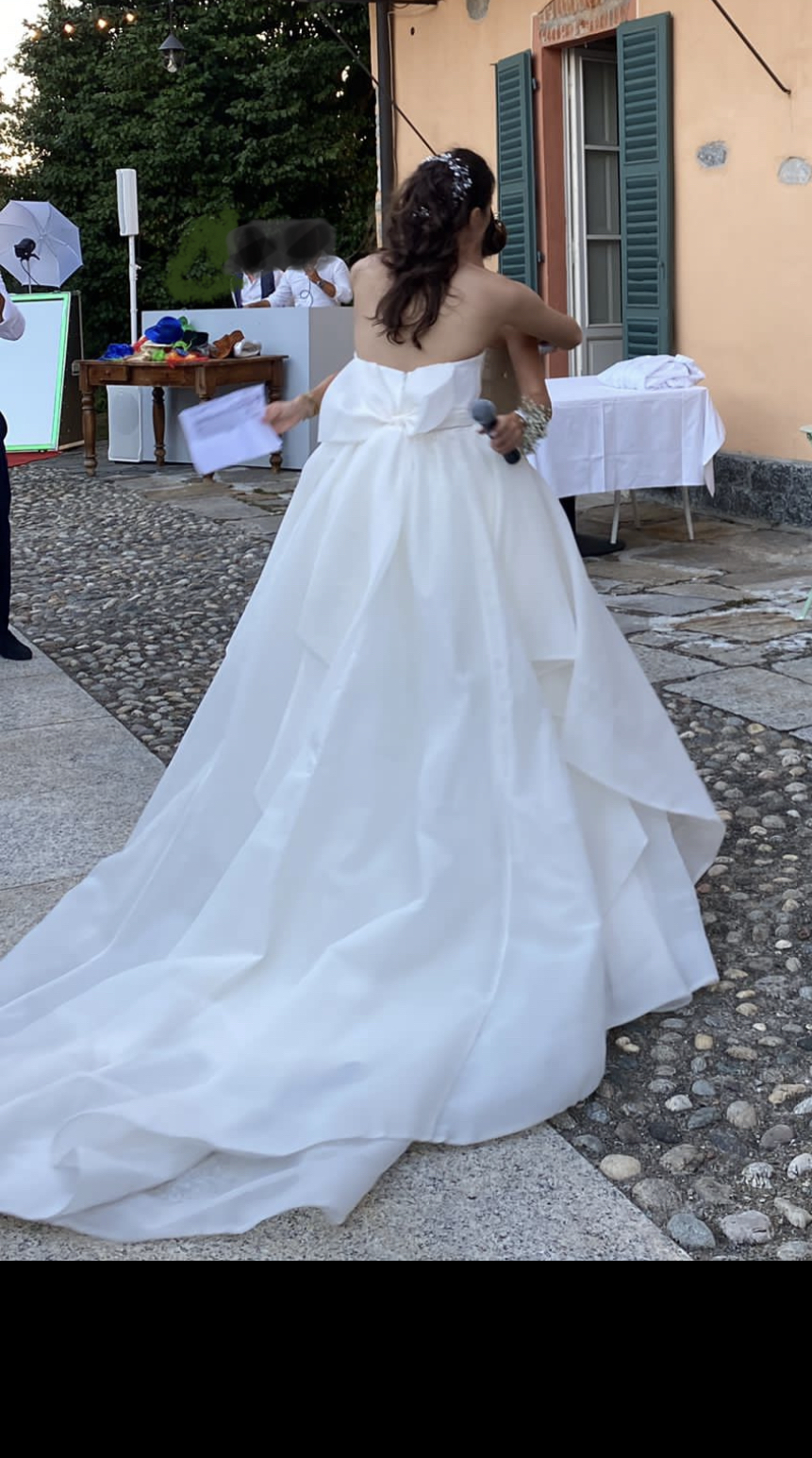 Si tratta di un abito in mikado a sirena molto Morbido al quale viene fissata con dei gancetti una sovragonna molto morbida e voluminosa. La sovragonna è facile da togliere ed ideale per un rapido cambio d’abito). Una volta rimossa la sovragonna sull abito resta un fiocco posteriore molto ampio puntato solo a destra (visibile sia con la gonna che senza). Per evitare che il fiocco si piegasse su se stesso è stato fatto aggiungere un automatico sulla parte sinistra. Completano l’abito il velo e un copri spalle in tulle che è stato fatto aggiungere e che può essere facilmente attaccabile o removibile grazie a due bottoni automatici.