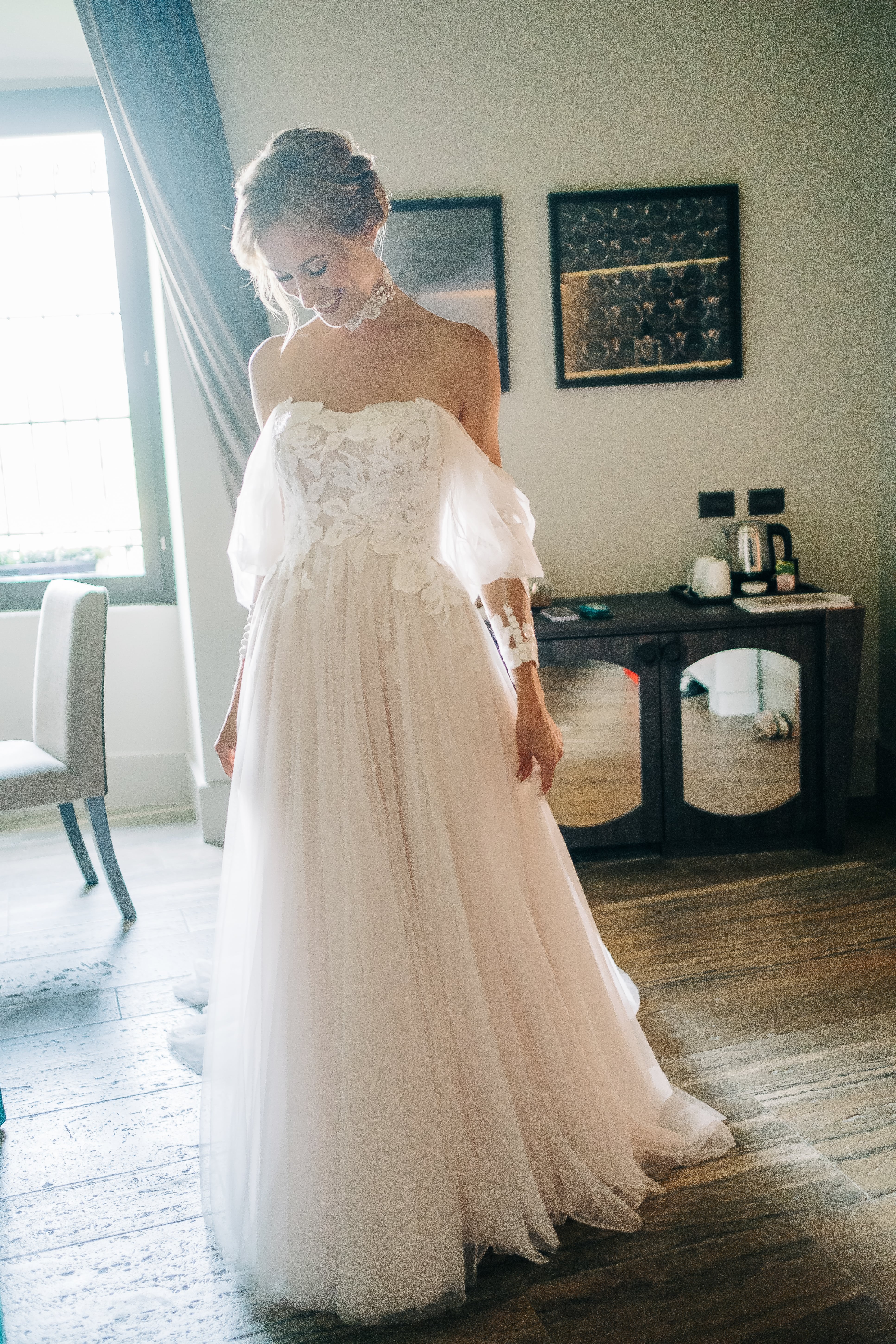 Incantevole MANDEVILLA, Abito da Sposa Nicole, dalla linea ad A in tulle rosa antico e corpino smanicato con scollatura a goccia ricamato con un motivo floreale macro. Completano il look raffinate maniche di tulle off shoulder con polsini di pizzo.