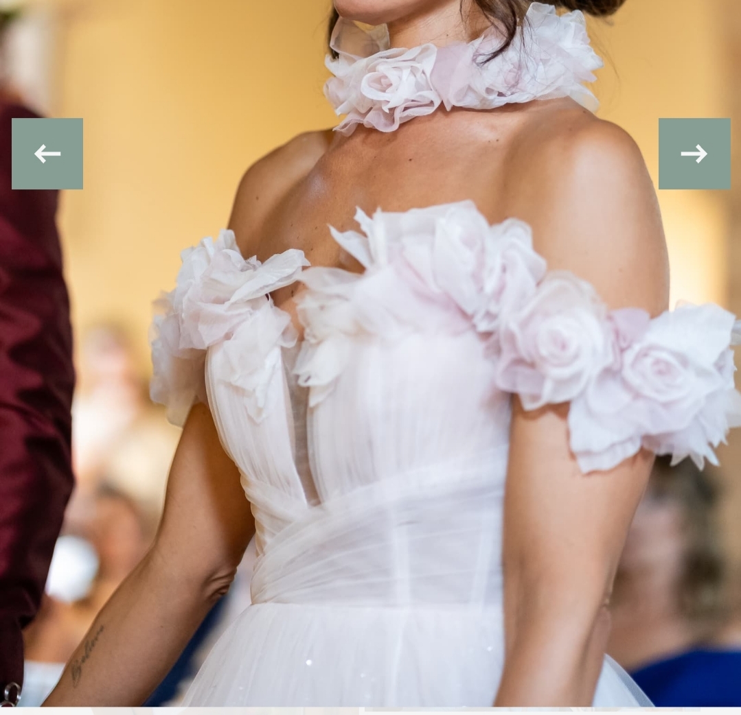 Meraviglioso abito audace e romantico in tulle pink con profonda scollatura a v e corpetto incrociato…la gonna è in tulle sempre Pink con una lunga coda e uno spacco sopra al ginocchio…ho fatto aggiungere dei glitter a Grana grossa che rendono l abito molto scintillante ma non guastano la sua delicatezza…il punto forte sono le spalline omerali con rose 3D sfumate bianche e rosa e il collarino abbinato ( io l ho usato per la cerimonia poi ho deciso di cambiare accessori)..