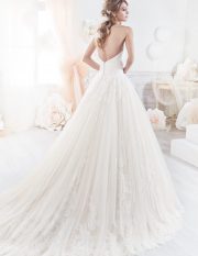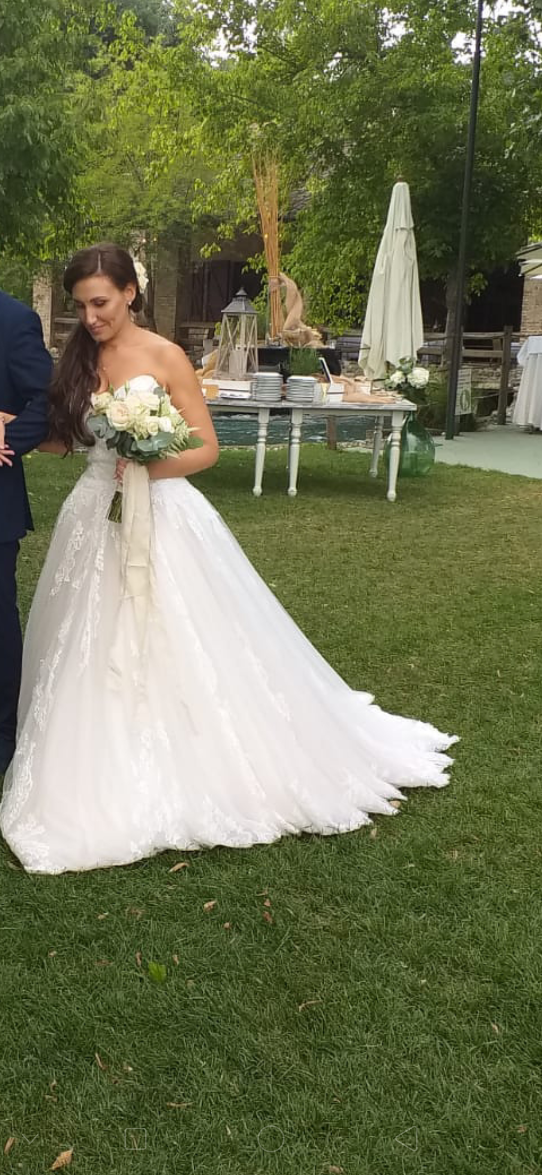Modello Colet della collezione 2018, acquistato nel 2019. Abito ampio, principesco con scollo a cuore in tulle con ricami in pizzo Chantilly e paillettes, di base bianca ma con tulle rosa cipria, ideale per chi, come me, ha un incarnato piuttosto chiaro, e potrebbe risultare “sbattuta” con un abito bianco ottico.
