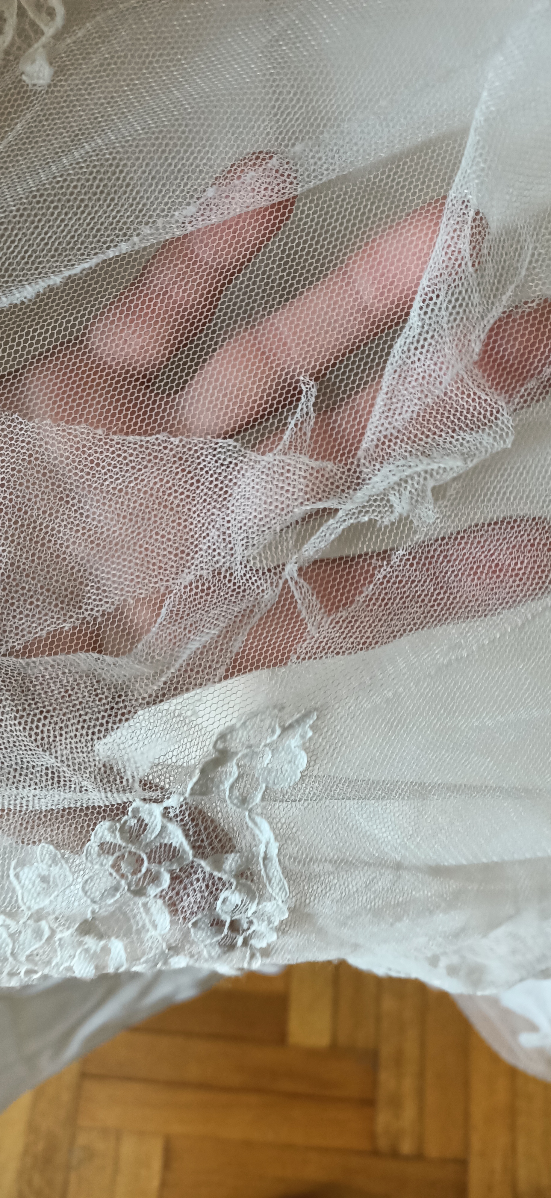 Purtroppo il giorno in cui ci siamo sposati, siamo andati a fare le foto in mezzo ad un bosco e sono rimasta incastrata con l’abito in un ramo, ed il tulle si è strappato su un lato della gonna (allego foto del dettaglio). Parlandone con la mia sarta, mi ha confermato che si può tranquillamente coprire con un pizzo chantilly come le applicazioni sulla gonna.