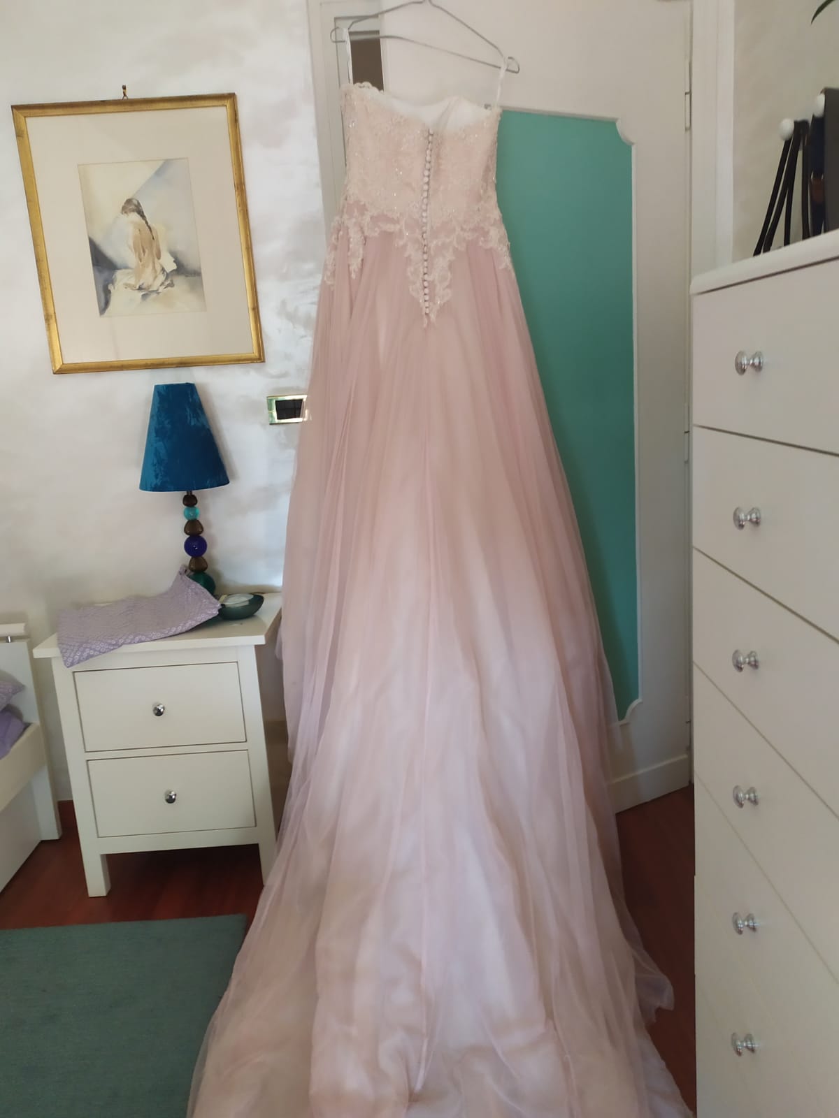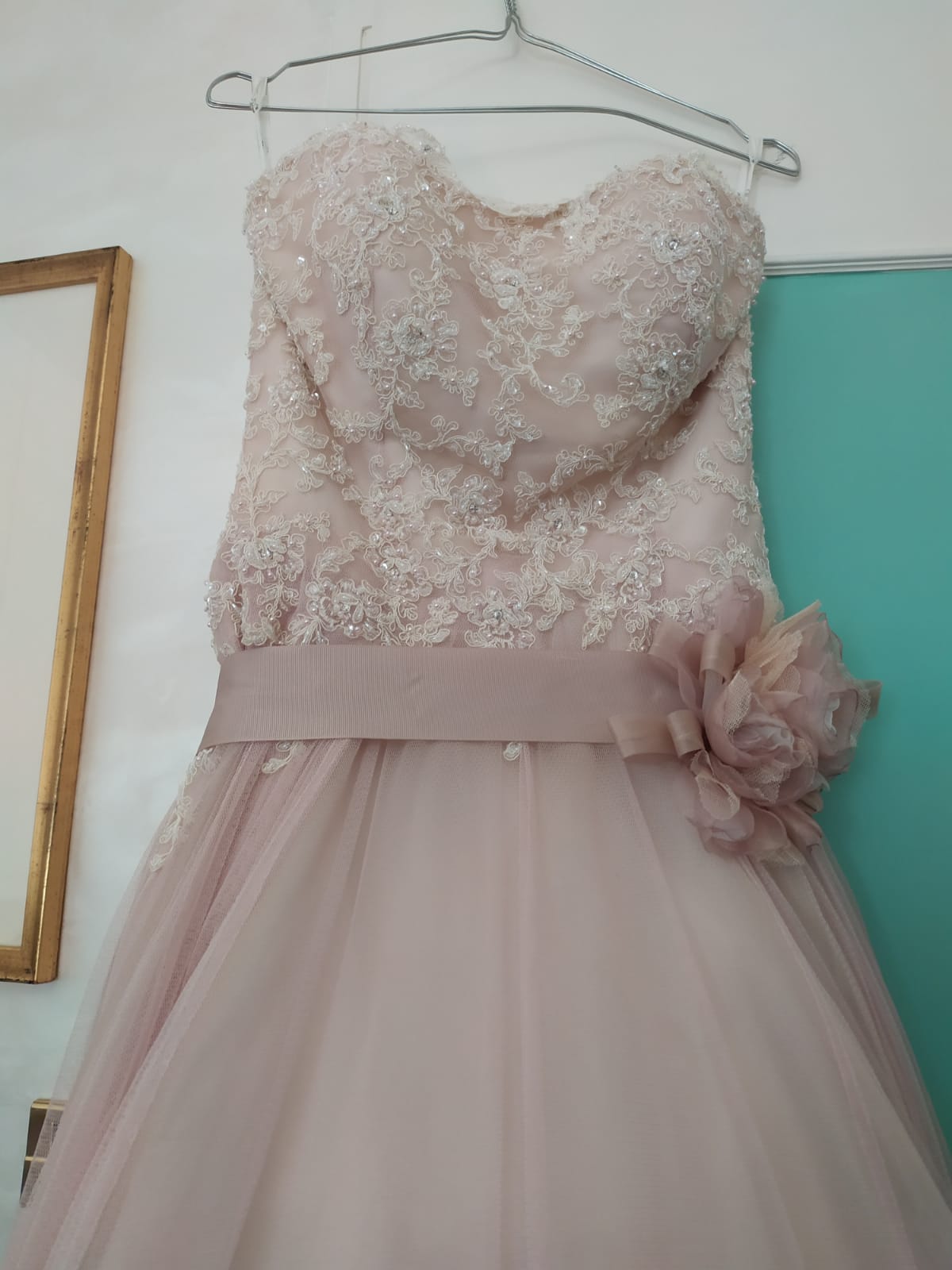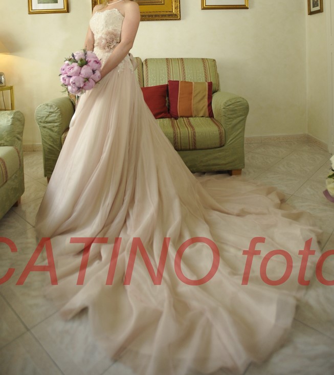 corpetto in pizzo e perline; la parte inferiore in chiffon. inclusa sottogonna, con possibilità di toglierla. velo in seta incluso.