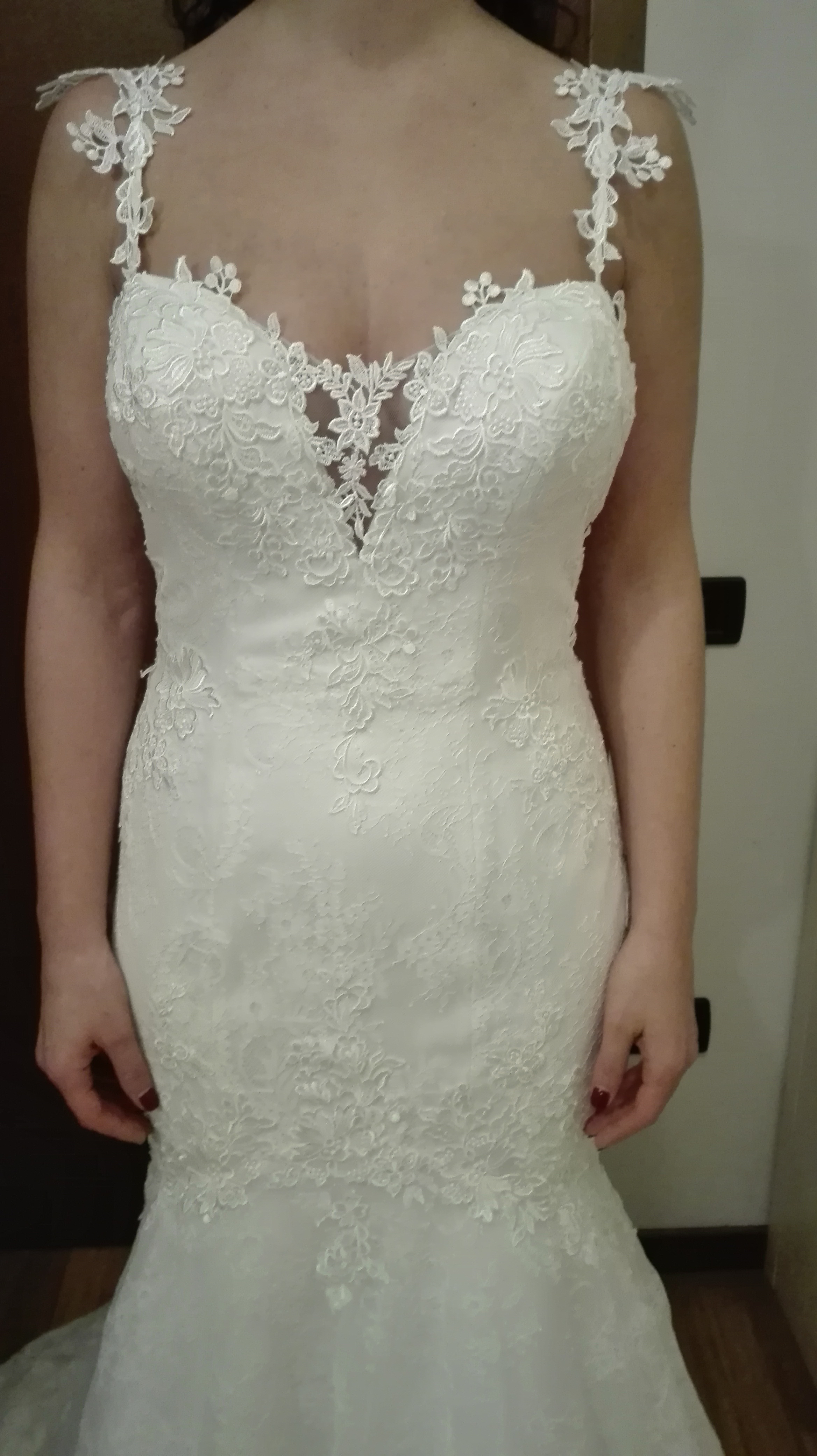 Abito da sposa a sirena firmato Nicole Spose mod. NIAB16122 in pizzo bianco candido, raffinato e sensuale, taglia 44 circa (fatto su misura), usato mezza giornata a Settembre 2016.
