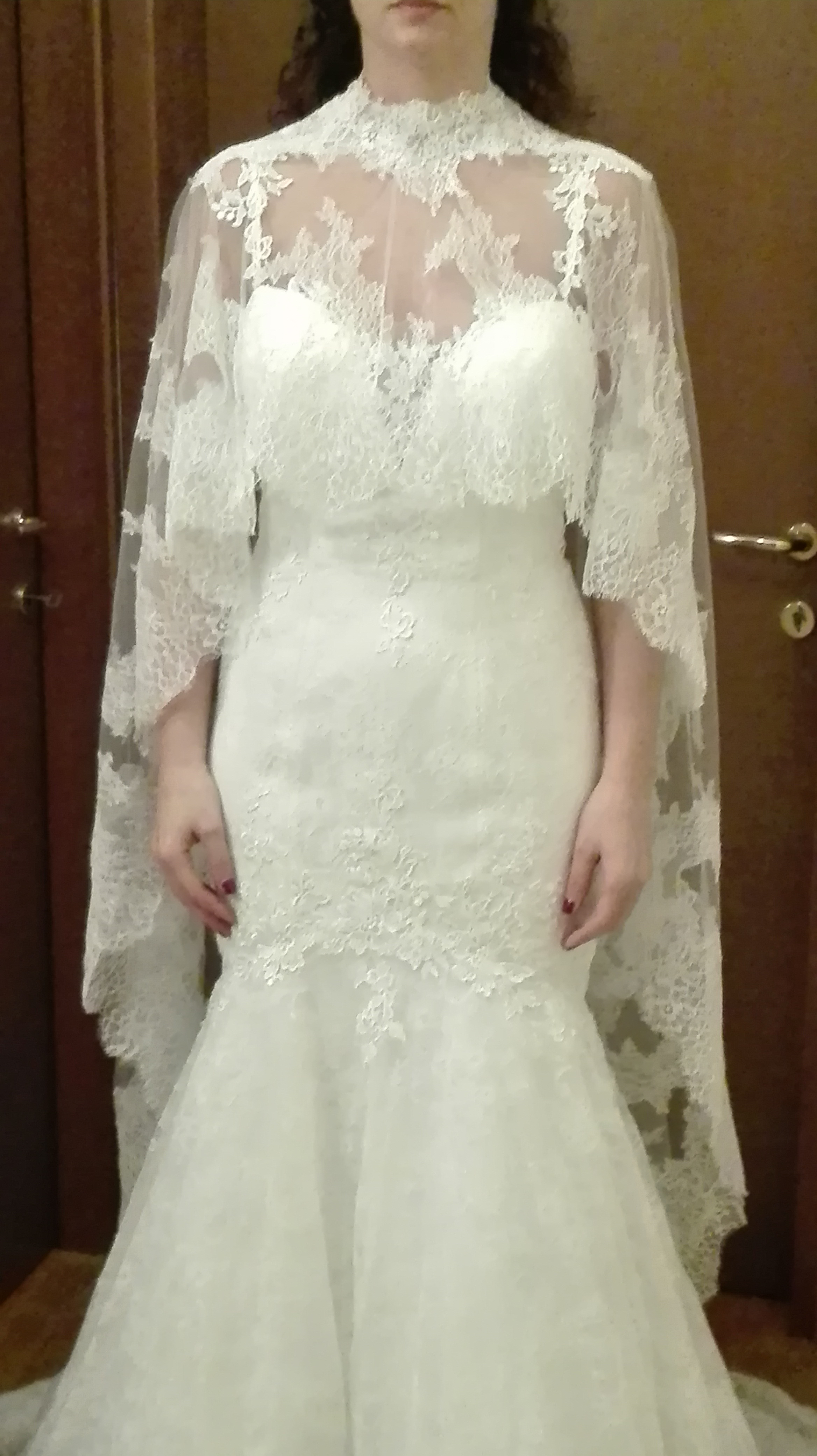 Per coprire schiena e spalle una cappa in pizzo corta sul davanti e lunga dietro.