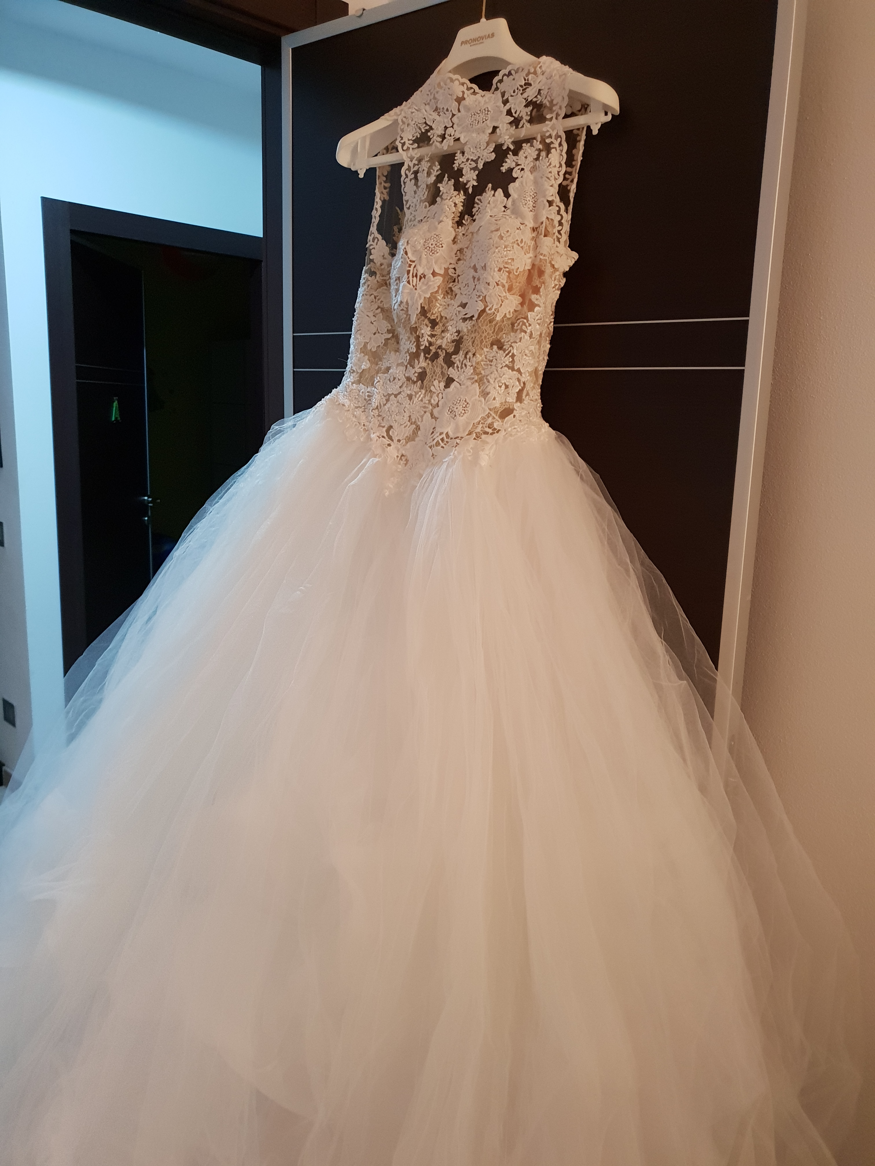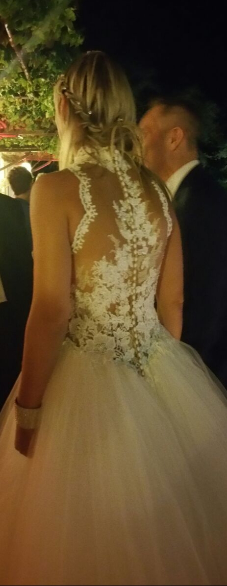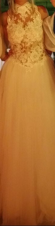 Abito principesco in tulle. Corpetto in pizzo collo alto. Indossato la sera come secondo abito il 29-07-2017