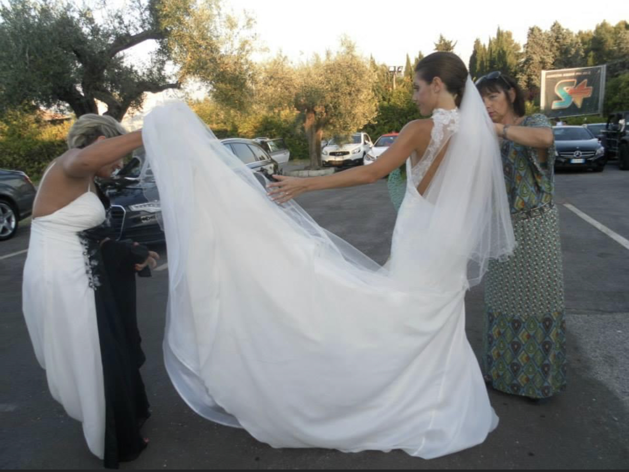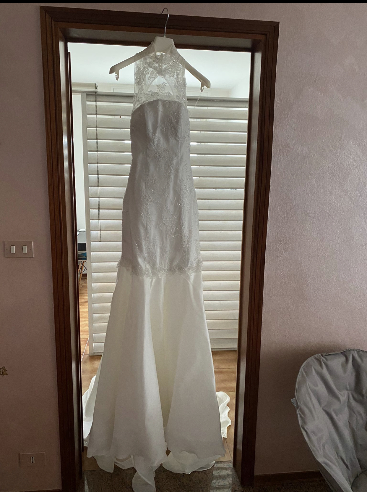 Abito molto bello a sirena con scollo all’americana e scollatura profonda dietro la schiena. Ha uno strascico lungo.