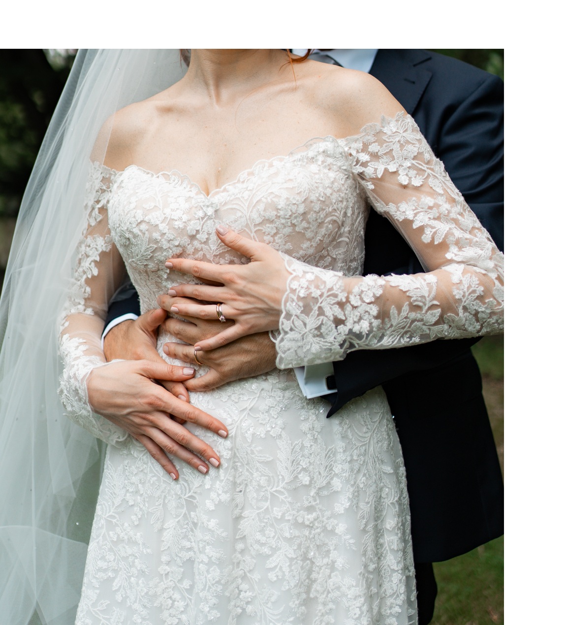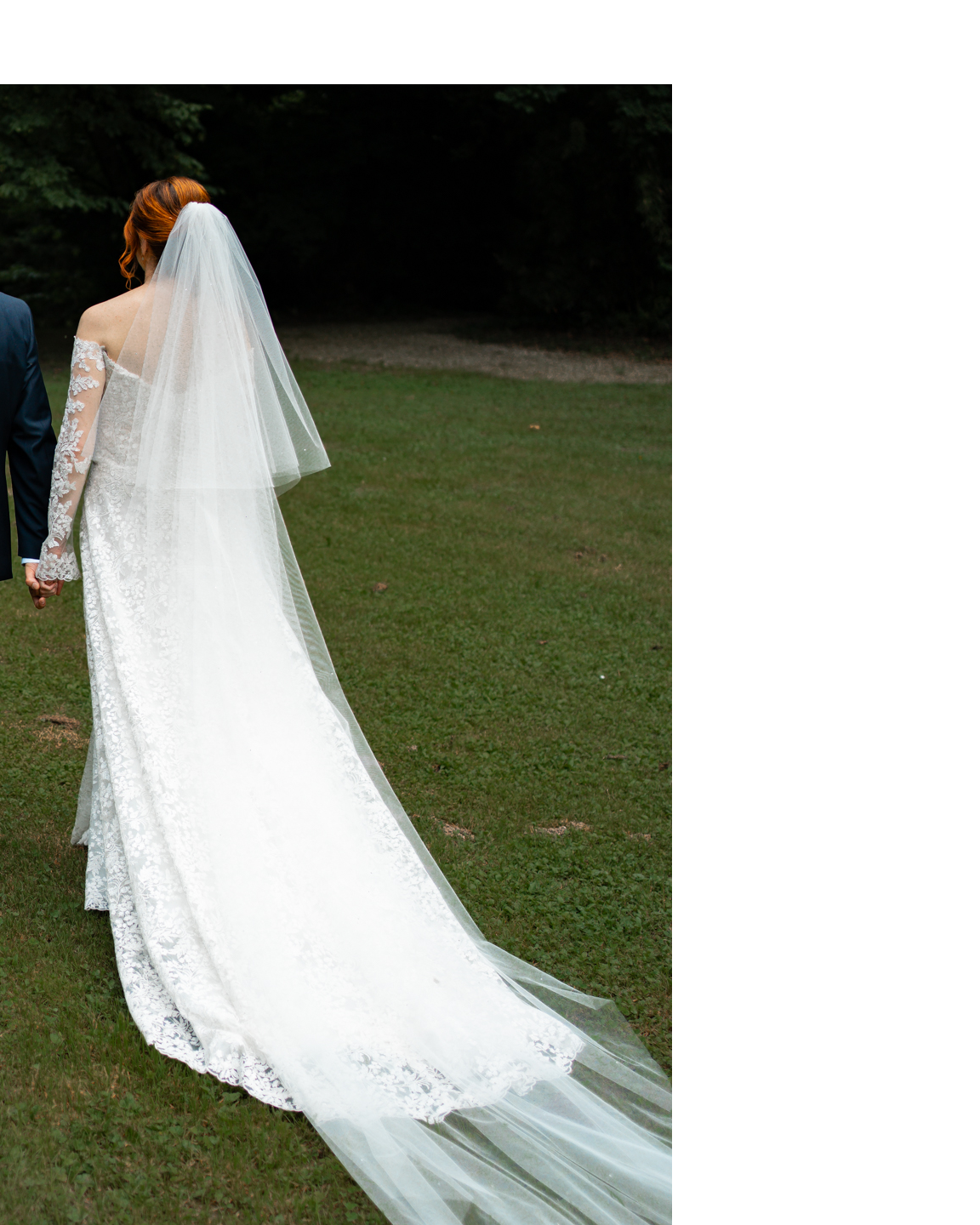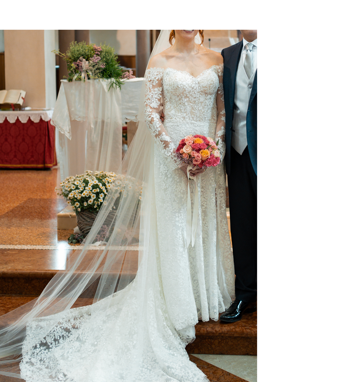 Il sarto ha aggiunto un rivestimento a livello del busto per renderlo meno trasparente, con un ritocco di tessuto sottostante il bustino in color carne — una modifica elegante che valorizza ulteriormente l’abito e lo rende ancora più indossabile e confortevole.