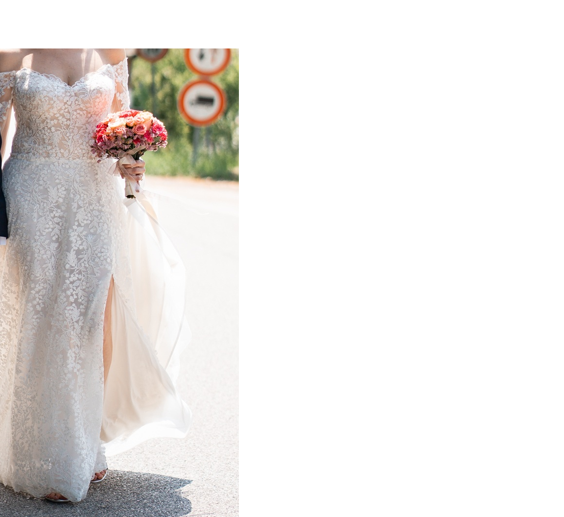Silhouette A-line con scollo a cuore, spacco frontale e strascico. Interamente ricoperto da pizzo rebrodé floreale tridimensionale brillantinato: applicazioni di fiori e foglie in rilievo si estendono su tutta la lunghezza dell’abito creando un effetto luminoso e prezioso, perfetto per una sposa estiva che vuole brillare. Base in tulle e satin color avorio/champagne con corpetto strutturato interno (boning).