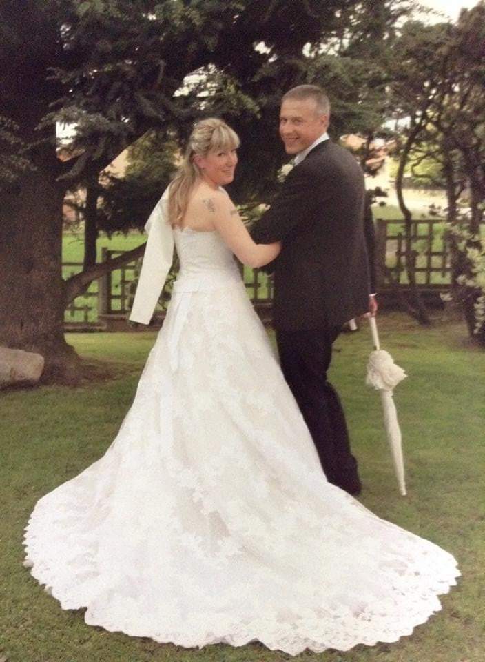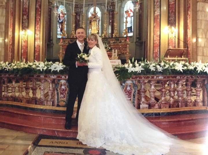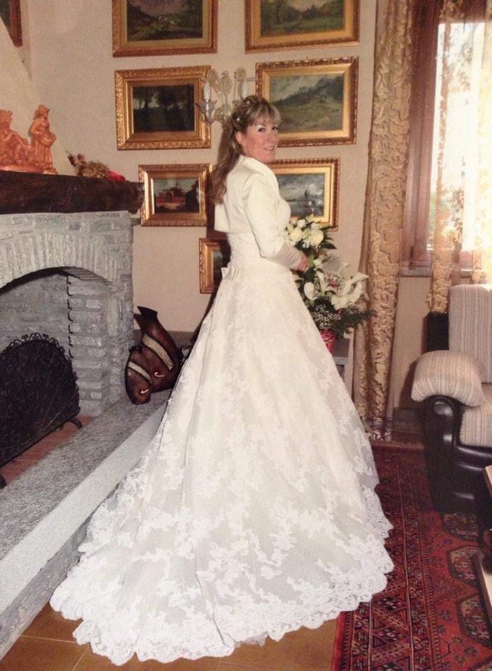 Stupendo abito totalmente in pizzo che ti fa sentire una vera principessa delle favole. Scollatura dritta arricchita dal pizzo che effettua dei piccoli tondi. In vita sui fianchi e’ applicata una cinturina di tessuto bianca che si chiude sul dietro con un fiocco. La gonna è voluminosa da principessa che termina con il tondo del pizzo. È stato accorciato di 6 cm. Io sono alta 171 cm. Sulla schiena è chiuso da tanti piccoli bottoncini foderati. Come nuovo (giá effettuato lavaggio professionale). Taglia 44, di giro seno e vita, sotto è largo e crea un effetto che maschera gambe e fianchi. Completo di velo lungo e liscio fermato da pettinini e coprispalla in raso con manica lungo e collo alla coreana. Utilizzato solo una volta, matrimonio in maggio 2013.Pagato in atelier € 2.600,00. Vendo perche’ mi dispiace tenere un abito così in una scatola, magari può far felice qualcuno.