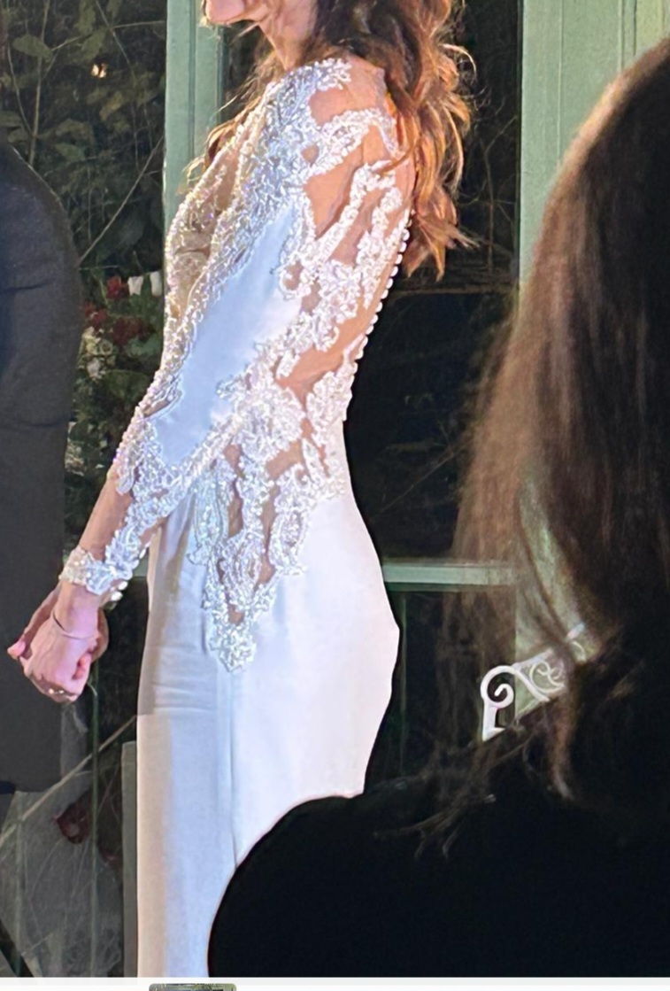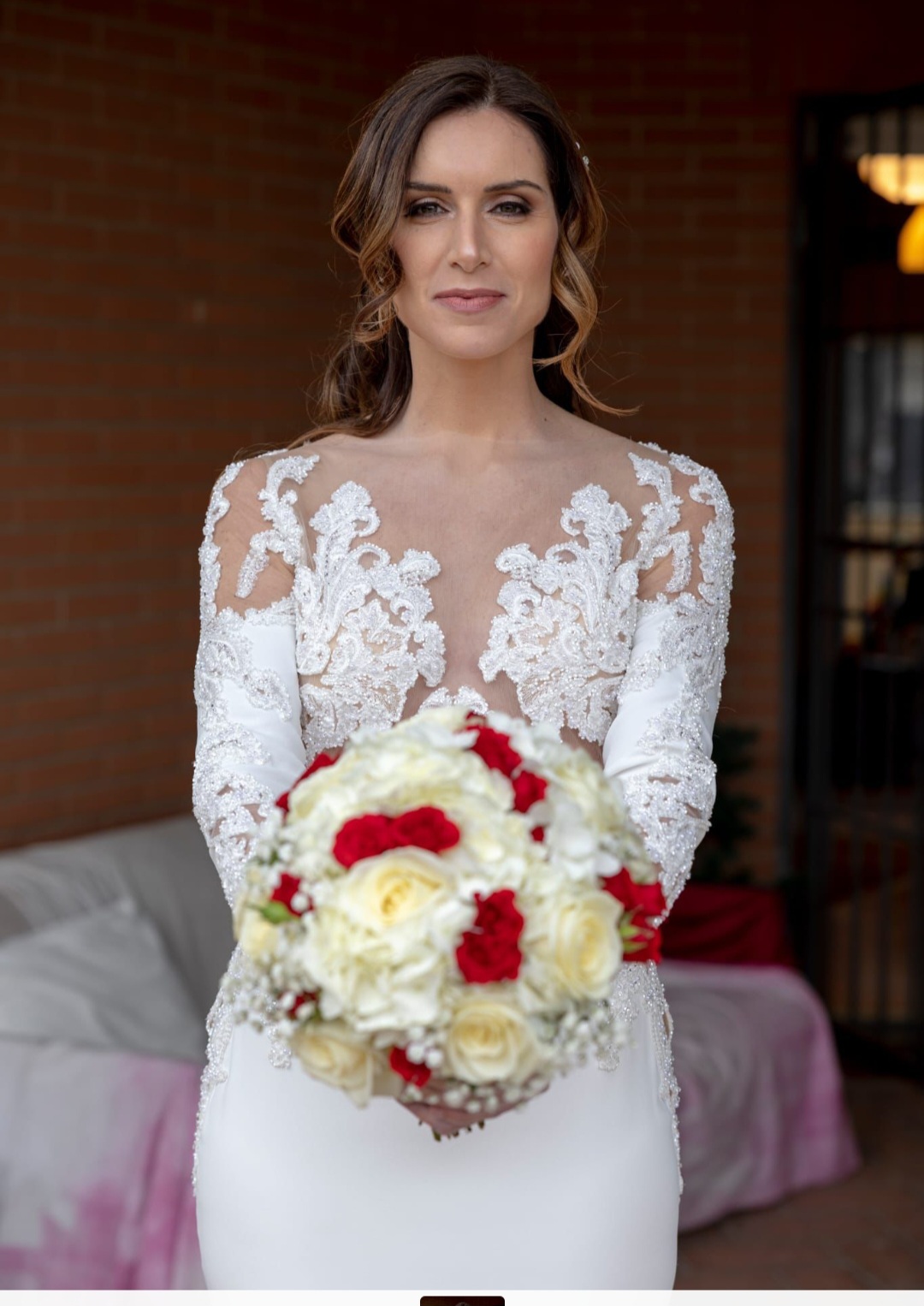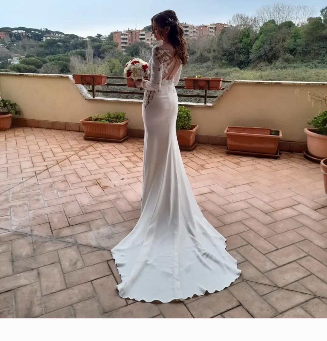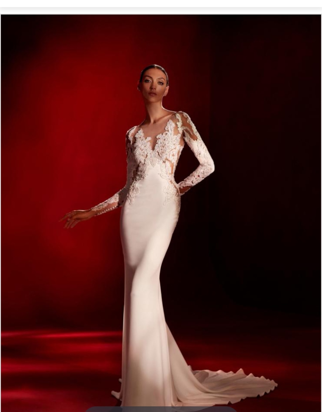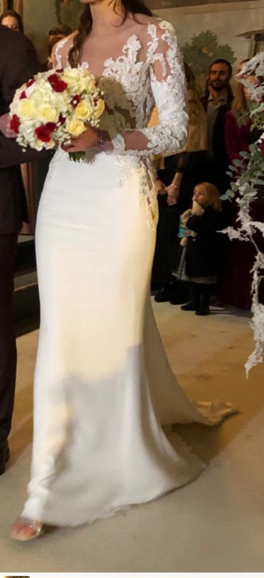 Abito usato collezione Pronovias Atwood 2022-2023. Condizioni perfette e conservazione ottima. Solo donne interessate, invio foto aggiuntive su richiesta. Taglia 44 vestibilità ottima , modello a sirena con piccolo strascico e bottoncini sul retro. Maniche lunghe in pizzo, corpetto in pizzo e velo trasparente con dettagli sui fianchi. Prezzo proposto euro 1900, oltremodo scontato. Un sogno di elegante sensualità atelier Pronovias.