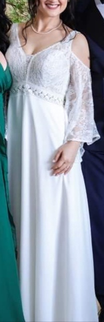 Colore bianco, taglia 42/44, stile scivolato, scollatura sulle spalle e sul décolleté a V (con aggiunta di pizzo ombra- da rimuovere eventualmente per chi vuole una scollatura più profonda), manica lunga e adatto a tutte le stagioni.
