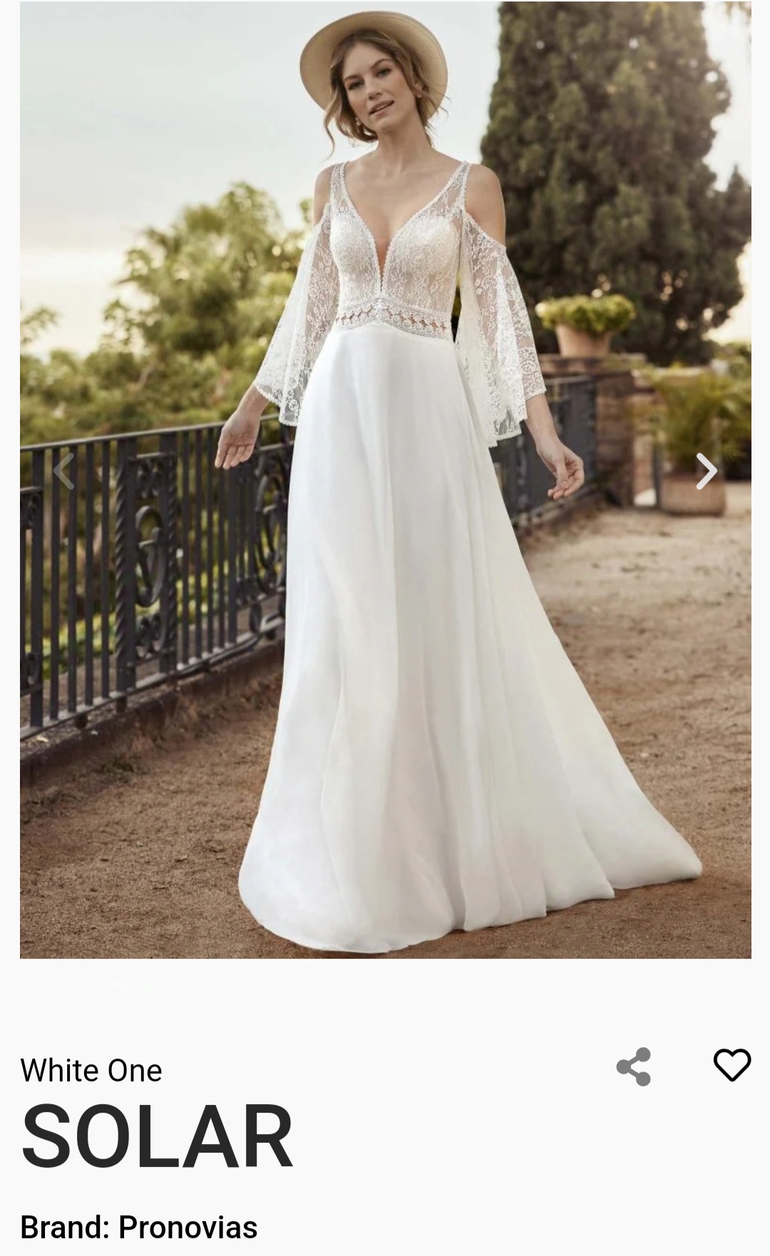 Abito da sposa brand Pronovias modello White One Solar, collezione primavera estate 2023 in seta e pizzo.