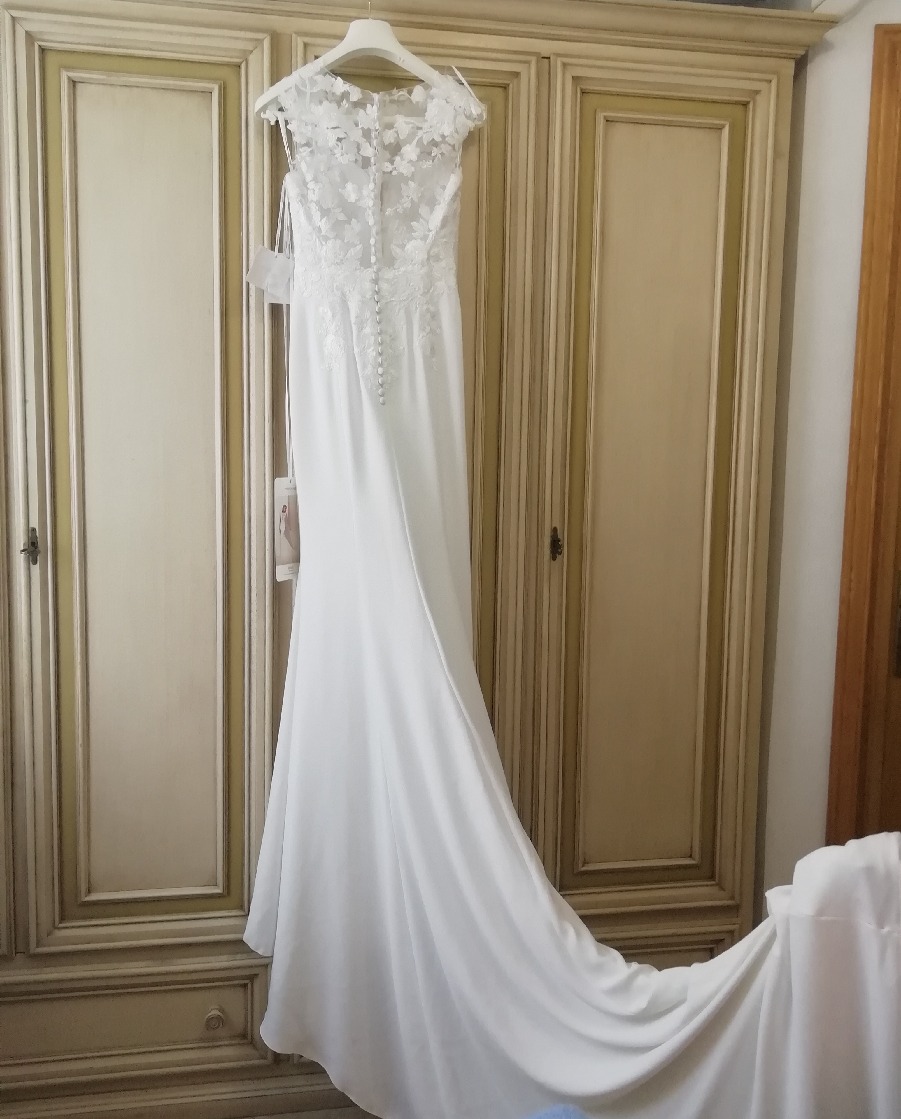 “Abito da sposa in stile sirena. L’effetto nudo del corpetto in tulle con ricami floreali crea un effetto seconda pelle su scollatura e schiena. La gonna con strascico, confezionata in crêpe, si apre nella parte inferiore creando ampio movimento”