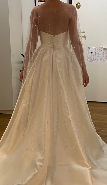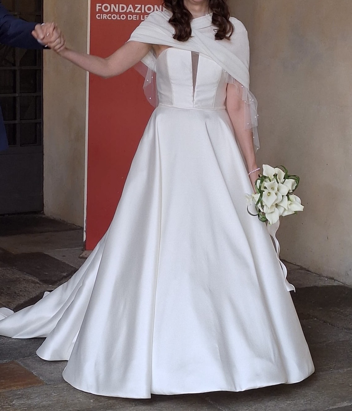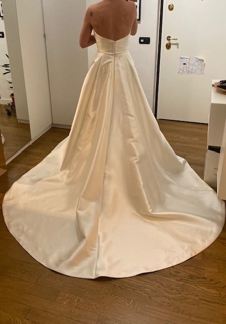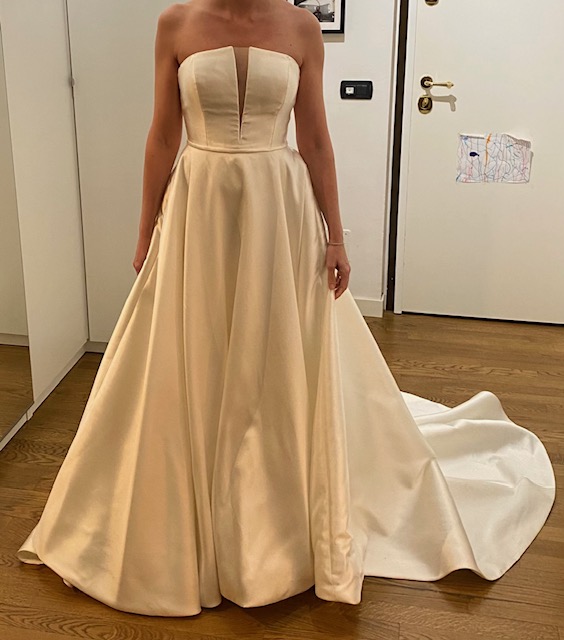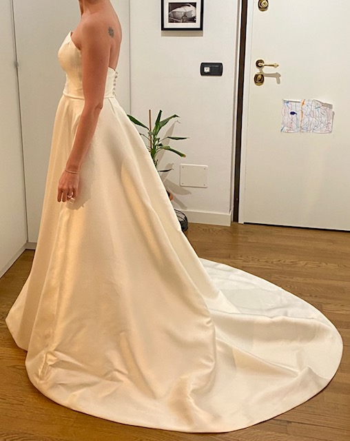L’abito è interamente realizzato in mikado di seta. Attualmente veste una taglia 42, orlo realizzato per altezza 179, ma agevolmente modificabile presso una sartoria.