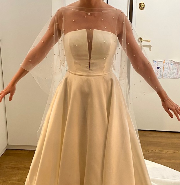 -mantellina in tulle tempestata di perle del valore di € 180 (visibile in foto).