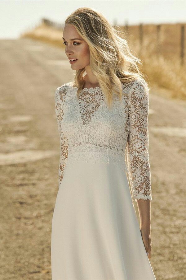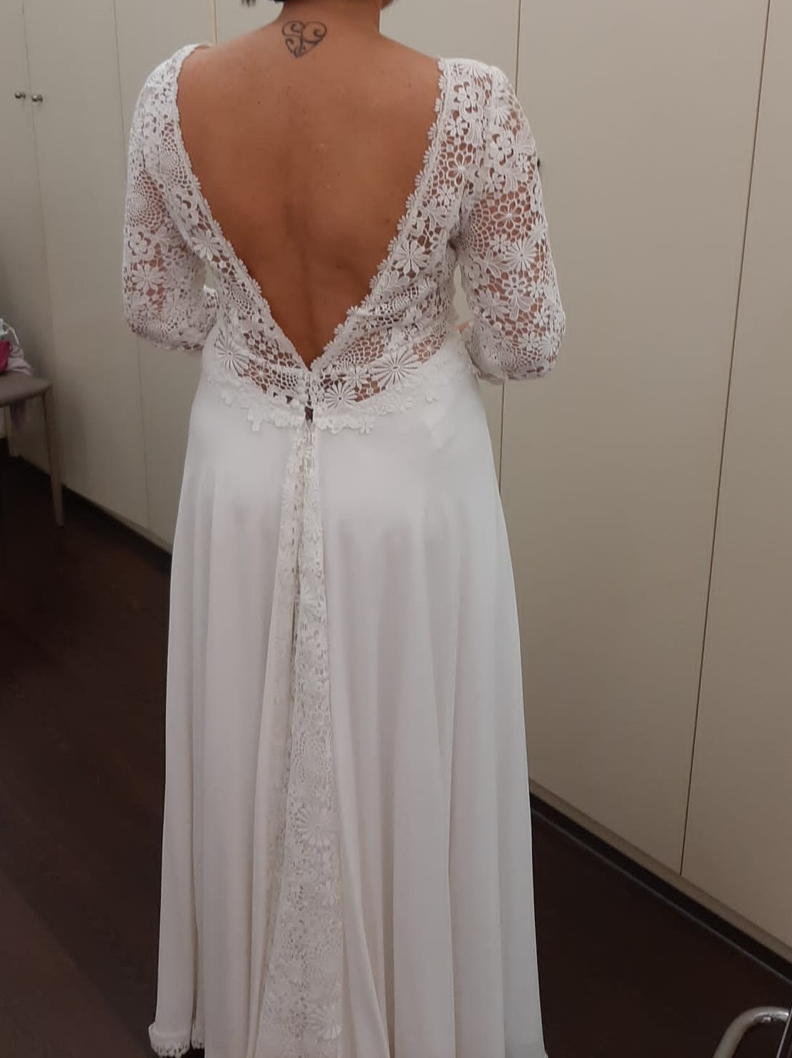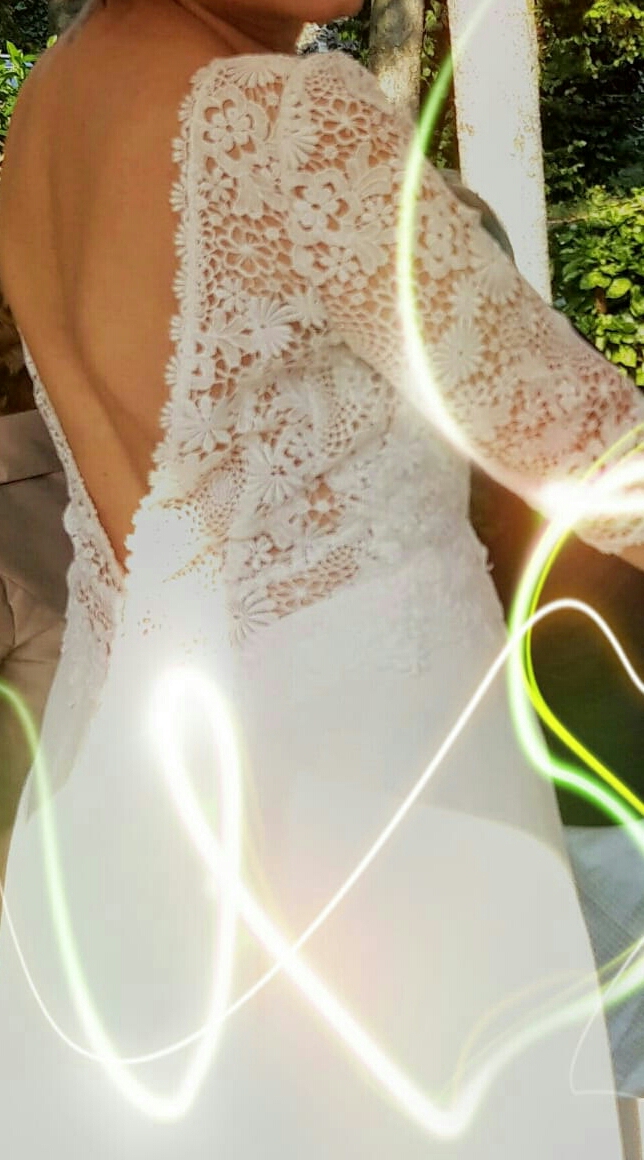 ABITO DA SPOSA della collezione Rembo Styling, disponibile in pochissimi negozi in Italia, taglia 44, maniche 3/4, corpetto in pizzo floreale ricamato, abbinato ad un’elegante gonna in crêpe con inserto posteriore in pizzo. Scollatura nel retro a V profonda con inserto antiscivolo, coppe preformate, strascico non troppo lungo, unico, da vedere, acquistato ad agosto 2020 pagato E.2400 (scontrino dimostrabile) vendo E. 1200. provincia Milano Sud