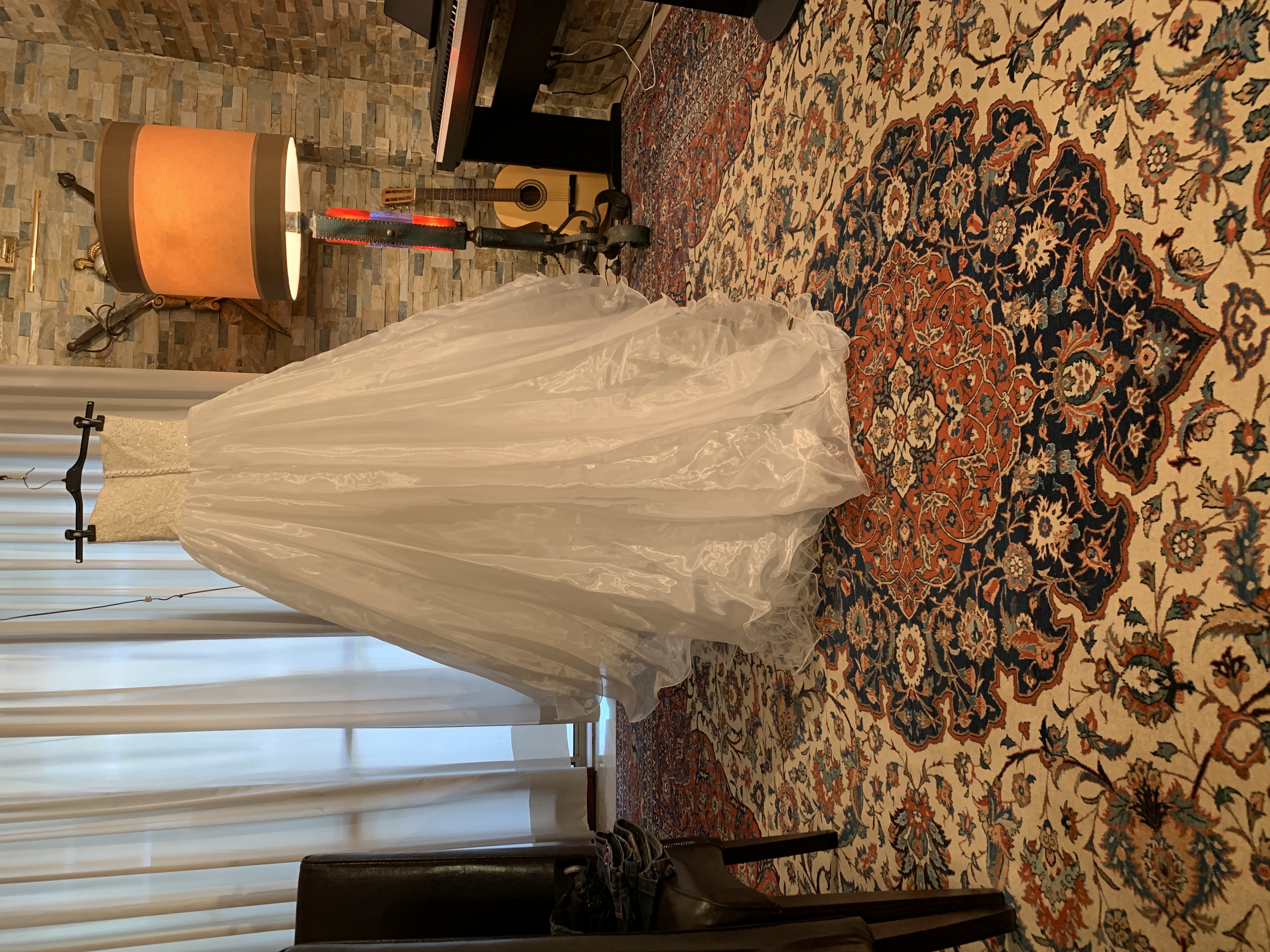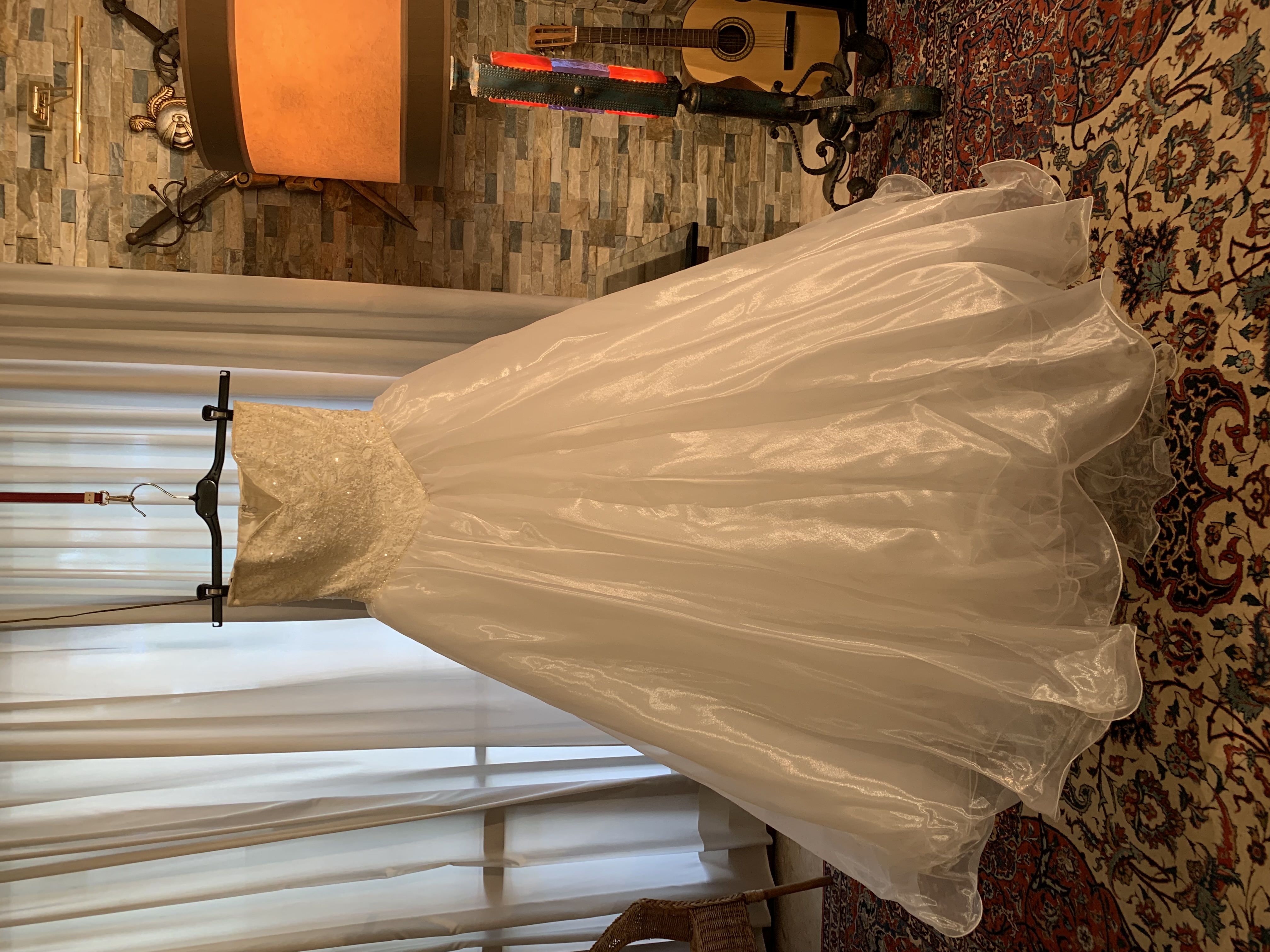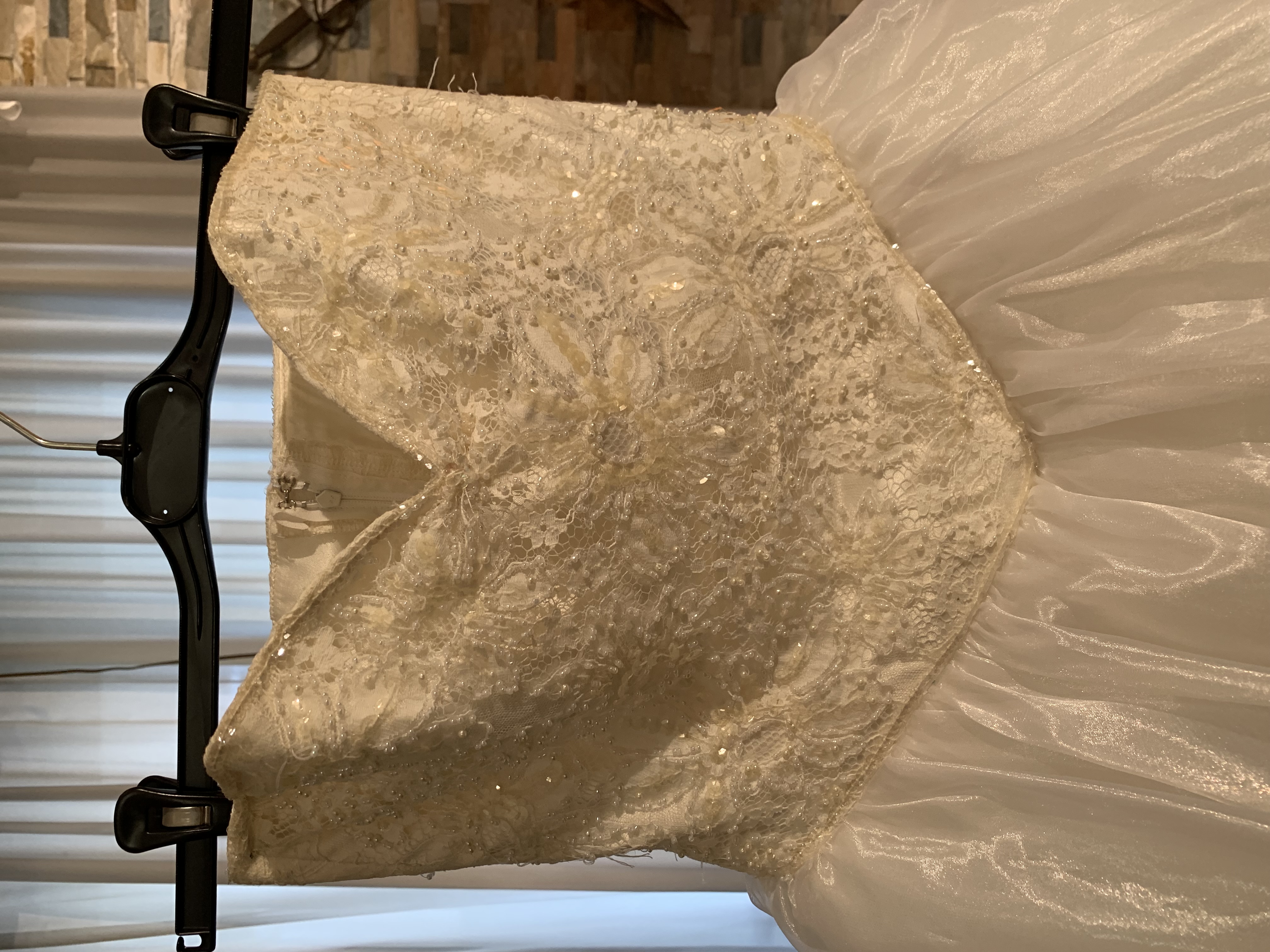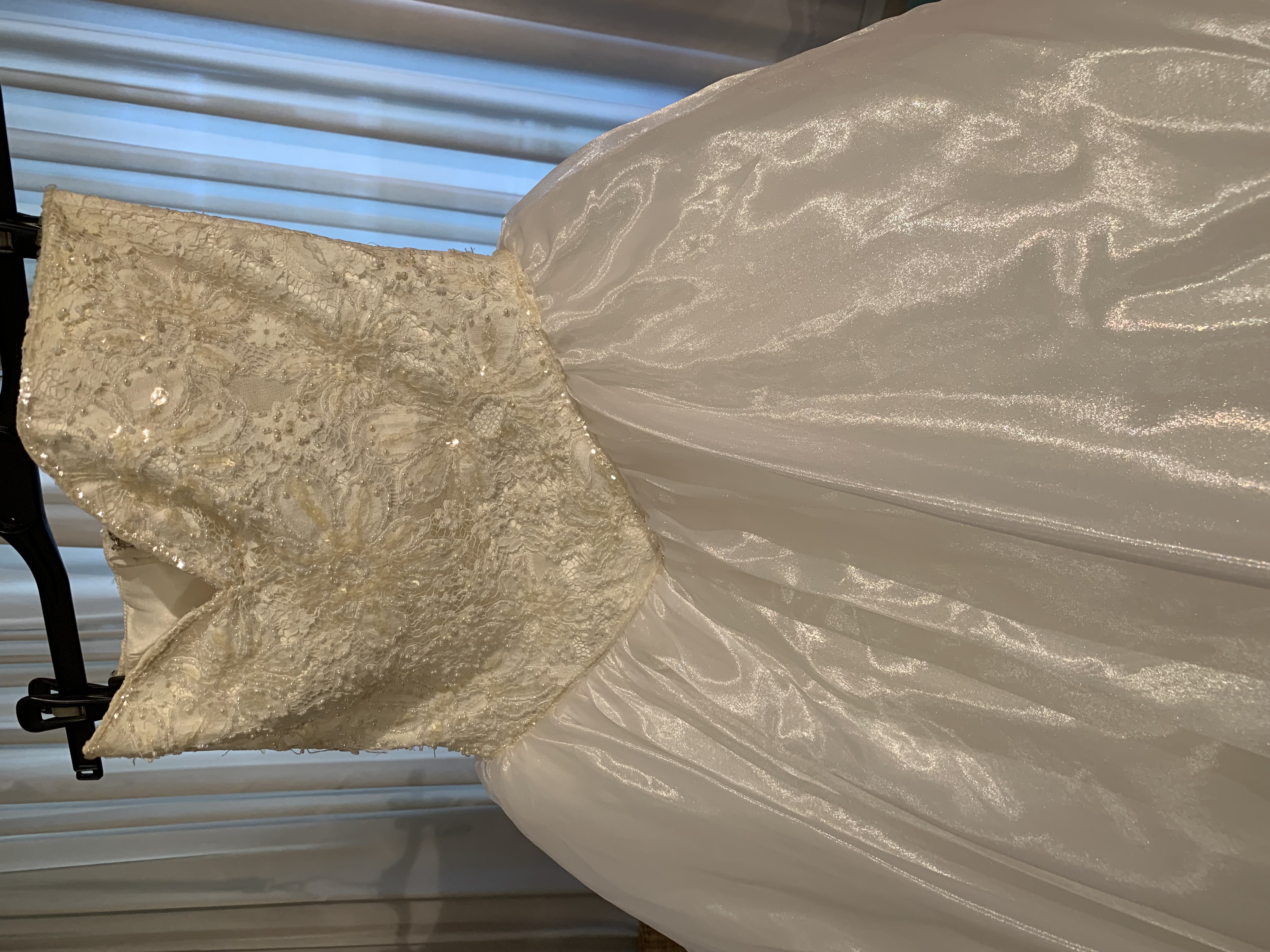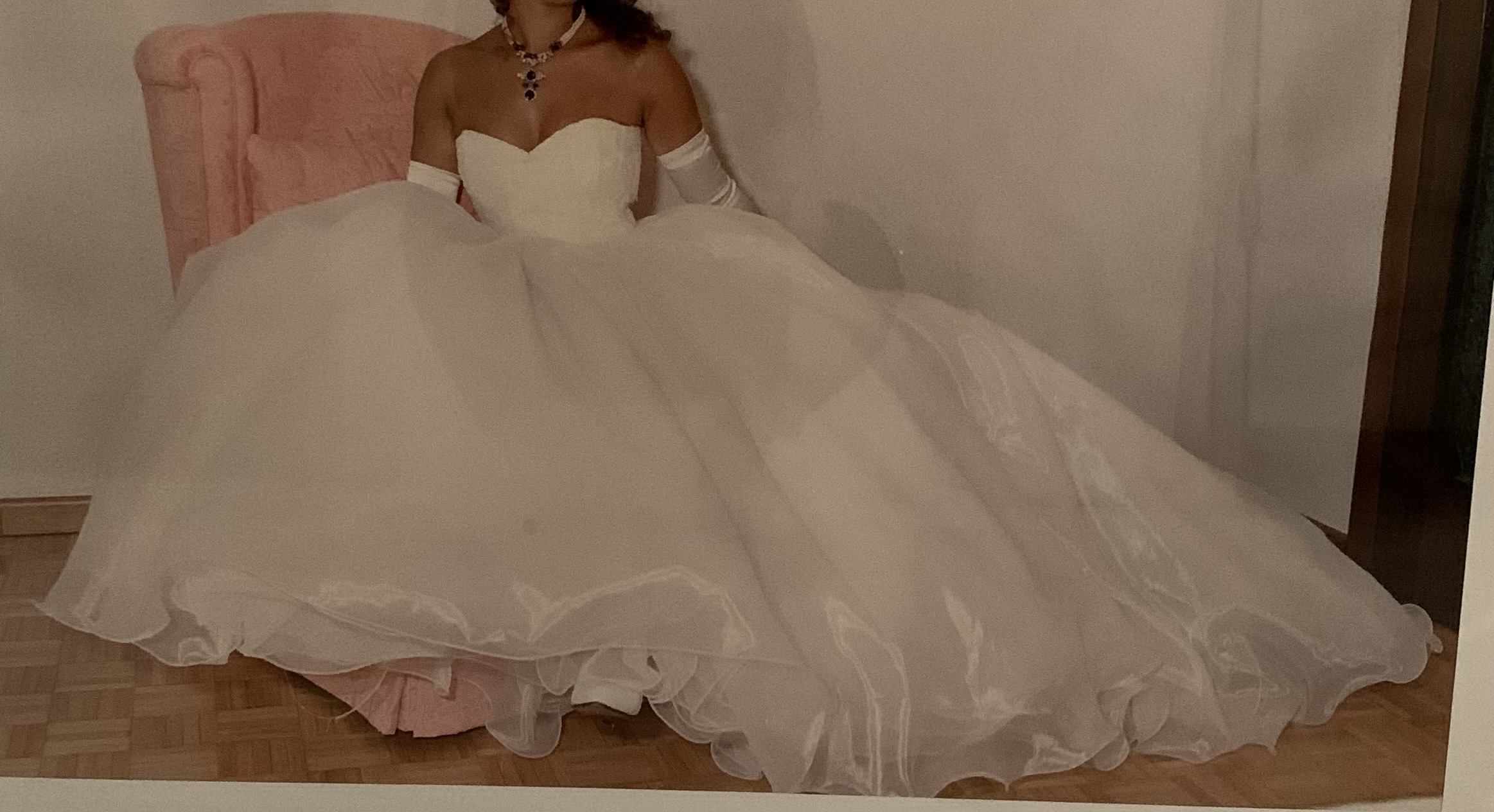 Abito da sposa bianco con corpetto in pizzo, perline e paiette, mentre il resto è organza e tulle. Compreso nel prezzo ci sono guanti in raso lunghi, velo e copri spalle.
