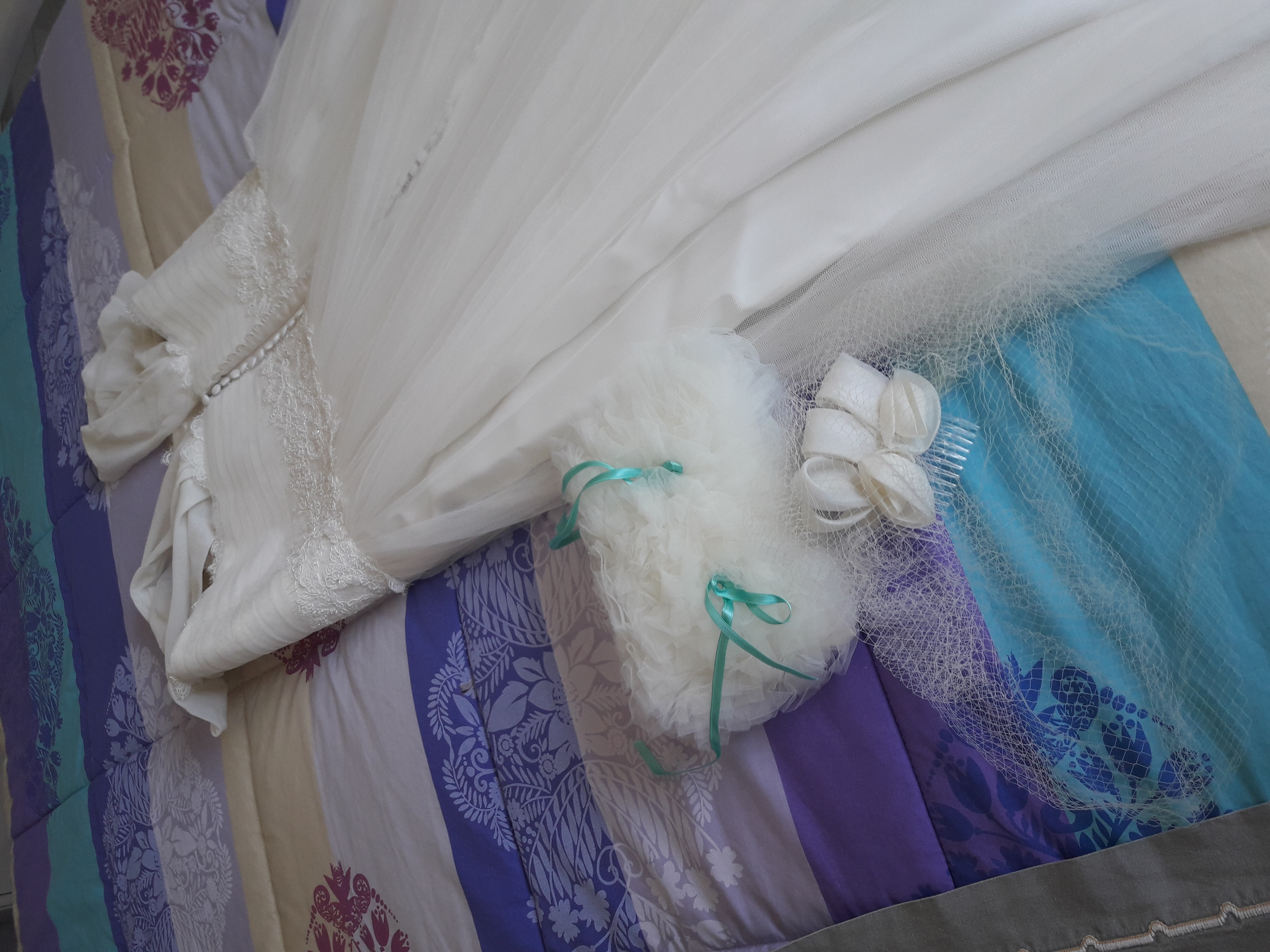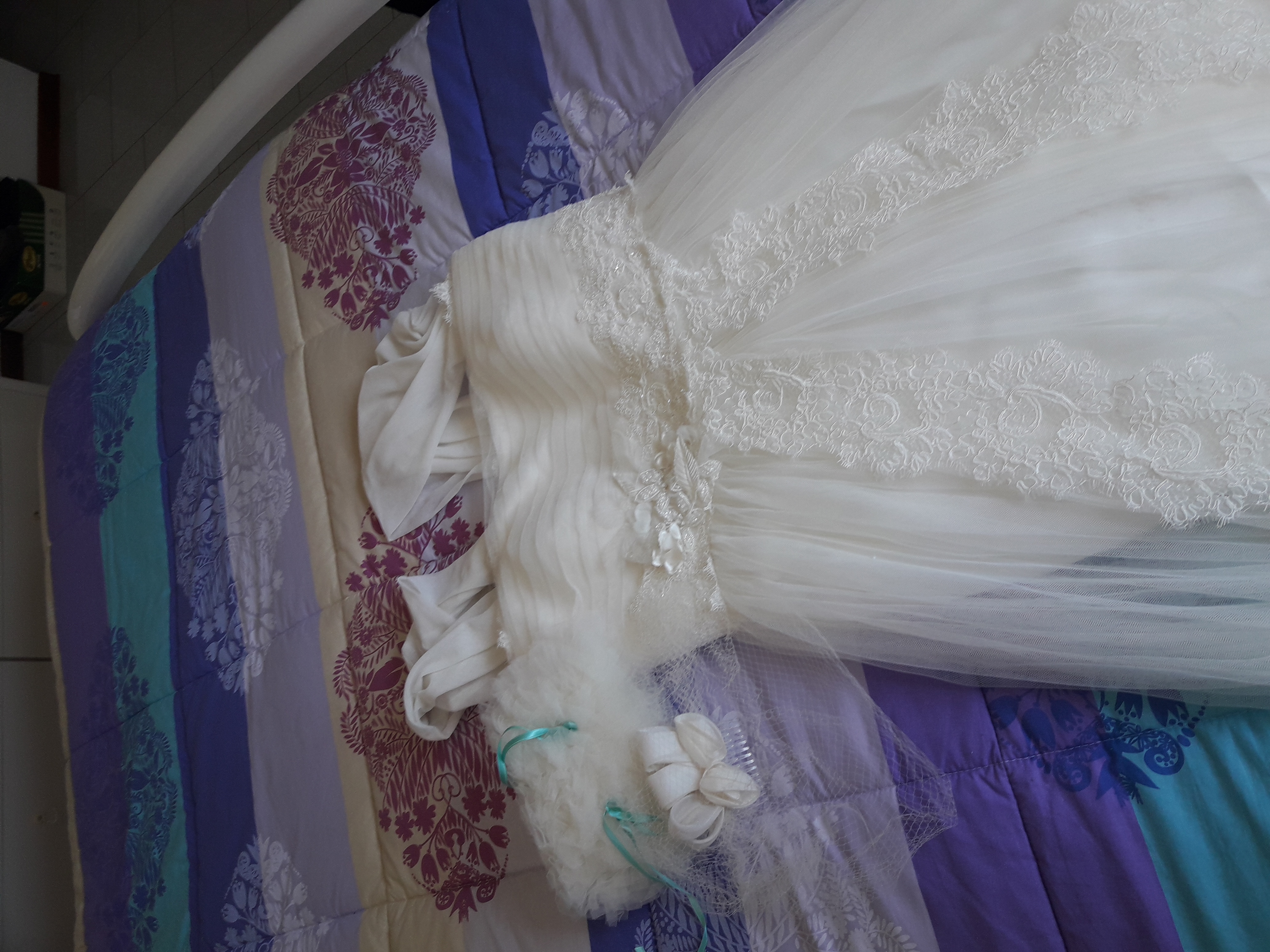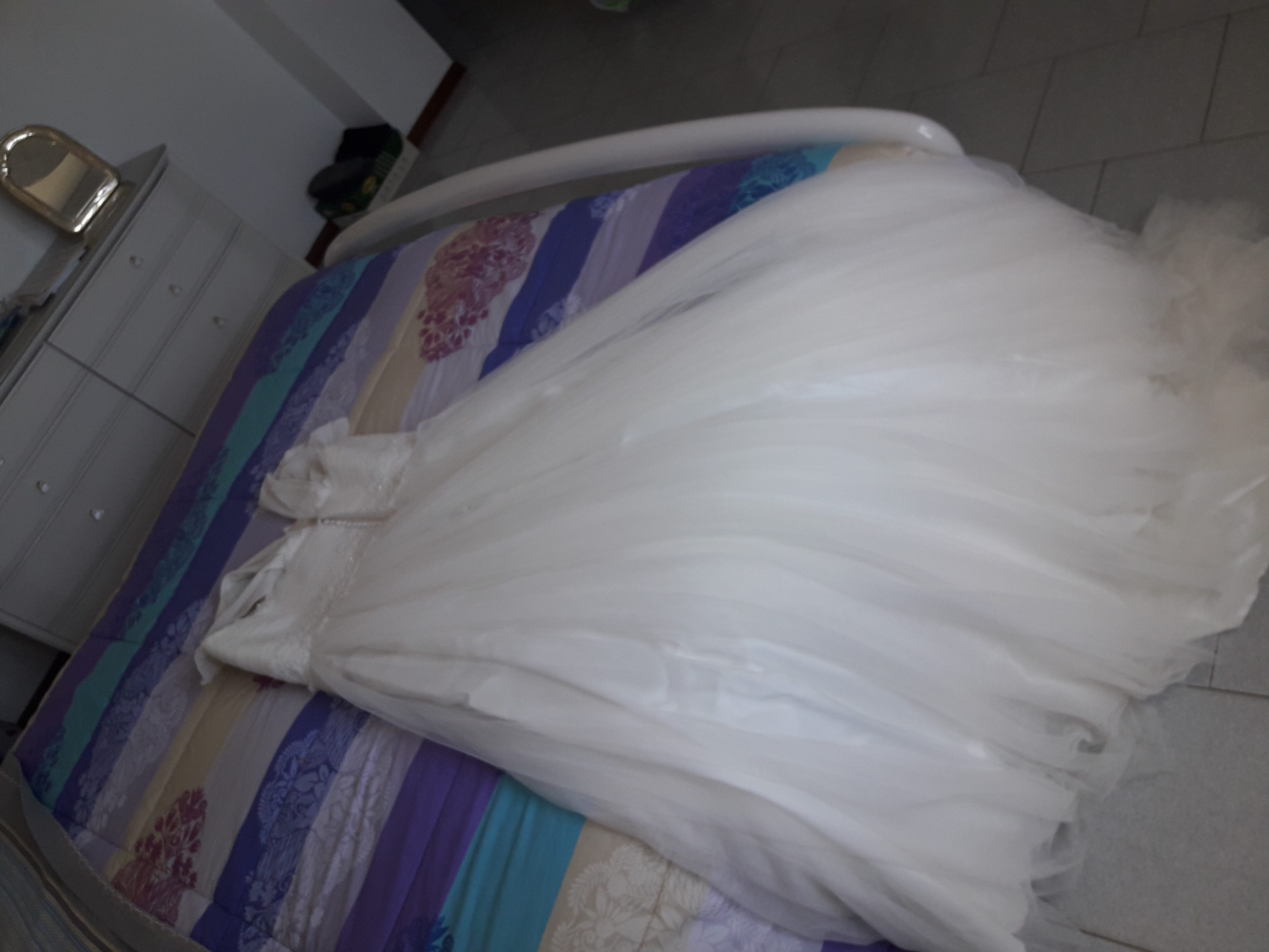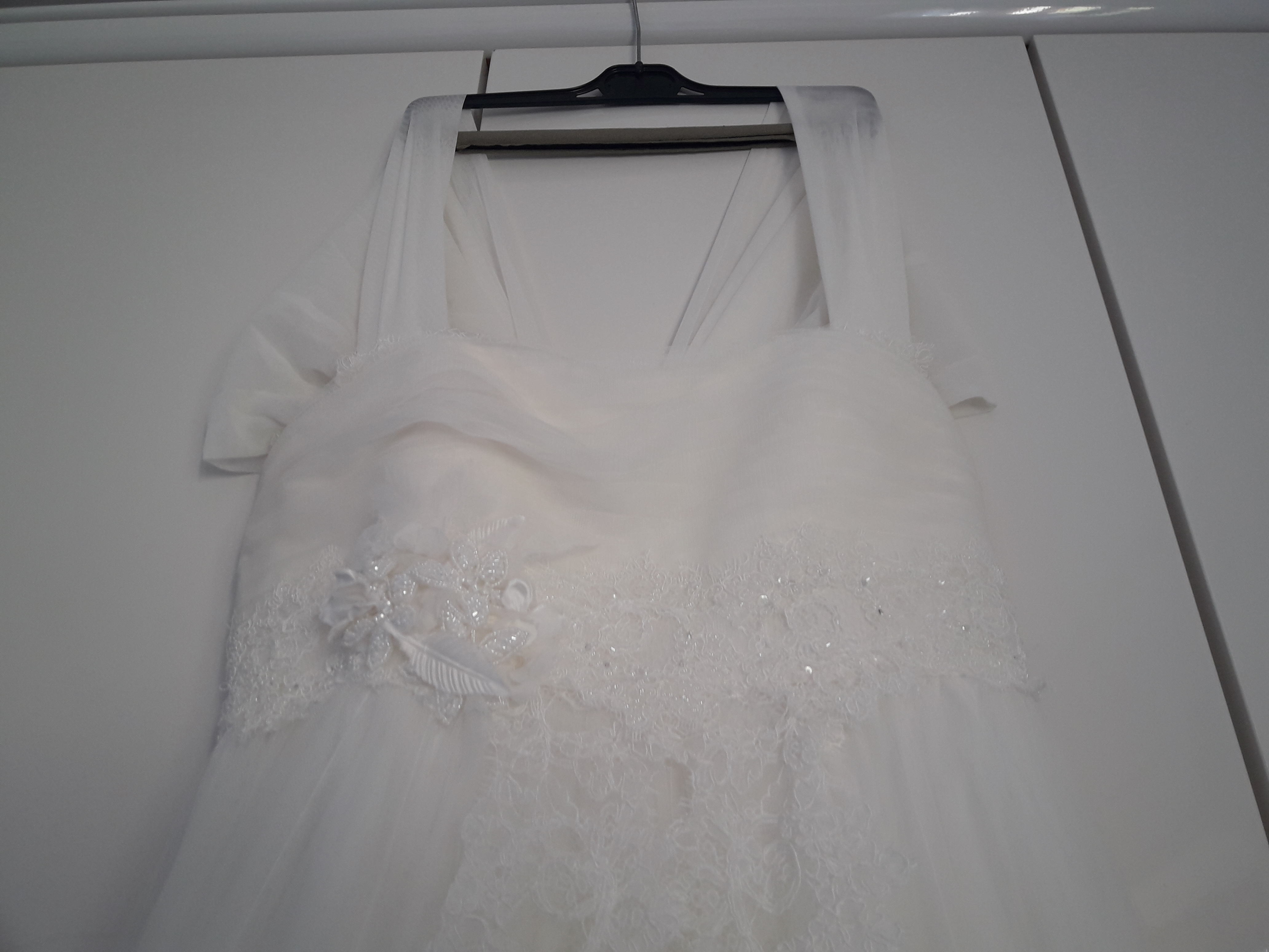 Abito in tulle e pizzo con strascico corto e scollatura a cuore .in perfette condizioni. Stile romantico.Nel prezzo sono comprese la veletta e il cuscino per le fedi. Spedisco in qualunque parte d’Italia.