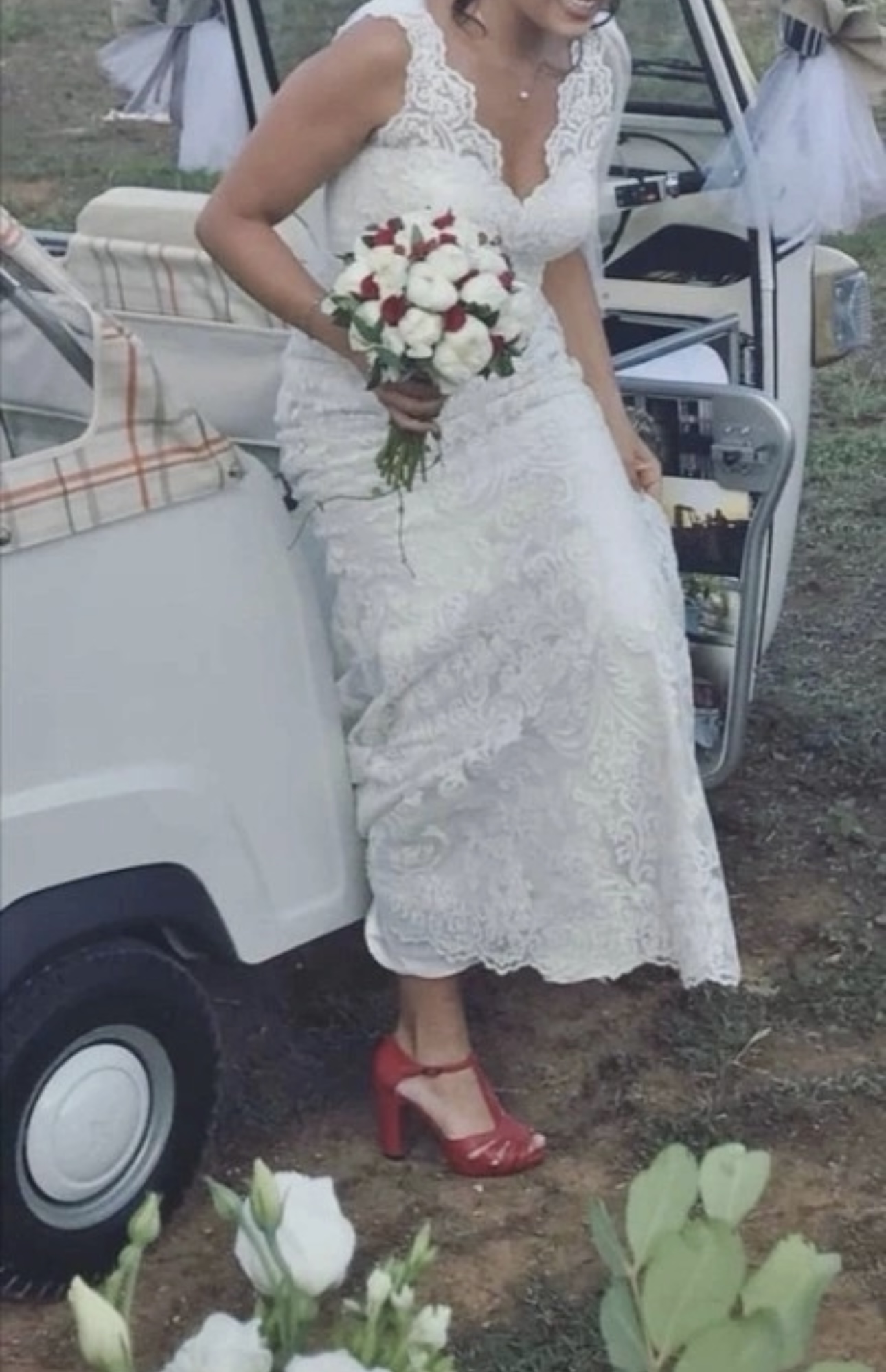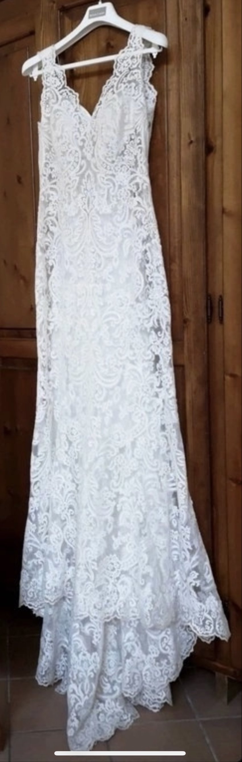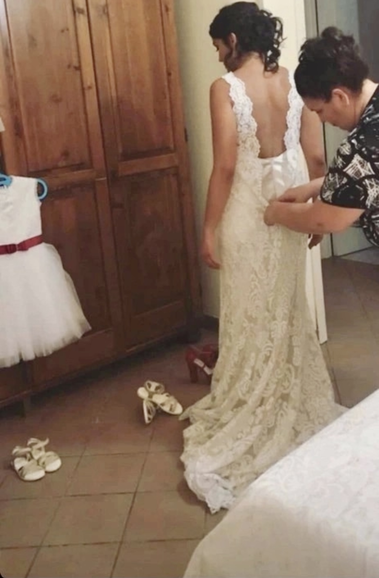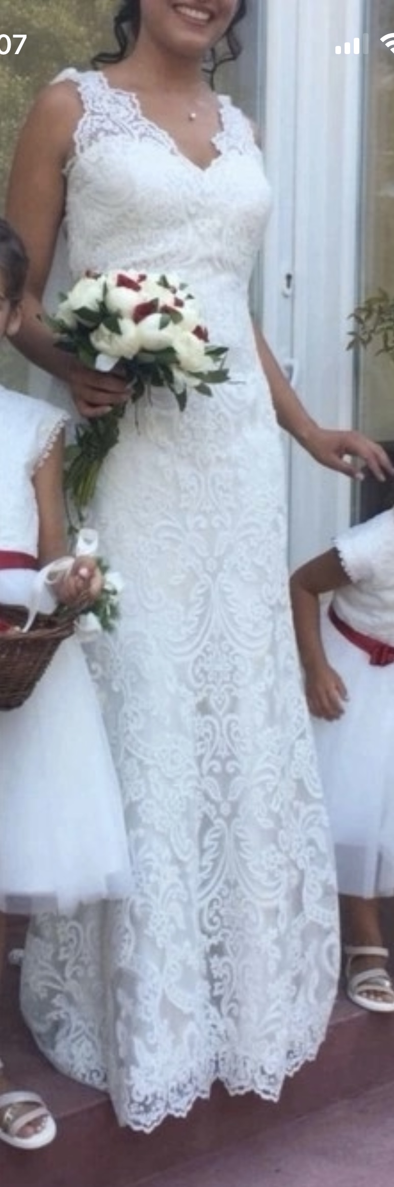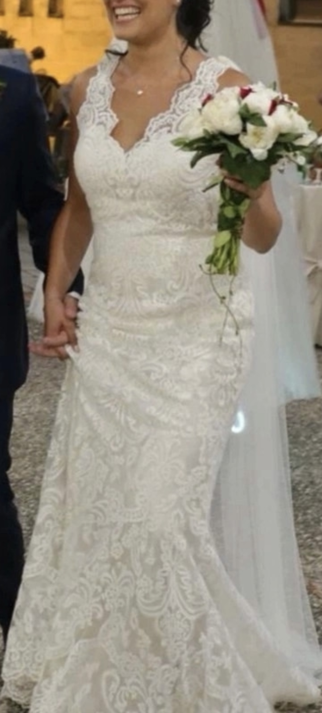 L’abito è stato usato solo poche ore per la cerimonia. È praticamente perfetto, non ha subito nemmeno un graffio. È di Macramè di color bianco latte.