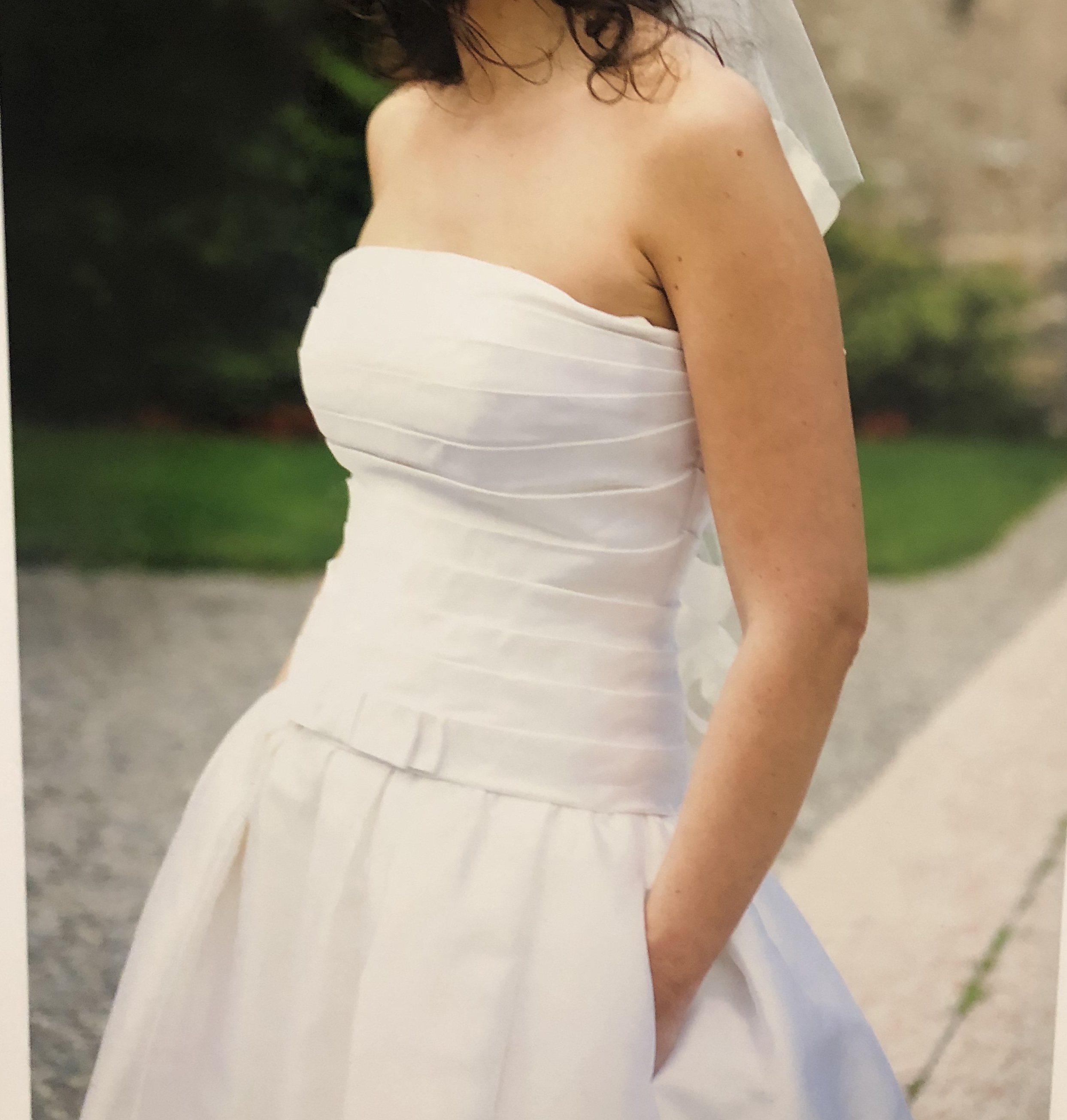 Abito da sposa in seta color avorio di Rosa Clara’, con bustino a balze, fiocco in vita e ampia gonna.
