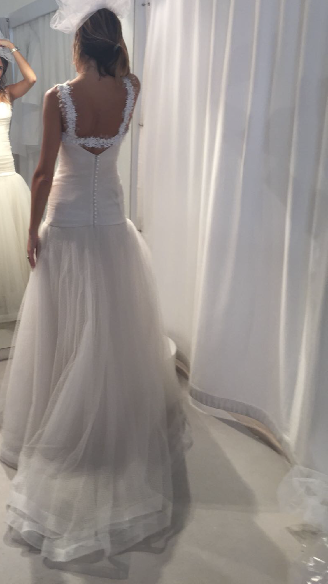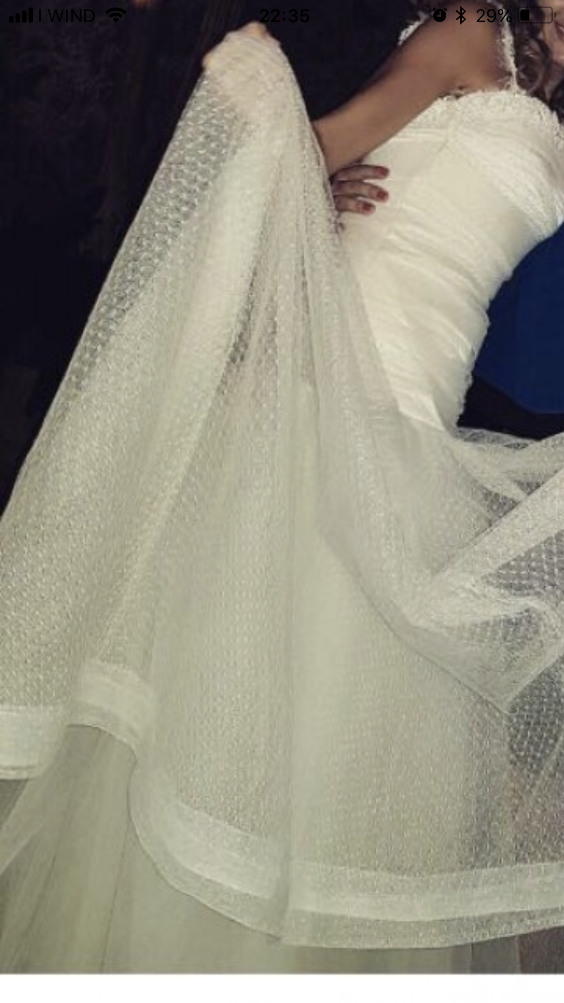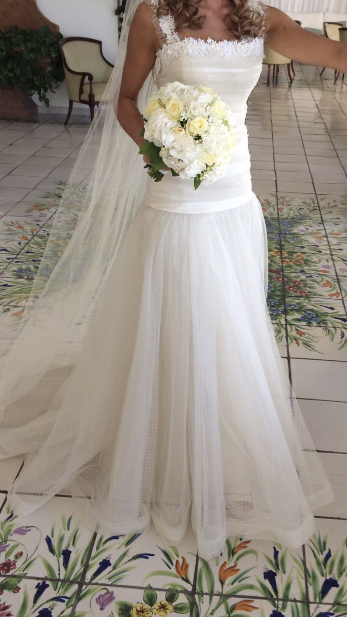 Abito bianco point d’esprit, unico ed introvabile!!! La sua semplicità ma allo stesso tempo la finezza e la sua eleganza, lo rende di grande sapore. Mi ha colpito la particolarità dello scollo a barchetta con tutte le romantiche margherite che ne fanno da contorno, ricamate a mano. Lo avevo visto alla sfilata di miss Italia 2017 e me ne sono innamorata!!! Velo incluso nel prezzo. Possibilità di acquisto accessori: cerchietto con fiore grande, guanti, scarpe da sposa! Affrettatevi!