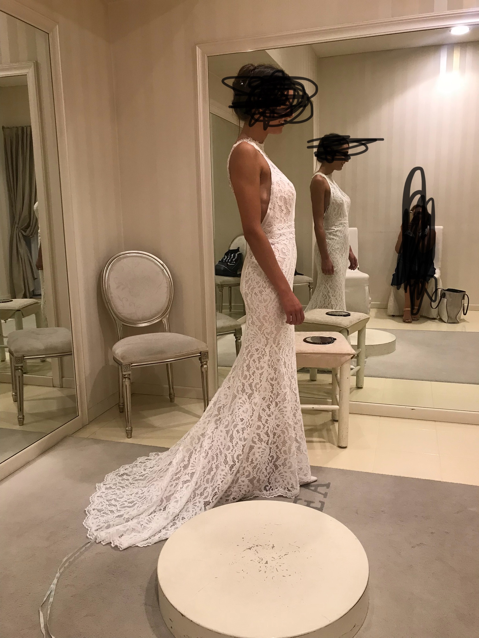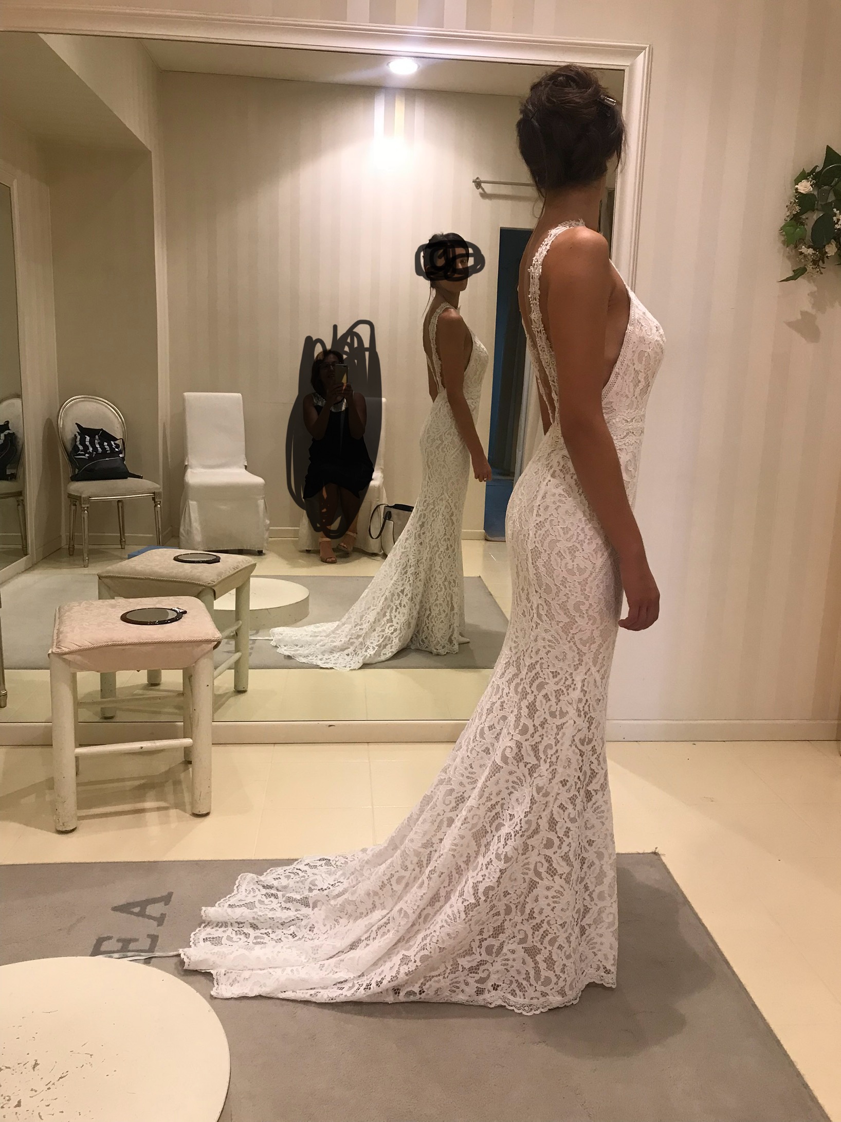 Abito a sirena in pizzo bianco traforato completamente rivestito con tessuto color champagne, lascia le spalle nude con spalline lungo la schiena, scollatura all’americana , finisce con una leggera coda