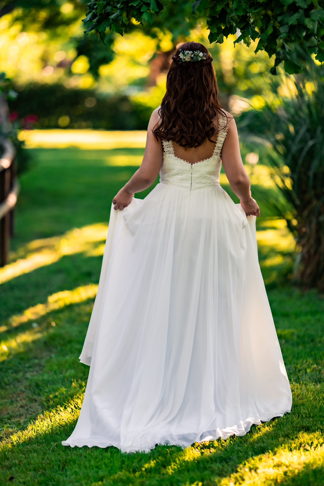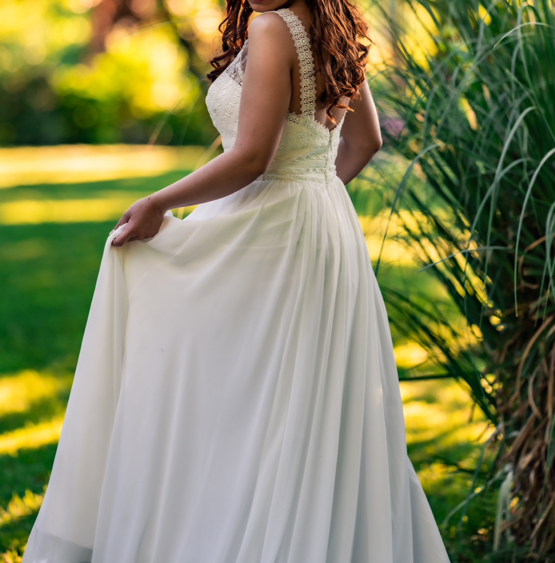 Abito da sposa bianco, stile classico, collezione Sposissimi & Co. estate 2020, corpetto in macramè. Veste taglia 42/44. Usato, ovviamente, una sola volta e fatto pulire in pulitura professionale. Completo di cerchio, custodia abito, sottoveste e scatola.