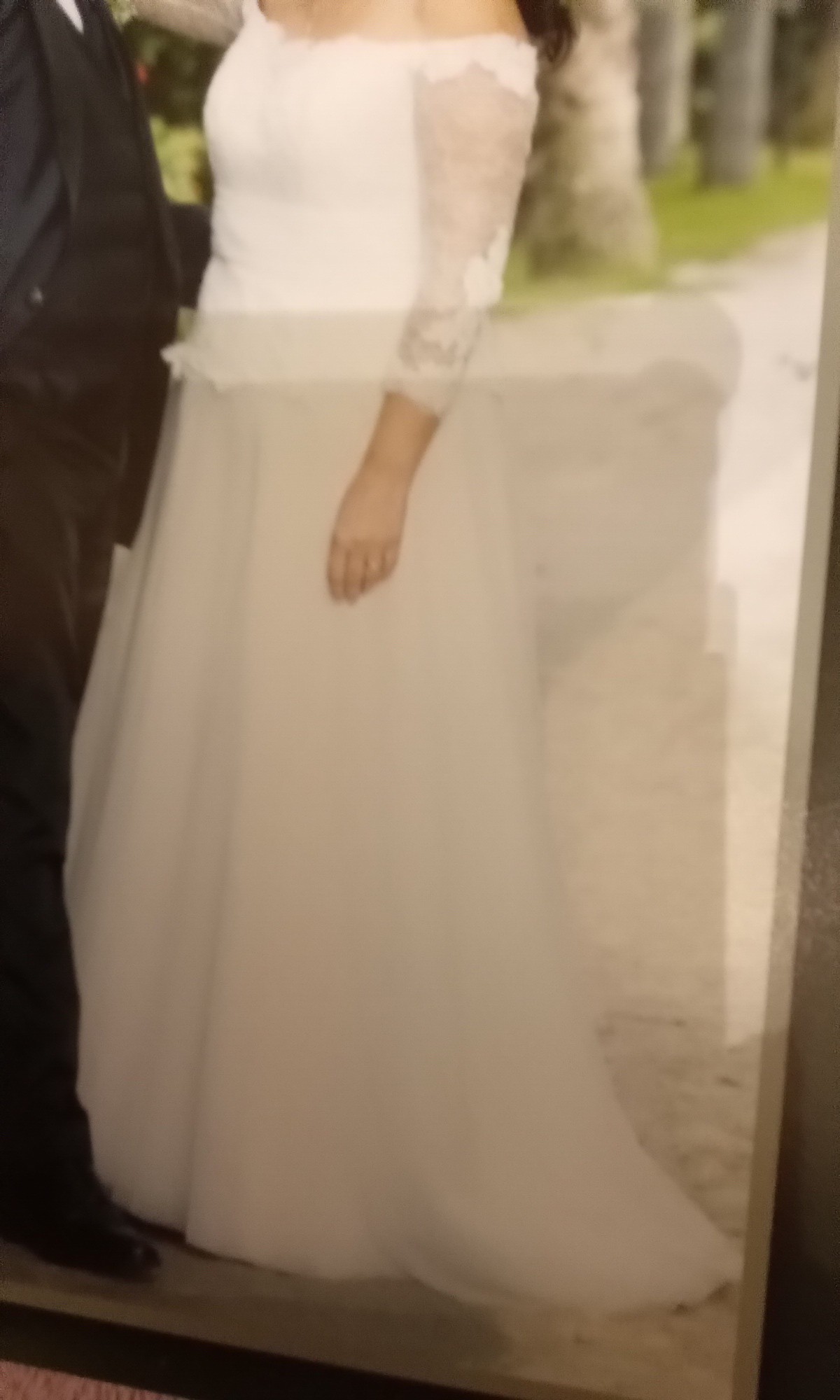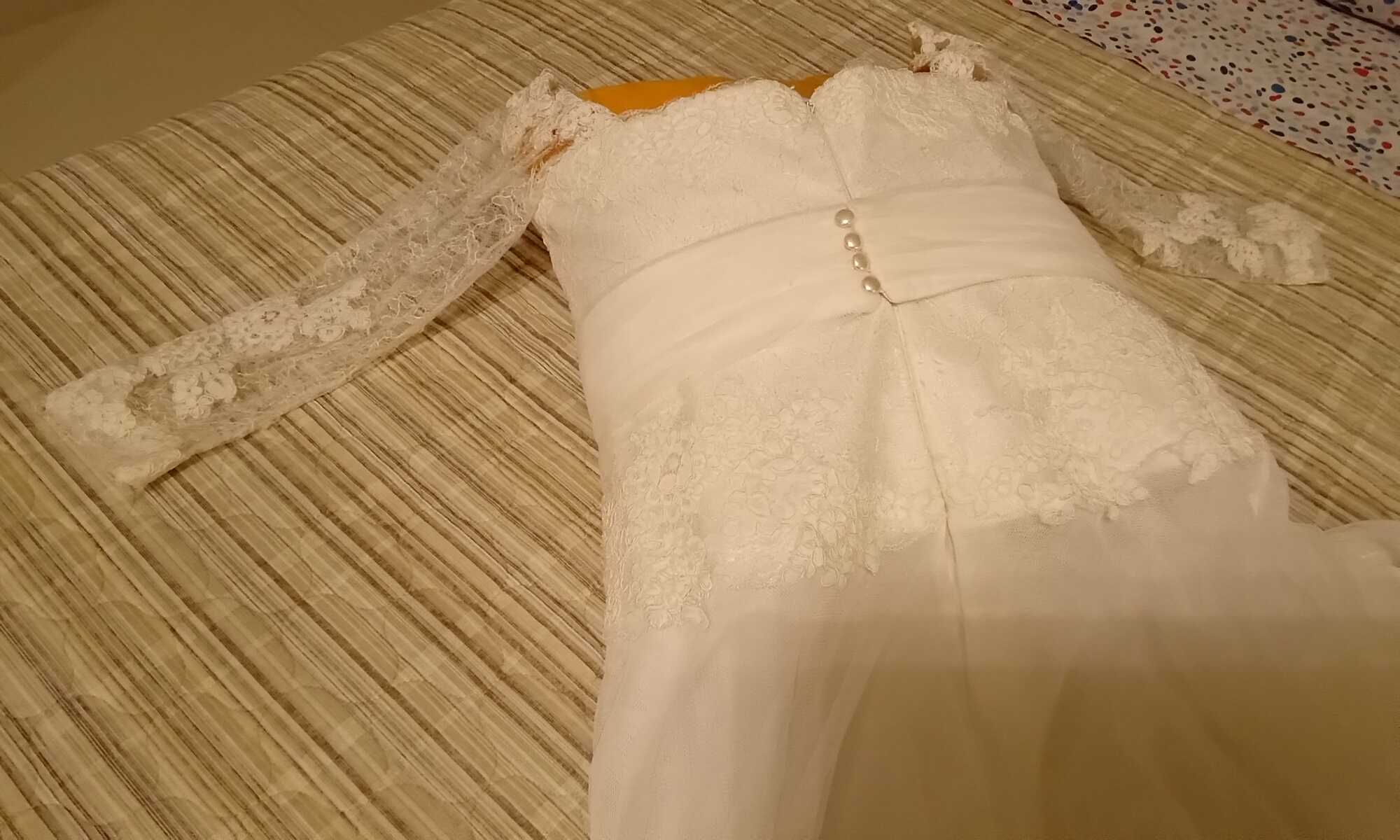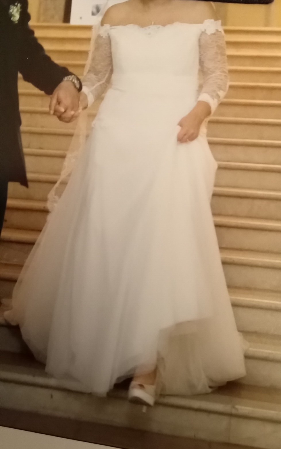 L’abito è stato usato 1 volta, l’orlo non e’rovinato. Sono state apportate delle modifiche l’abito in originale era senza maniche, io le ho fatto aggiungere, volendo si possono togliere.