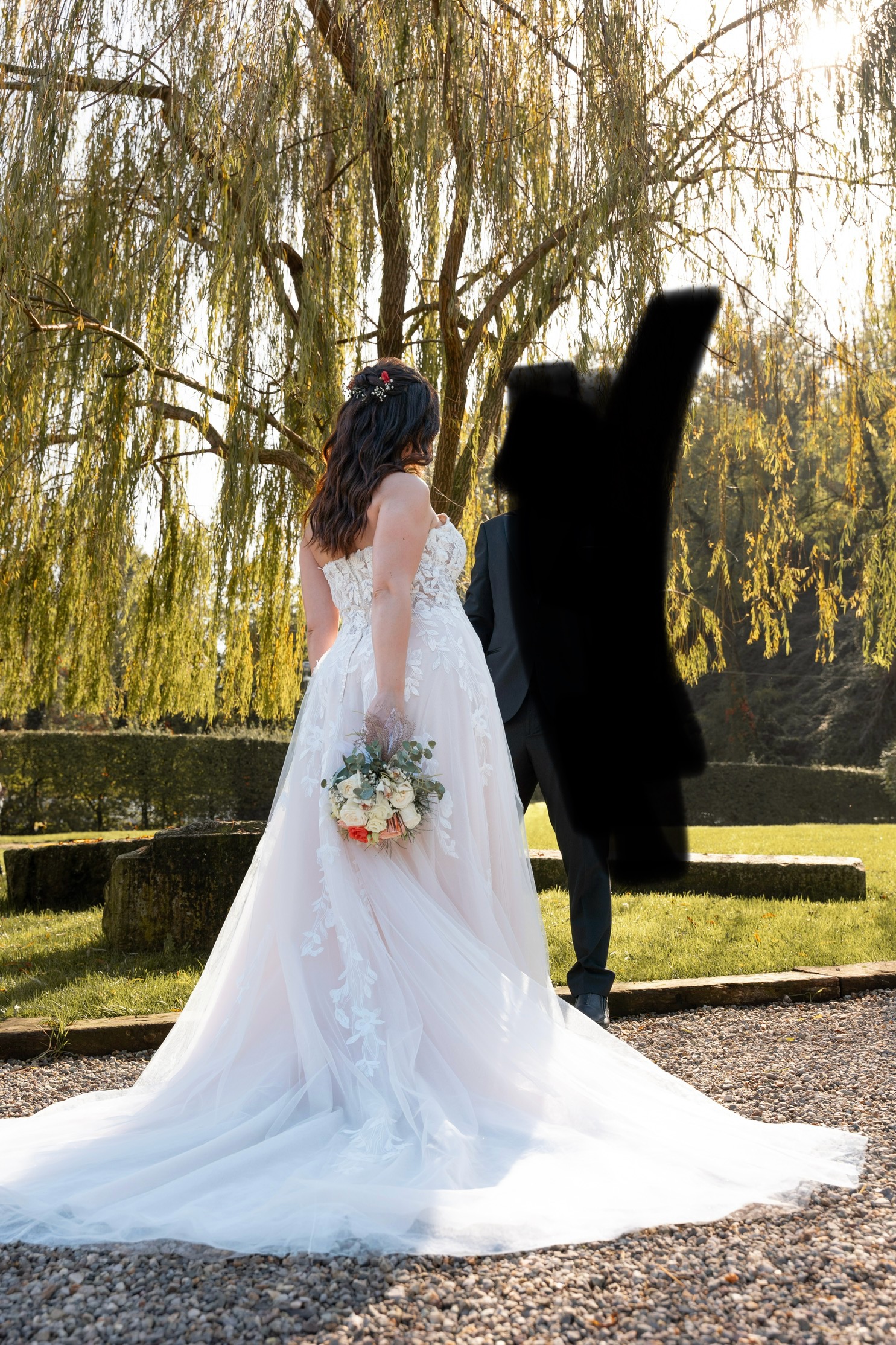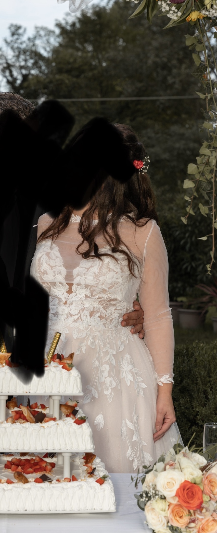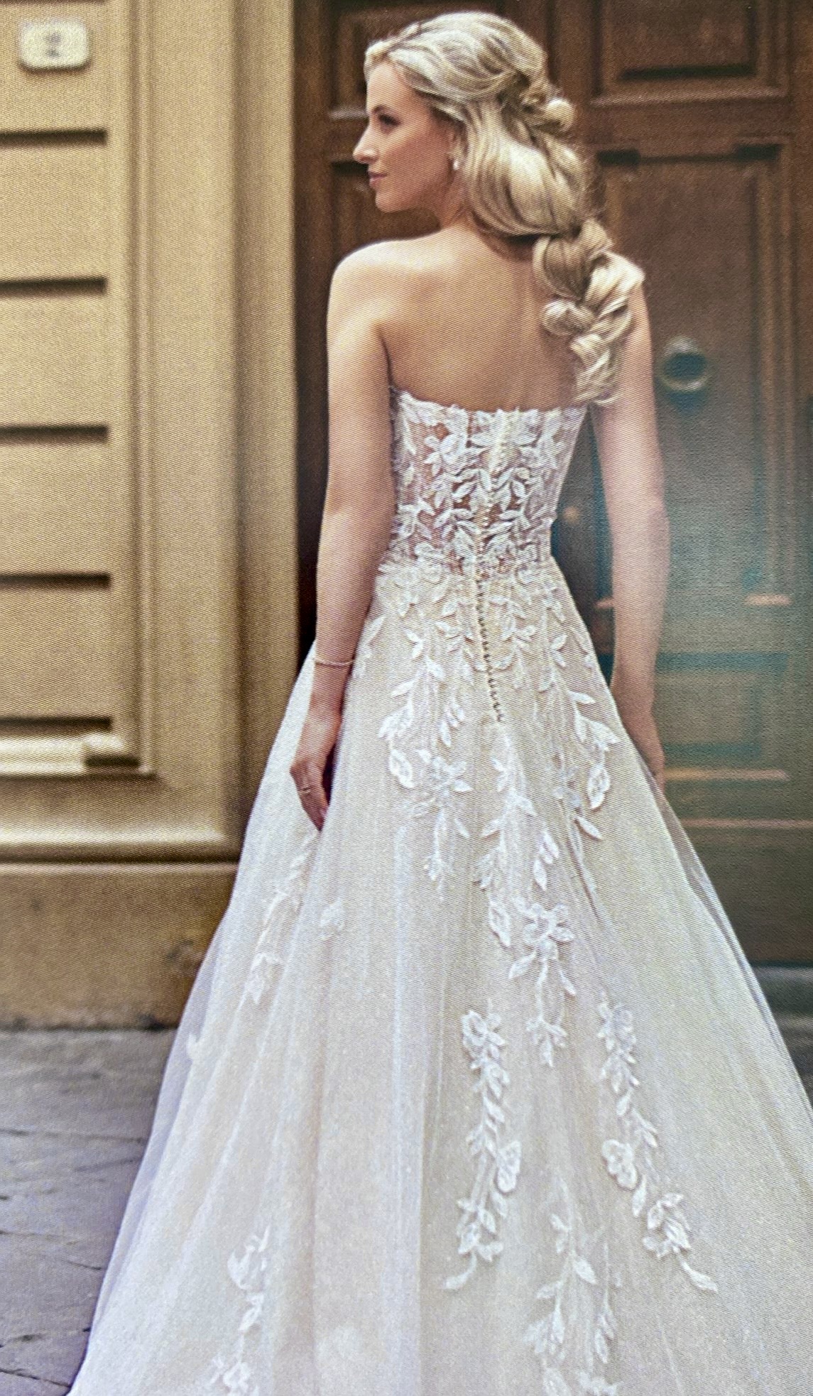 La gonna ampia in tulle, leggera e vaporosa, presenta un lungo strascico che conferisce movimento e raffinatezza all’abito.
