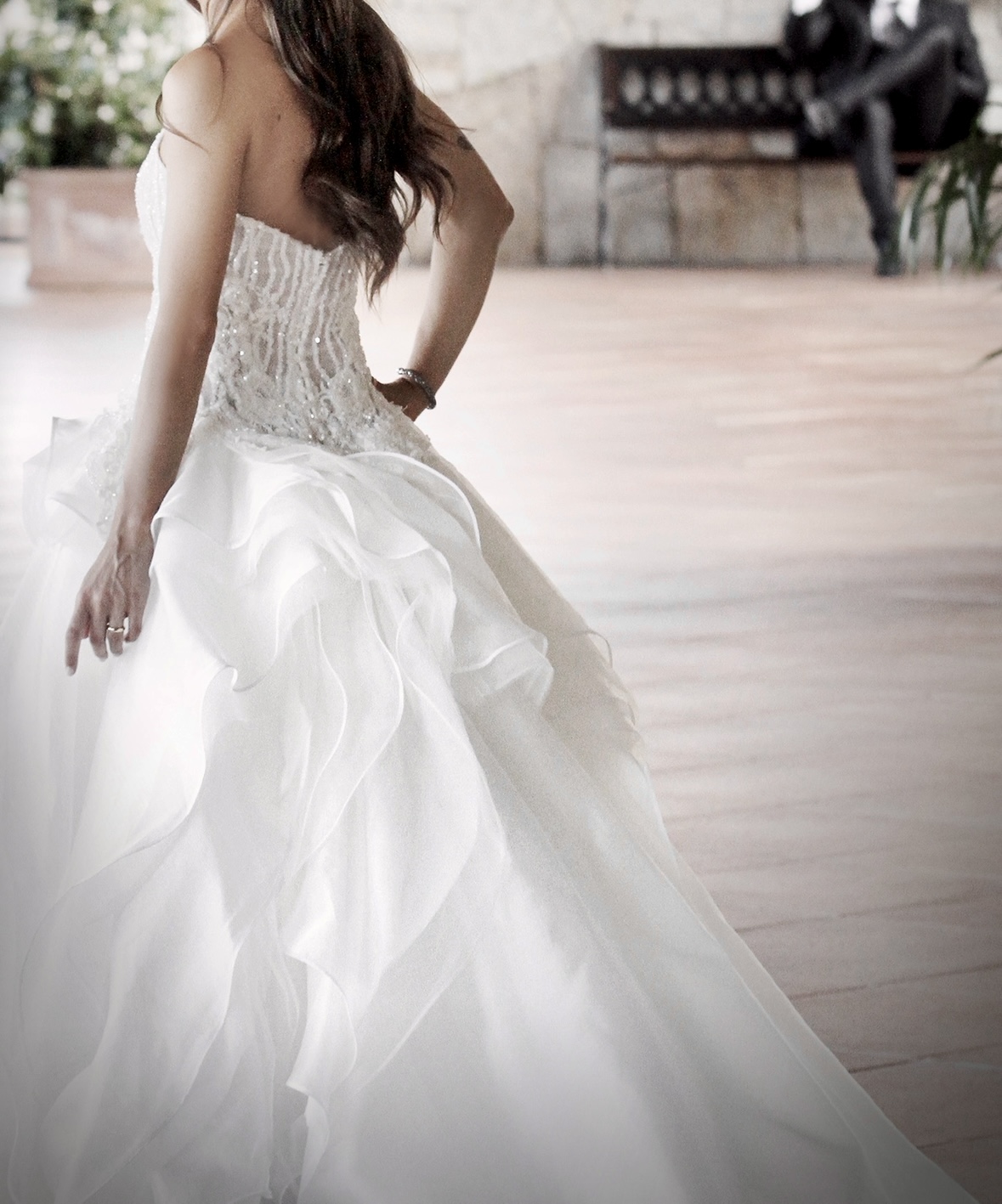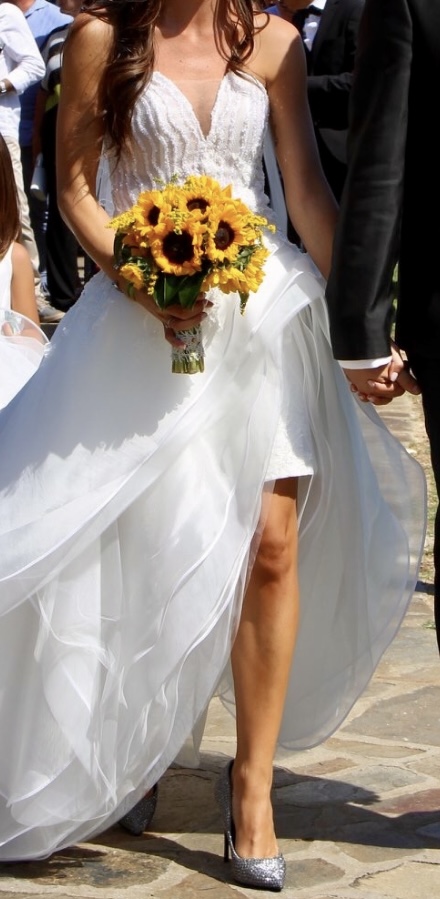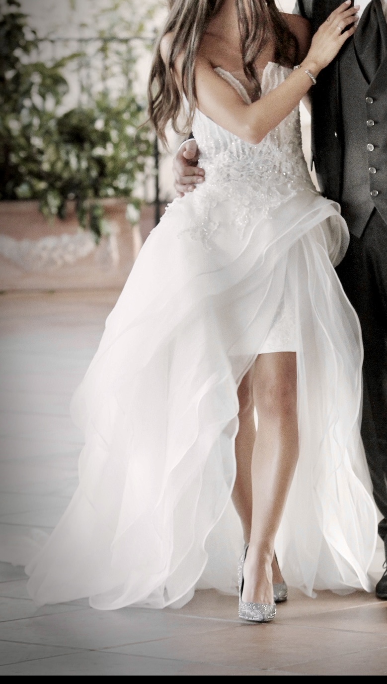 Abito corto davanti con coda lunga dietro molto elegante e particolare con corpetto in Swarovski, trattato benissimo come nuovo.