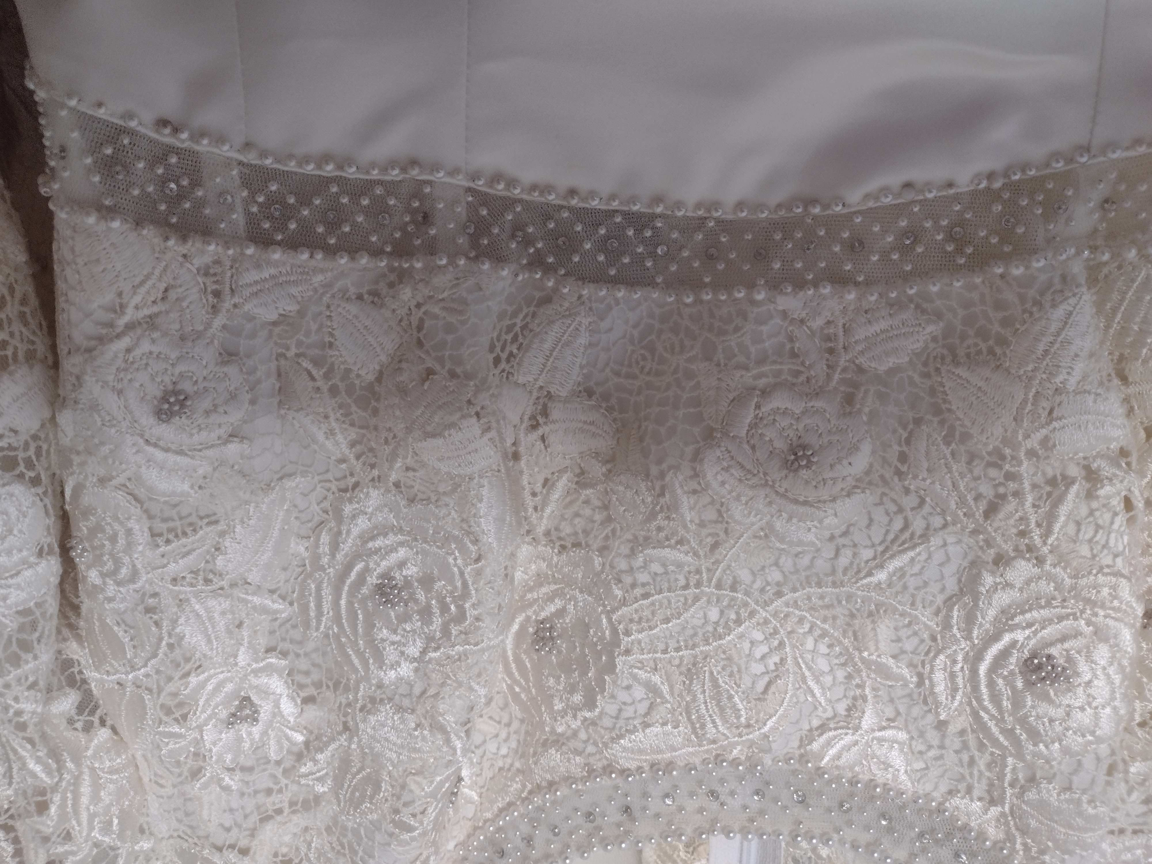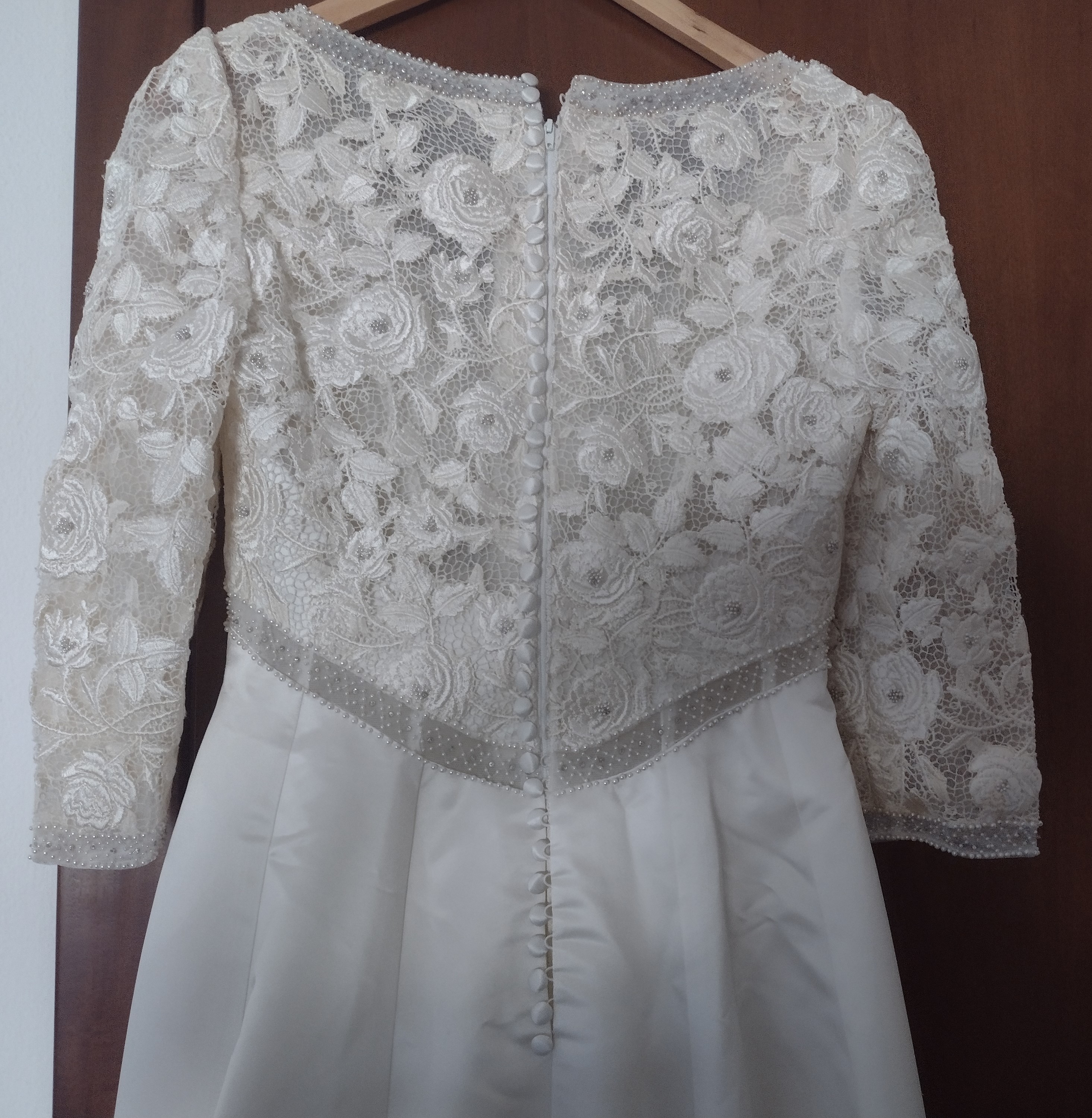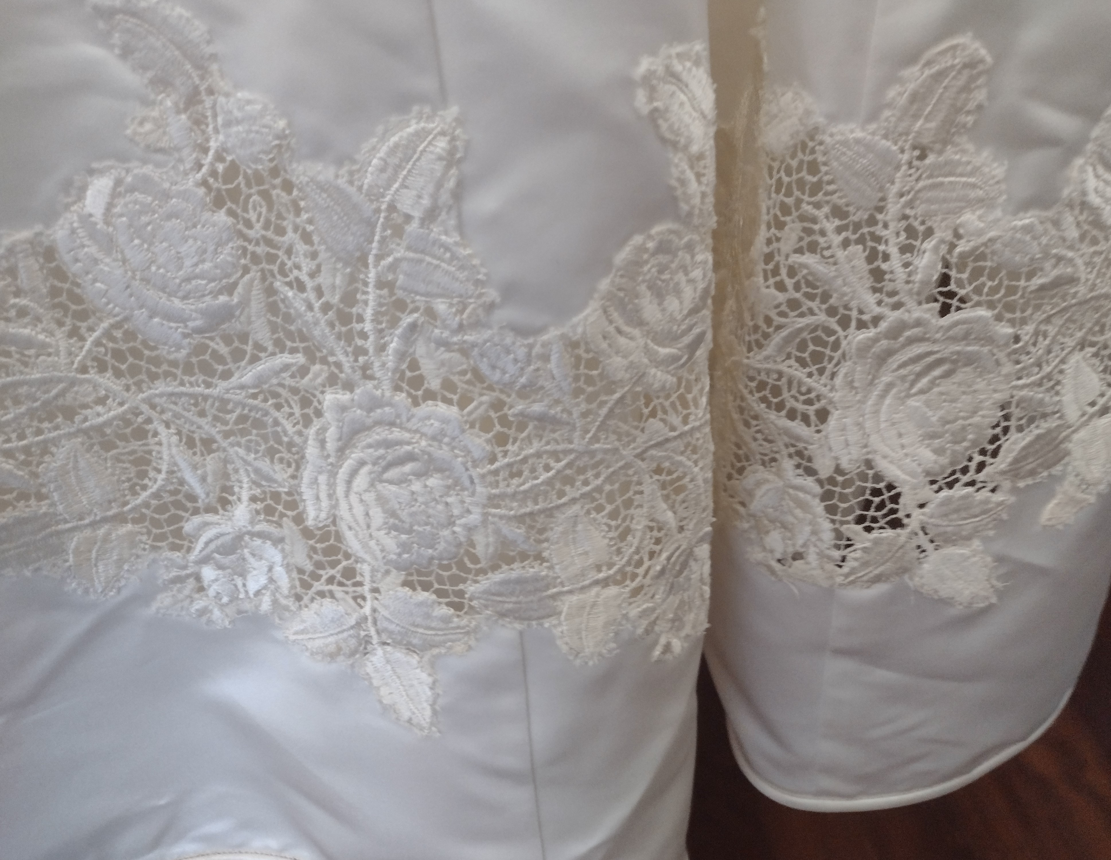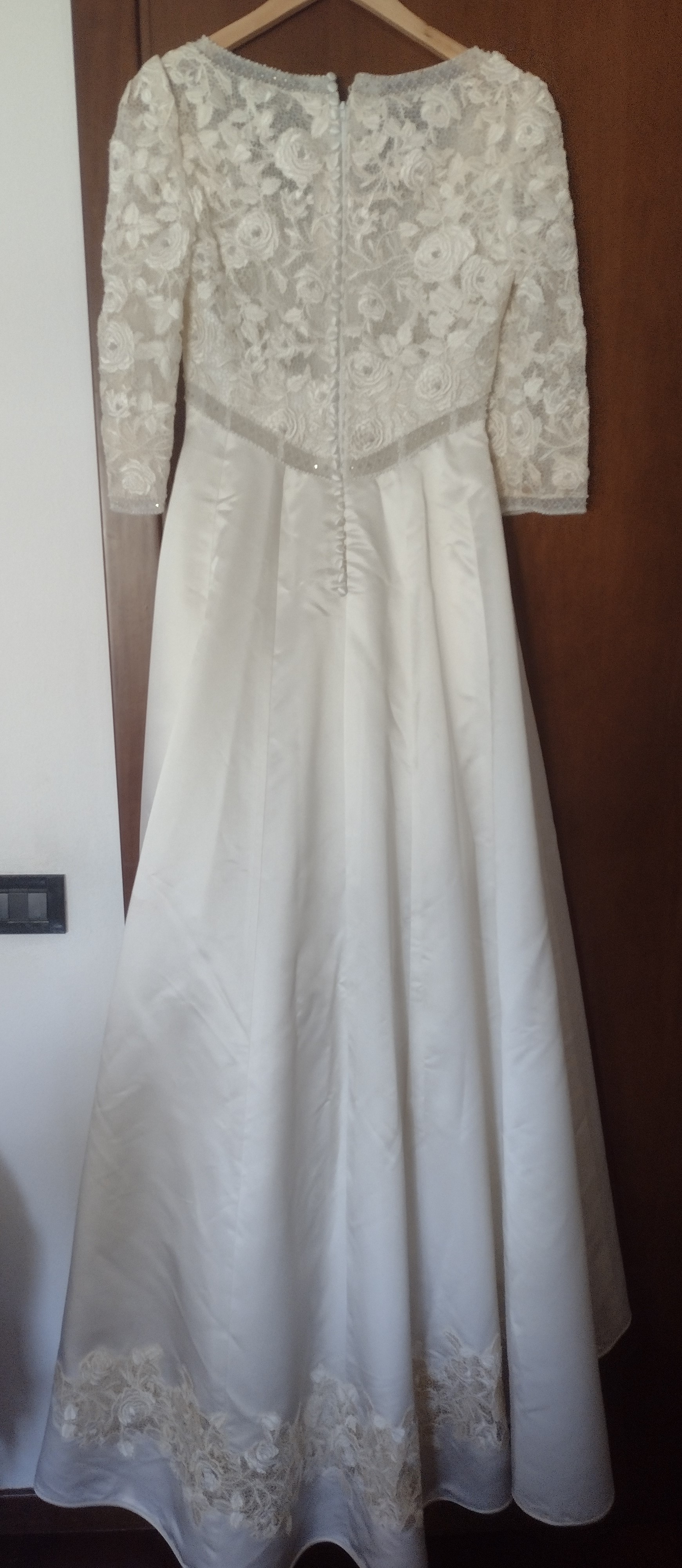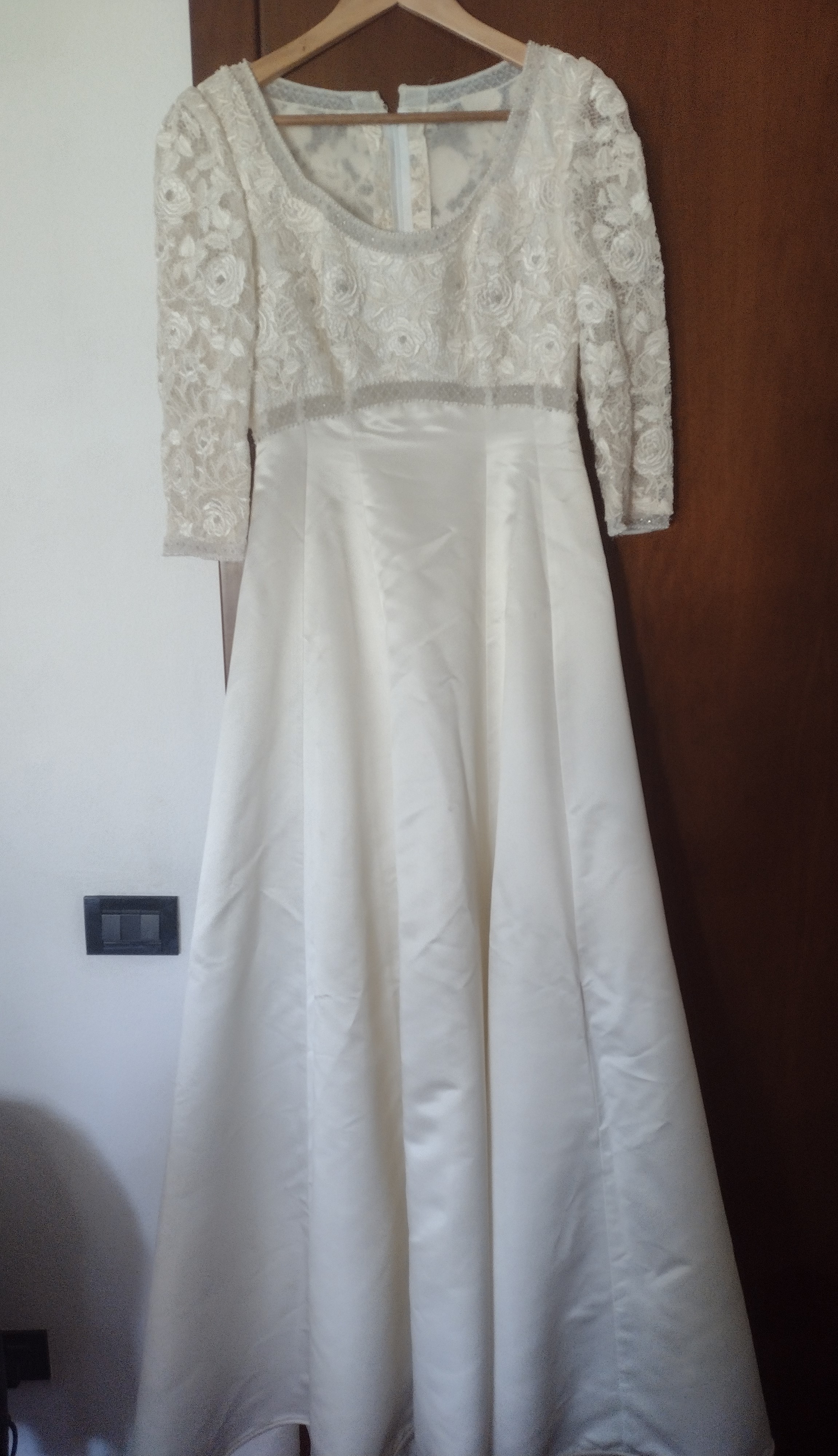 L’abito è in morbido raso color avorio, in stile impero, con corpino e maniche in pizzo macramè; nella parte posteriore è inserito un intarsio in pizzo macramè che richiama quello del corpino. Viene fornito di sottogonna e velo lungo con pettinino, taglia 44 – 46