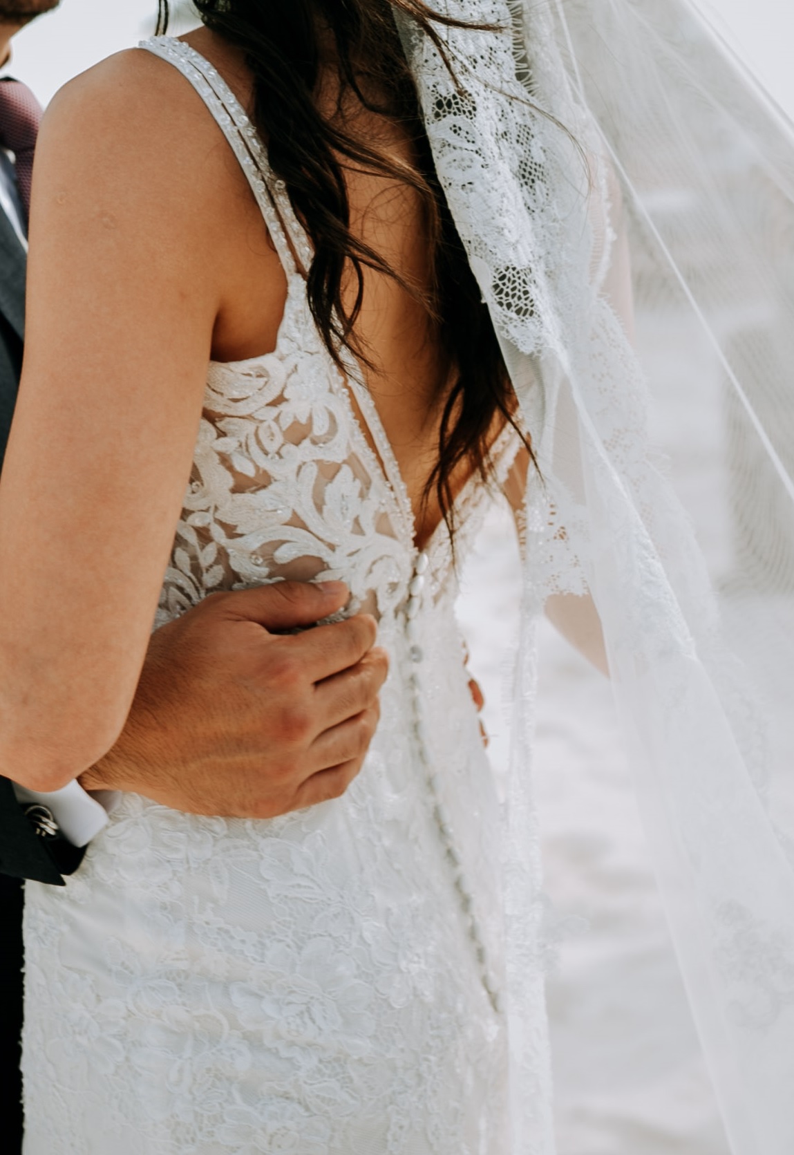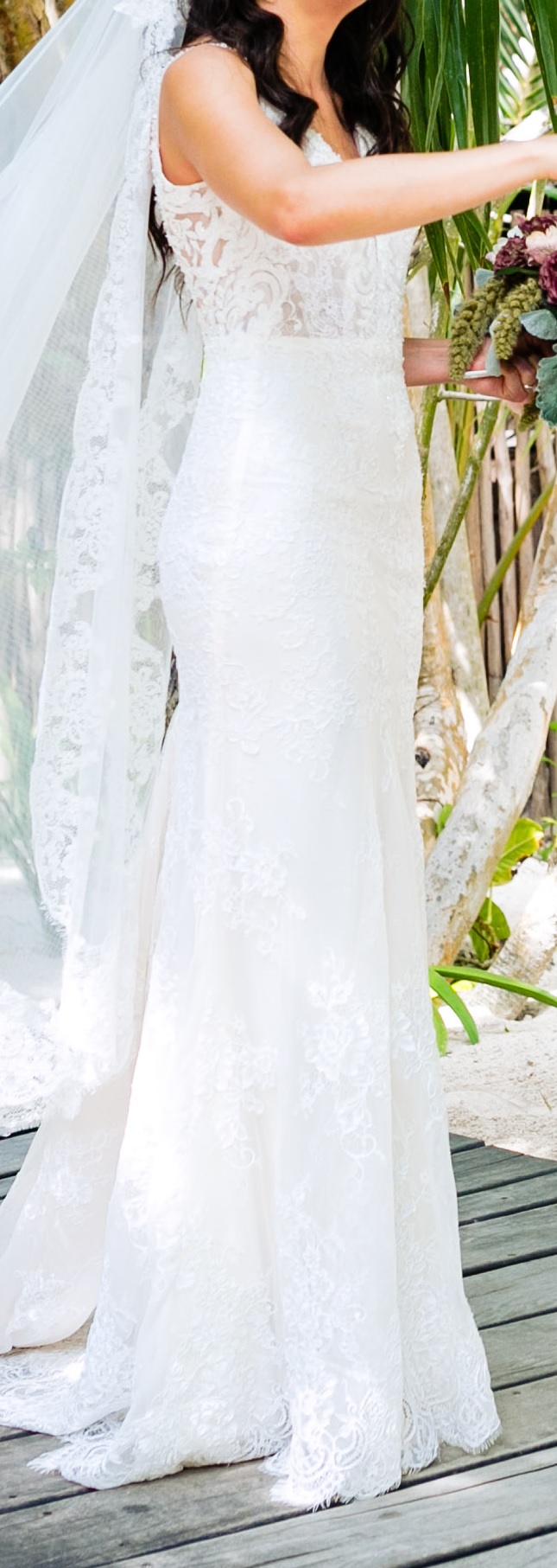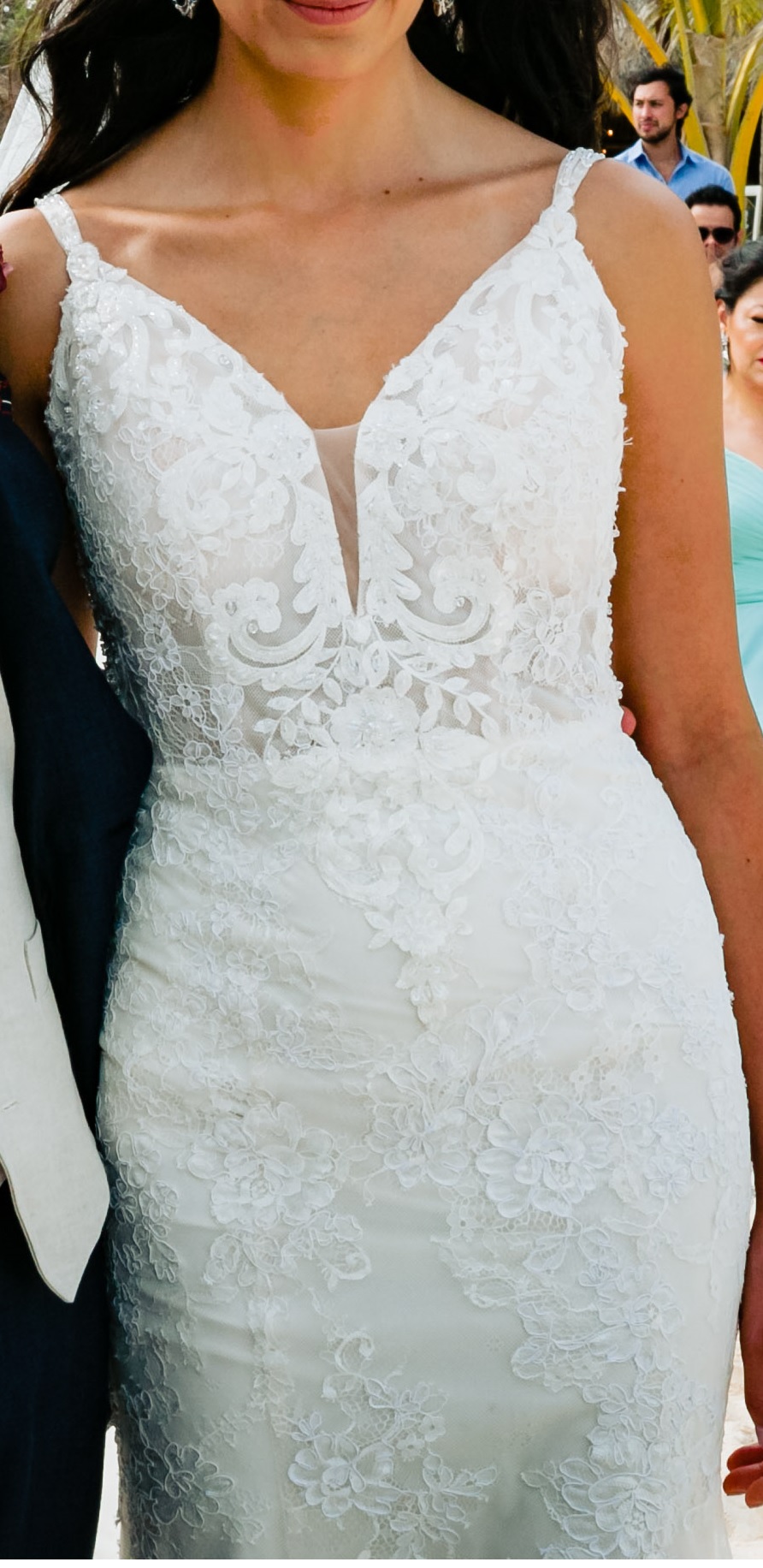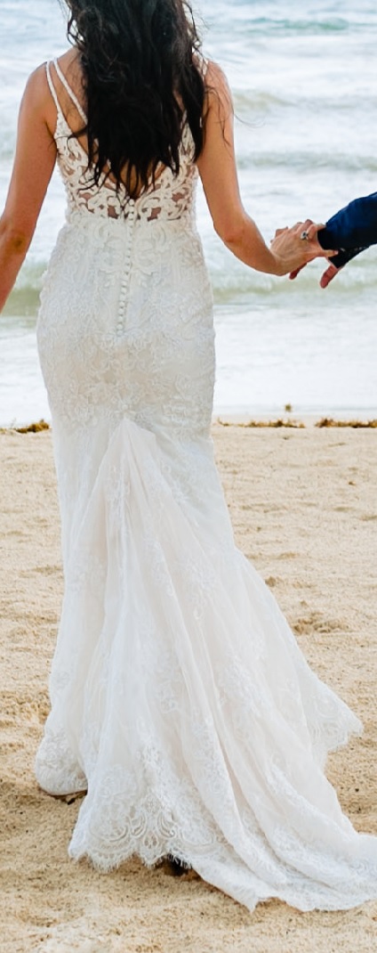 vestido de novia precioso, con escote en la espalda y 2 tiras en V, una ligera transparencia en la parte de arriba y laterales, encaje en todo el vestido y poca pedrería en los tirantes.
