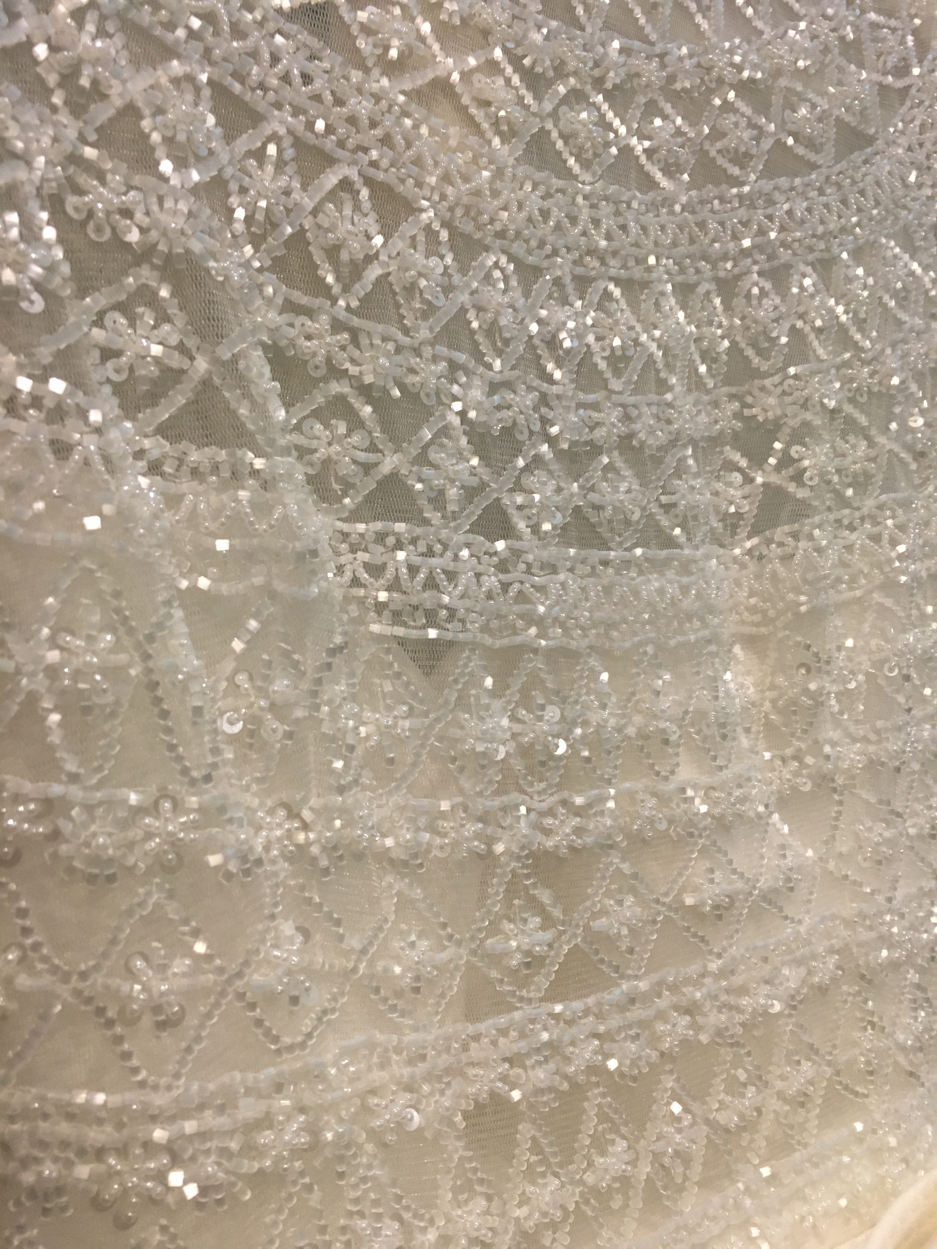La falda es de PIQUÉ y la parte de arriba es de PEDRERÍA fina con un diseño más geométrico.