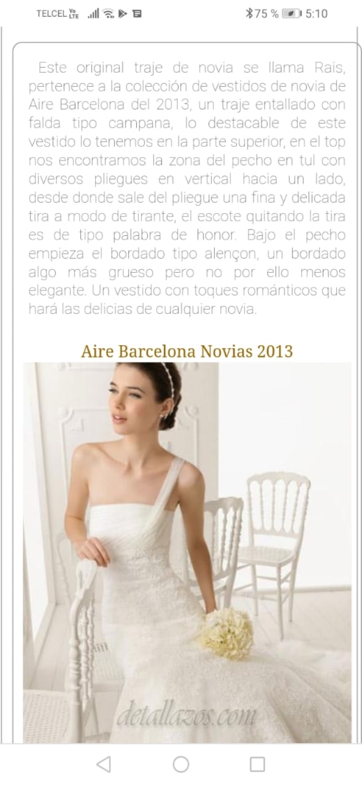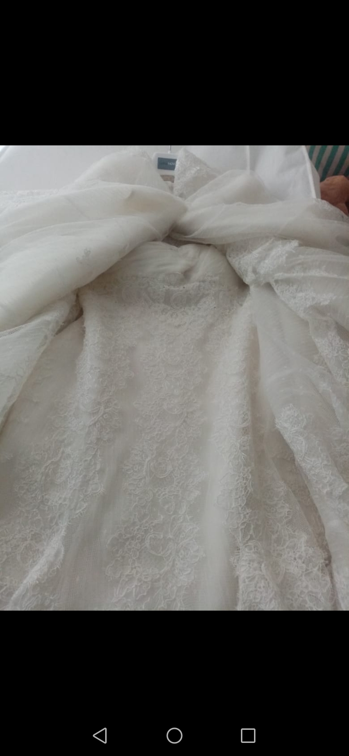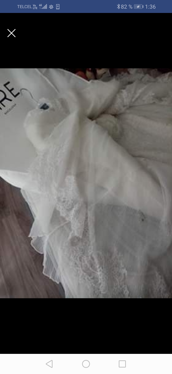 Hermoso vestido talla 32 (la app no me permitía poner la talla verdadera) de la prestigiosa marca Aire Barcelona. Es 100% encaje español, muy cómodo y se ajusta muy bien al cuerpo haciendo una bonita silueta. El estilo es ajustado (tipo sirena) hasta la cadera y después amplio y con vuelo, tiene una larga y bella cauda.
