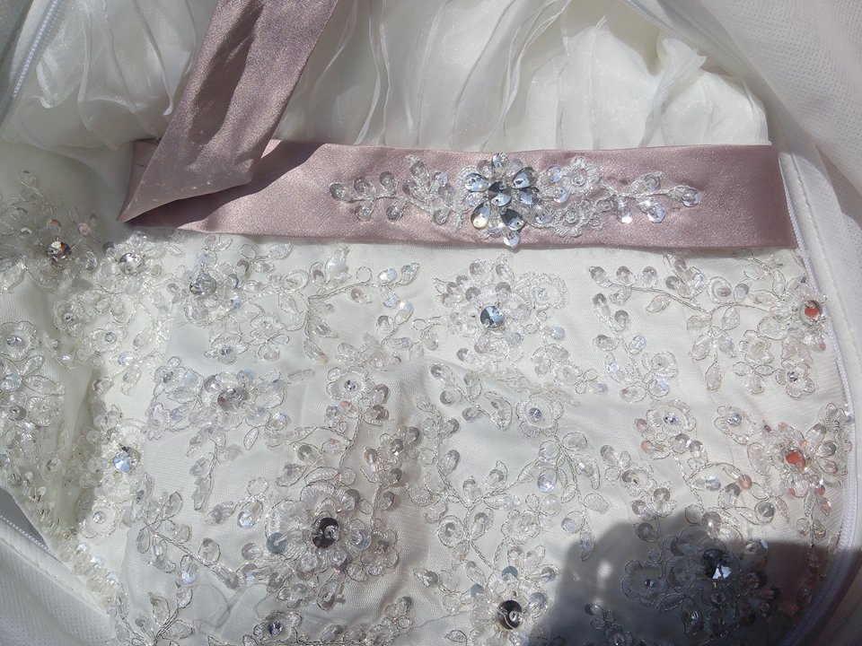 Talla 6 que puede ajustarse a talla 4 por el corset. Caracterizado por el listón palo de rosa satinado con cristales y con corset ajustable.