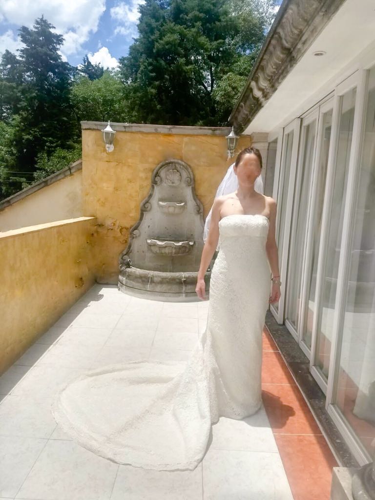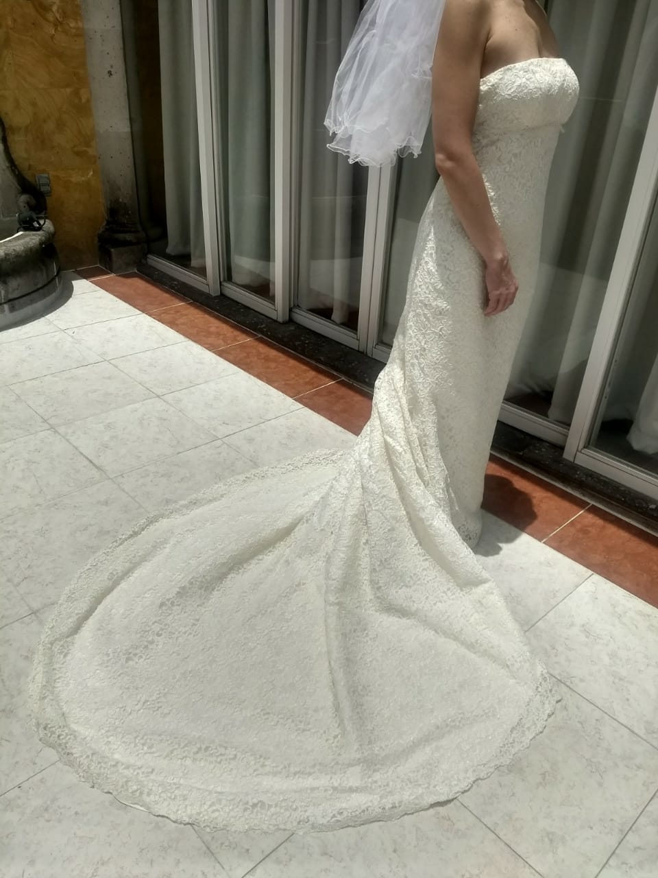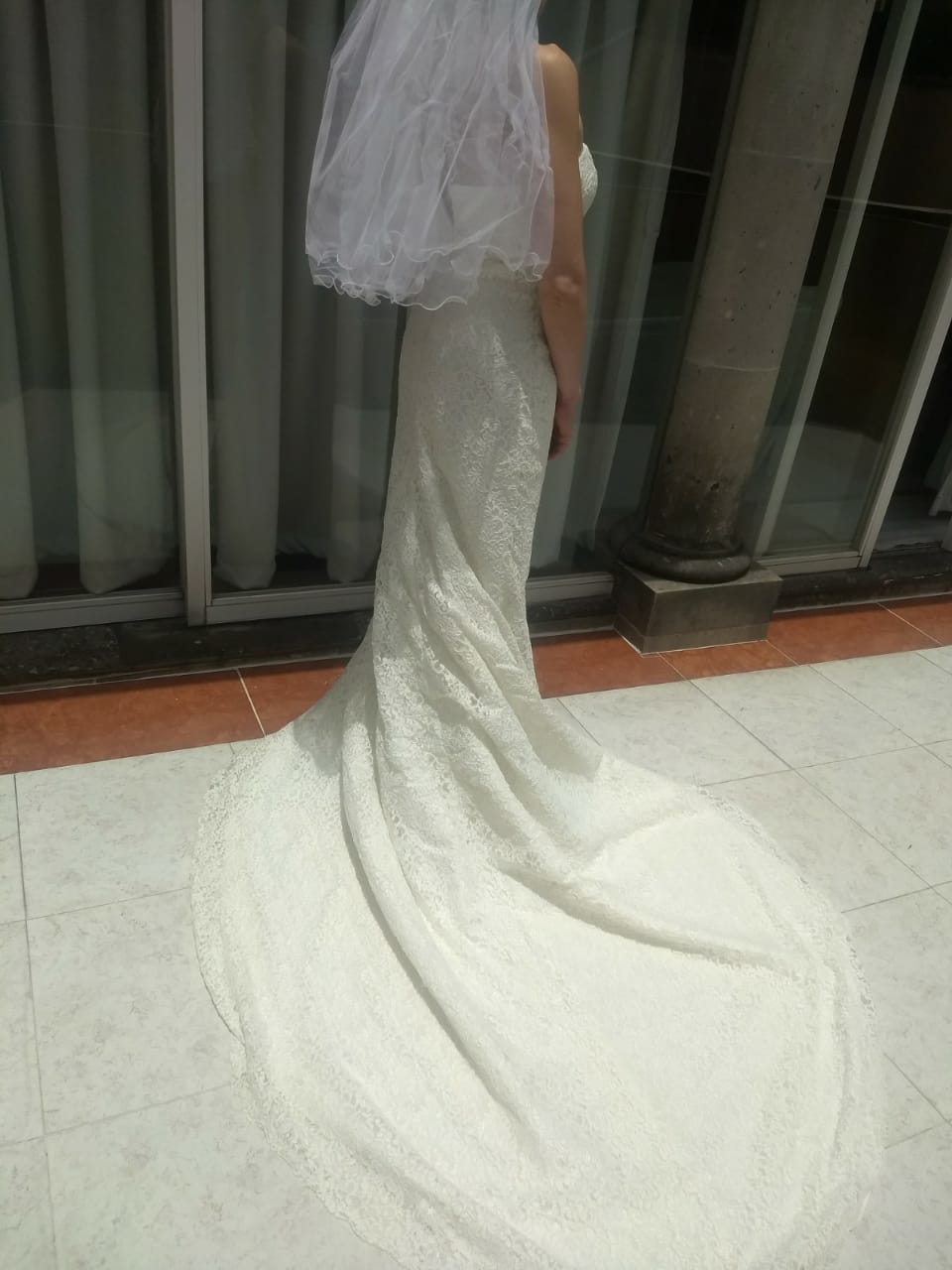 Al vestido se le hicieron pequeños ajustes en el talle pero sigue siendo talla 6. El vestido tiene cola como de 2 mts de largo Incluye un velo que llega como a media espalda. Mido 1.65 m de estatura y use tacon medio. Está guardado en su porta vestido original