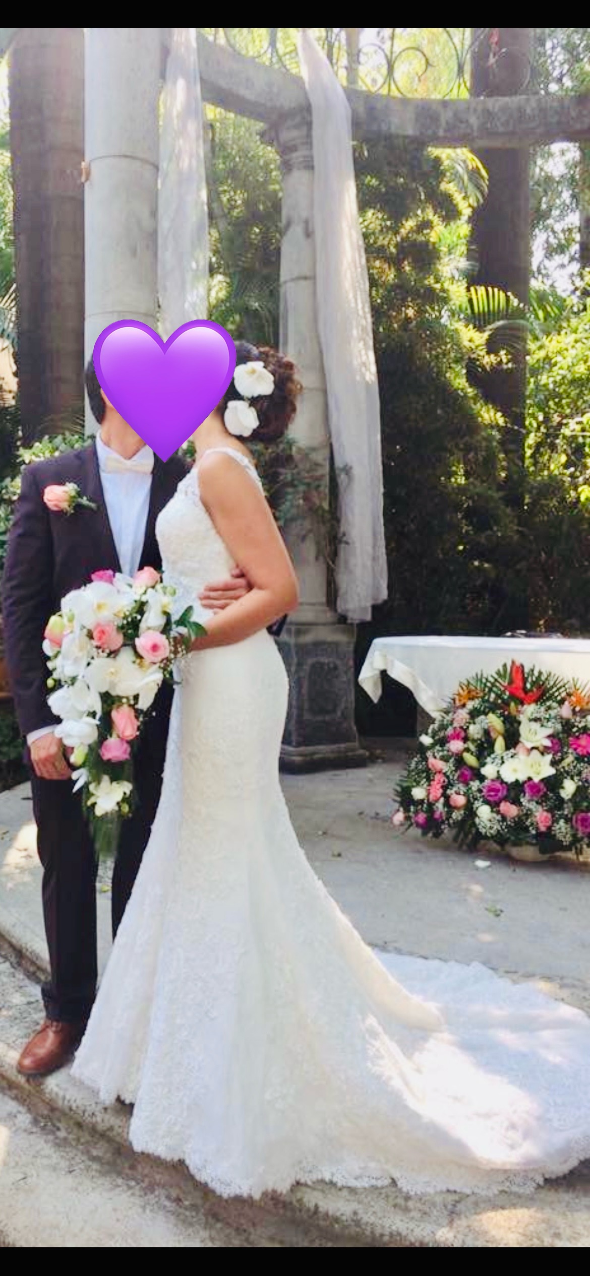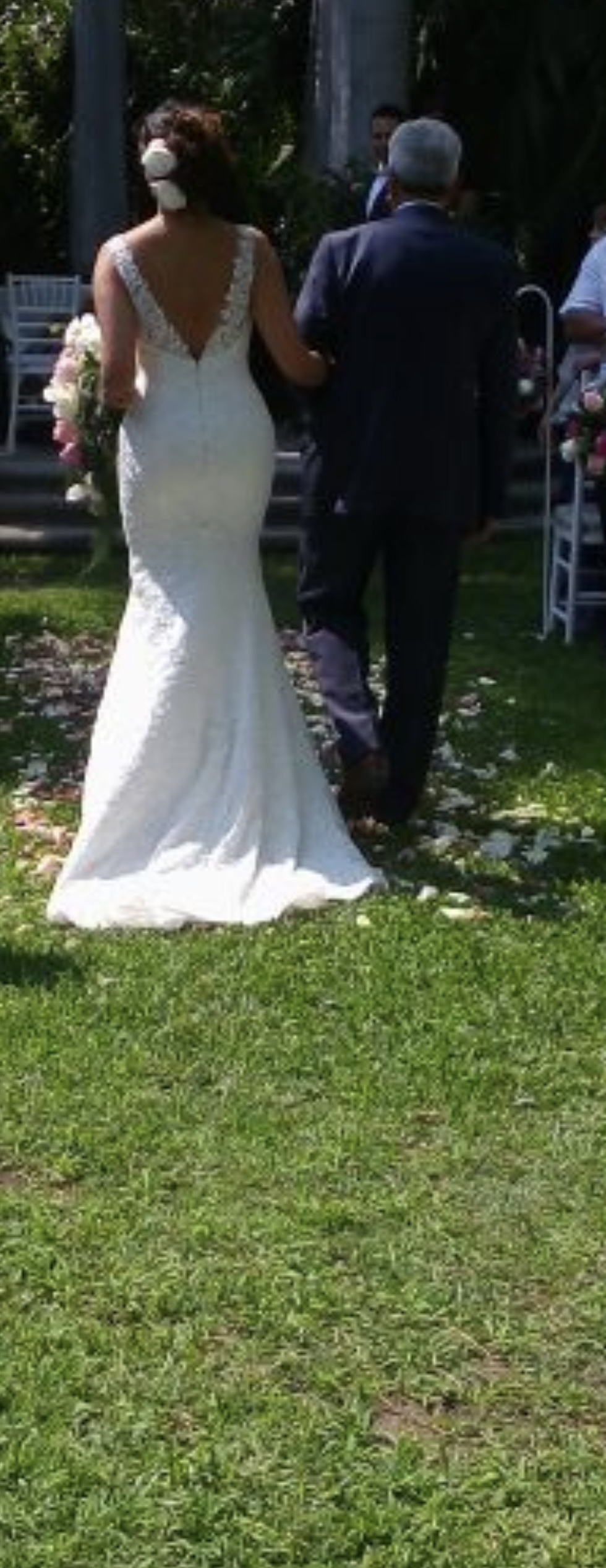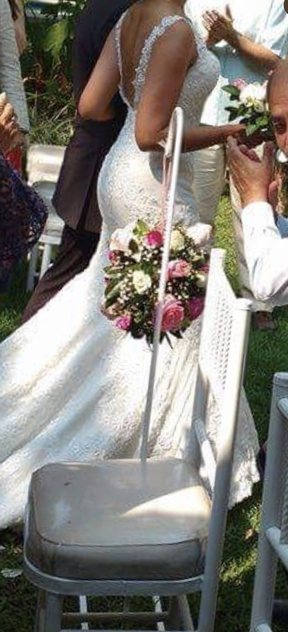 Es un vestido hermoso, con silueta sirena y encaje , una cola con un metro extra. Espalda descubierta en V . Pero ligero . Te hará sentir radiante y hermosa.